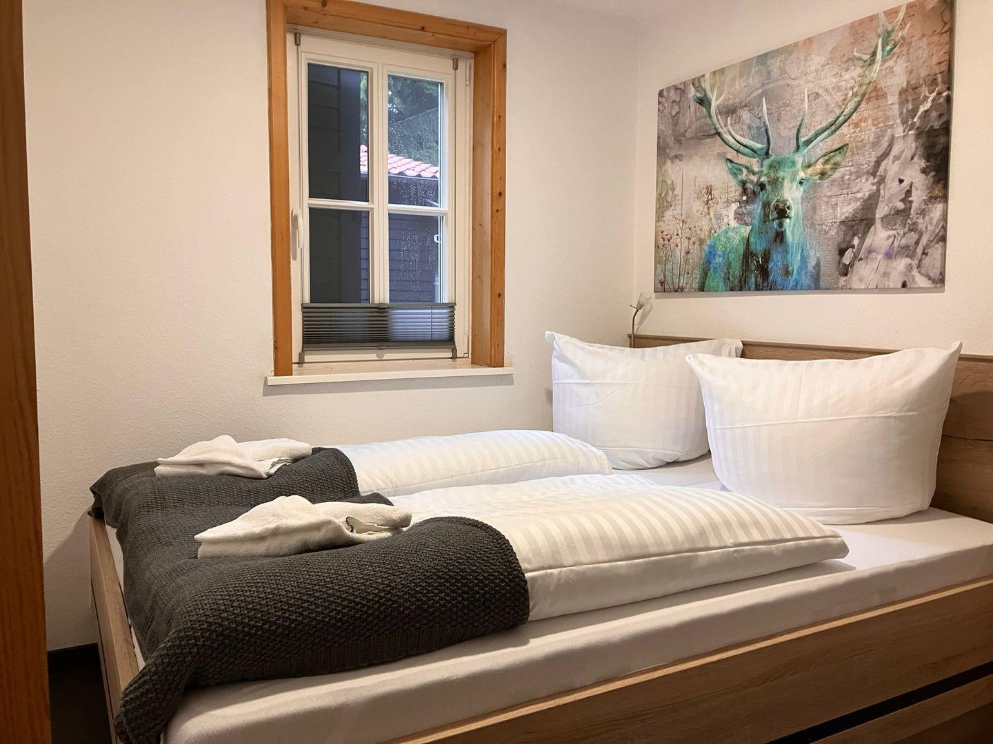 Das hochwertig mit einem Doppelbett möblierte Schlafzimmer lädt zum Kuscheln ein.