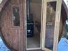 Die Sauna steht als Fass im Garten und hat zwei Liegeflächen. Das Holz dafür bringen Sie bitte selbst mit.