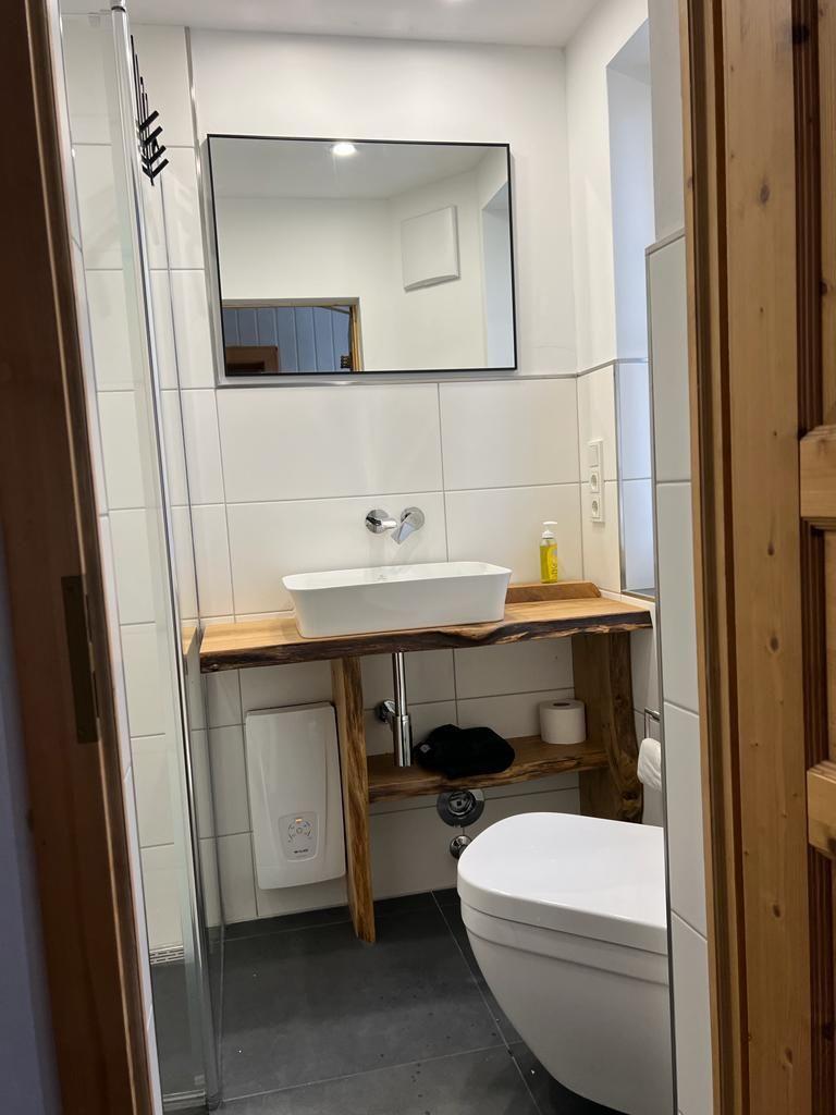 Nach dem entspannenden Saunagang können sie sich im wunderschönen kleinen Bad das Wasser der Urwalddusche auf den Kopf laufen lassen.