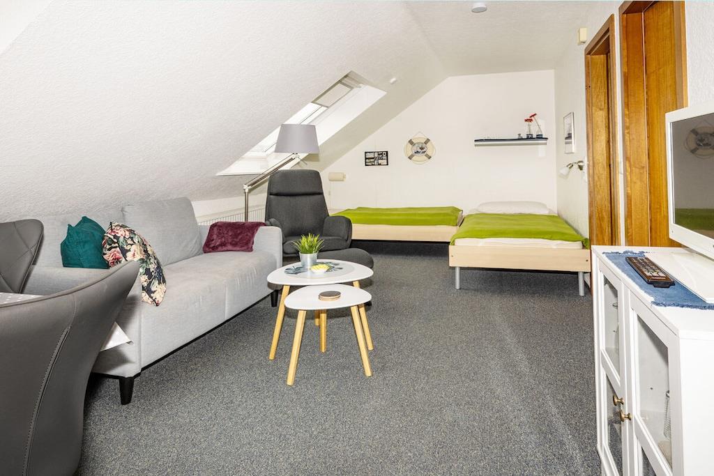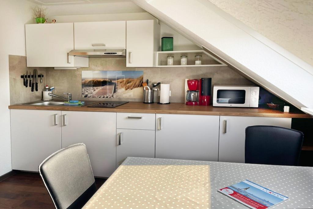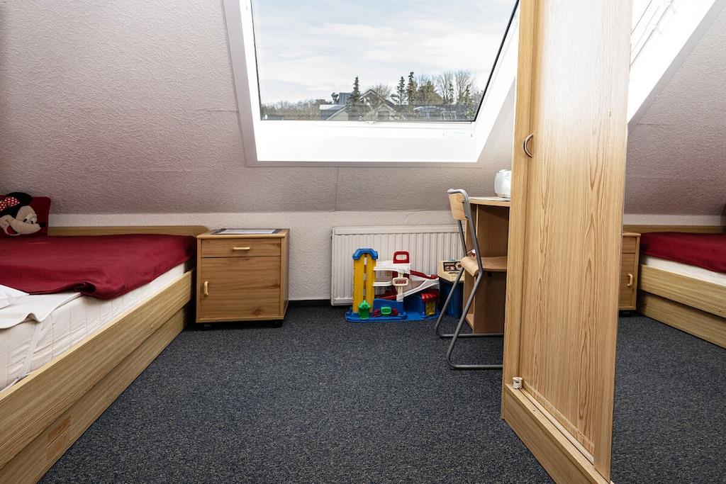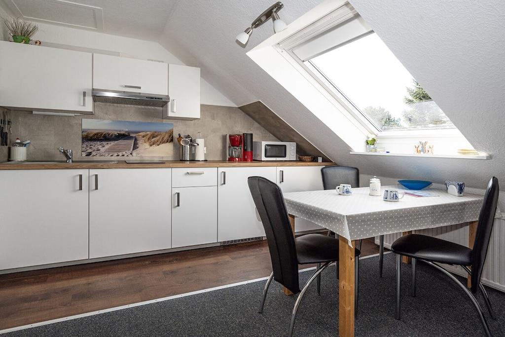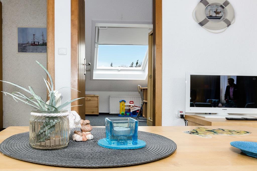 Das Ferienhaus liegt in einer ruhigen Seitenstraße nicht weit vom Strand entfernt. Die Wohnung ist gemütlich und für kleine Familien geeignet. Hat 2 Schlafplätze im Wohn- Ess- Küchenbereich, Küchenzeile, Esstisch, Sofa + ein kleines, separates Schlafzimmer mit einem Bett + Schreibtisch. Bad mit Dusche/WC. Kostenloses Internet. Es gibt einen Sitzplatz im Garten mit Gartenmöbel für diese Wohnung. Dort gibt es auch u.a .eine Sandkiste, Schaukel, Bollerwagen, Grill und Gartenspielzeug. Unser Dachapartment im 2. Stock ist reichhaltig ausgestattet mit Spielen, Büchern, Kabel-TV, Radio,. Eine Waschküche mit Waschmaschine und Trockner ist im Hause. Pkw-Stellplatz vorm Haus. 2 weiter 3-Zimmer-Wohnung sind noch im Haus für 4 bzw. 5 Personen