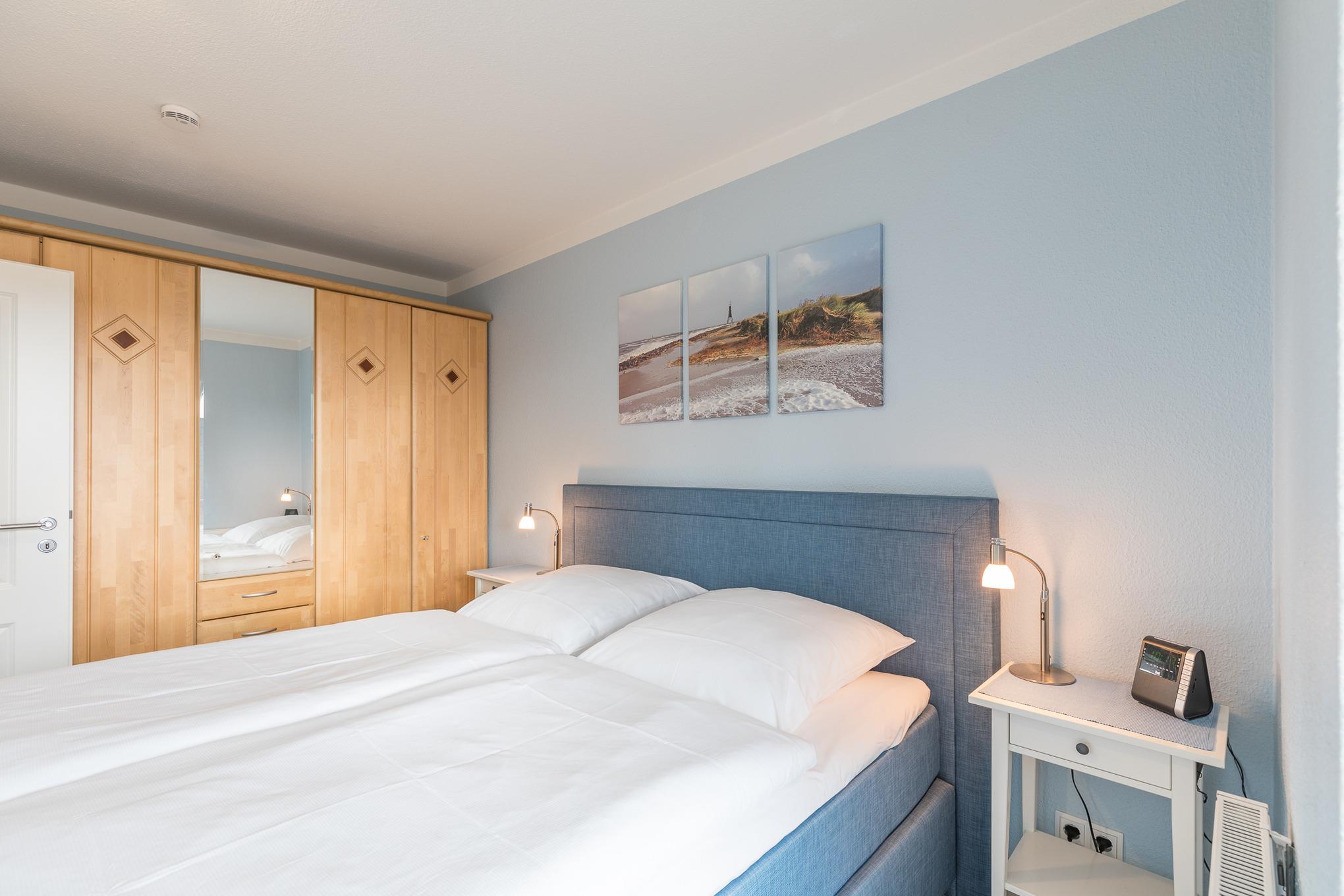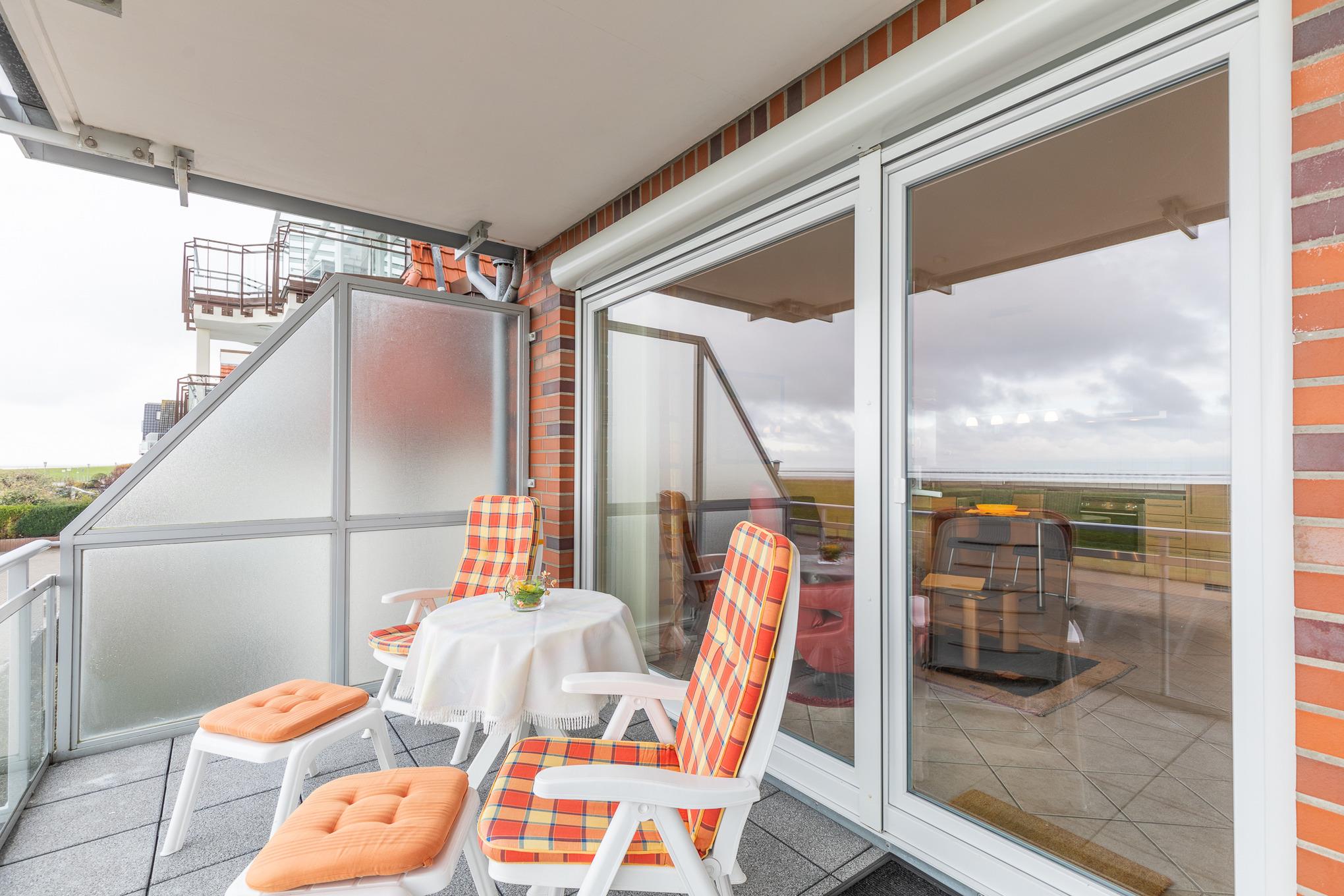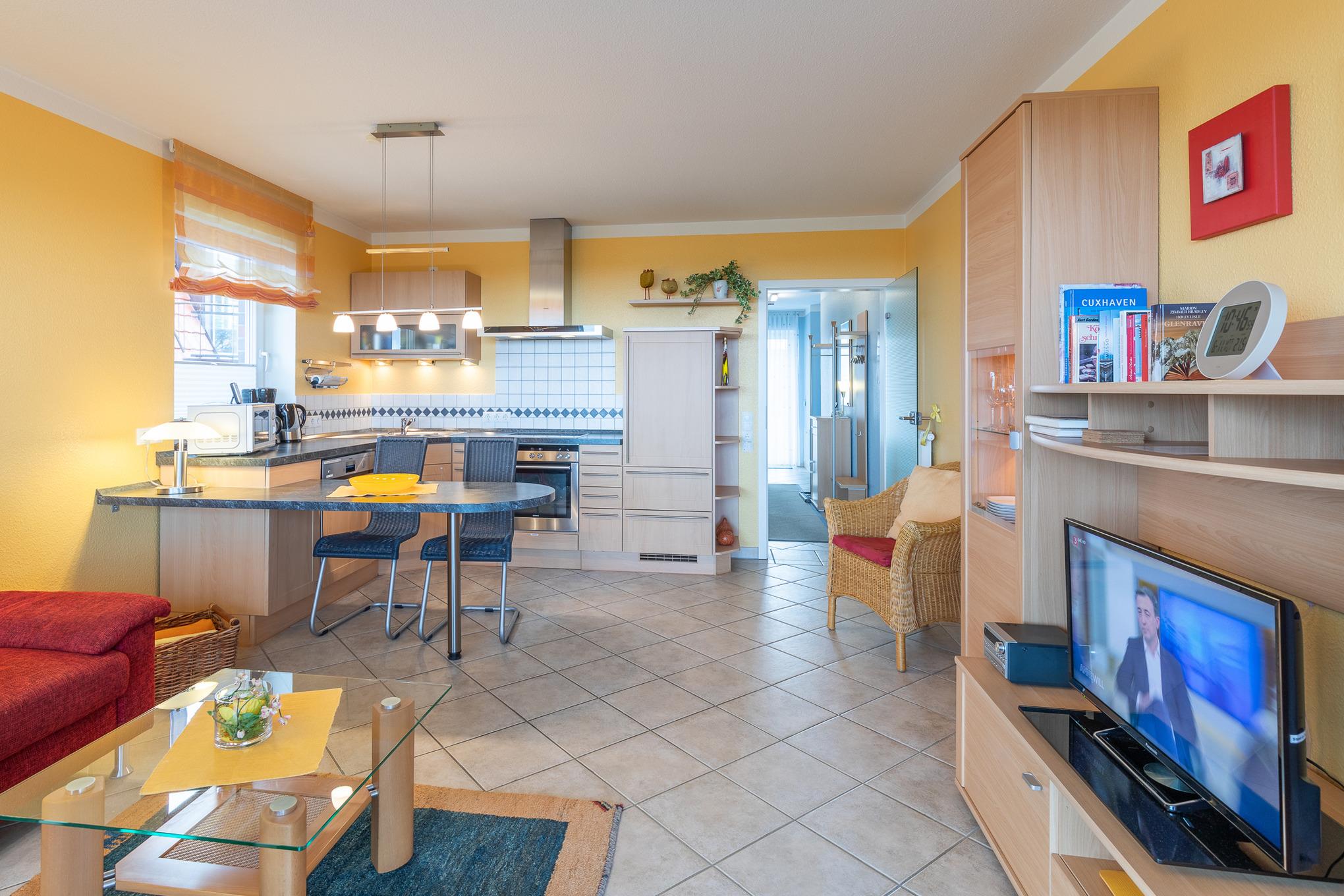 Schöne 2 Raum Wohnung mit einer Größe von ca. 55 m² Wohnfläche im 1. OG (Fahrstuhl im Haus), ist komplett für bis zu 2 Personen ausgestattet. 1 Schlafzimmer mit Box Springbett (180x200cm) und großem Kleiderschrank (mit elektrischen Aussenrollos am Fenster), großzügiges Wohnzimmer mit Einbauküche (Geschirrspüler, Ceranfeld, Backofen, Mikrowelle, Kühlschrank mit Gefrierfach, Wasserkocher, Toaster und Kaffeemaschine), Essplatz mit Blick auf die Nordsee,[nbsp][nbsp]gemütliches Sofa, Relax Sessel und Flatscreen TV, Tageslichtbad mit Dusche (niedriger Einstieg), WC und Handtuchheizkörper. Die Wohnung verfügt über 2 Balkone. Auf dem hinteren Balkon, den Sie vom Schlafzimmer oder Flur aus erreichen können, haben Sie die Morgensonne bis ca. 14.00 Uhr (dieser Balkon verfügt über eine elektrische Markise), vom vorderen Balkon aus haben Sie direkten Blick auf die Nordsee, das Wattenmeer und die Insel Neuwerk, ab ca. 16.00 Uhr kann man dort auch die Sonne genießen. Die Balkone sind mit Balkonmöbeln ausgestattet.