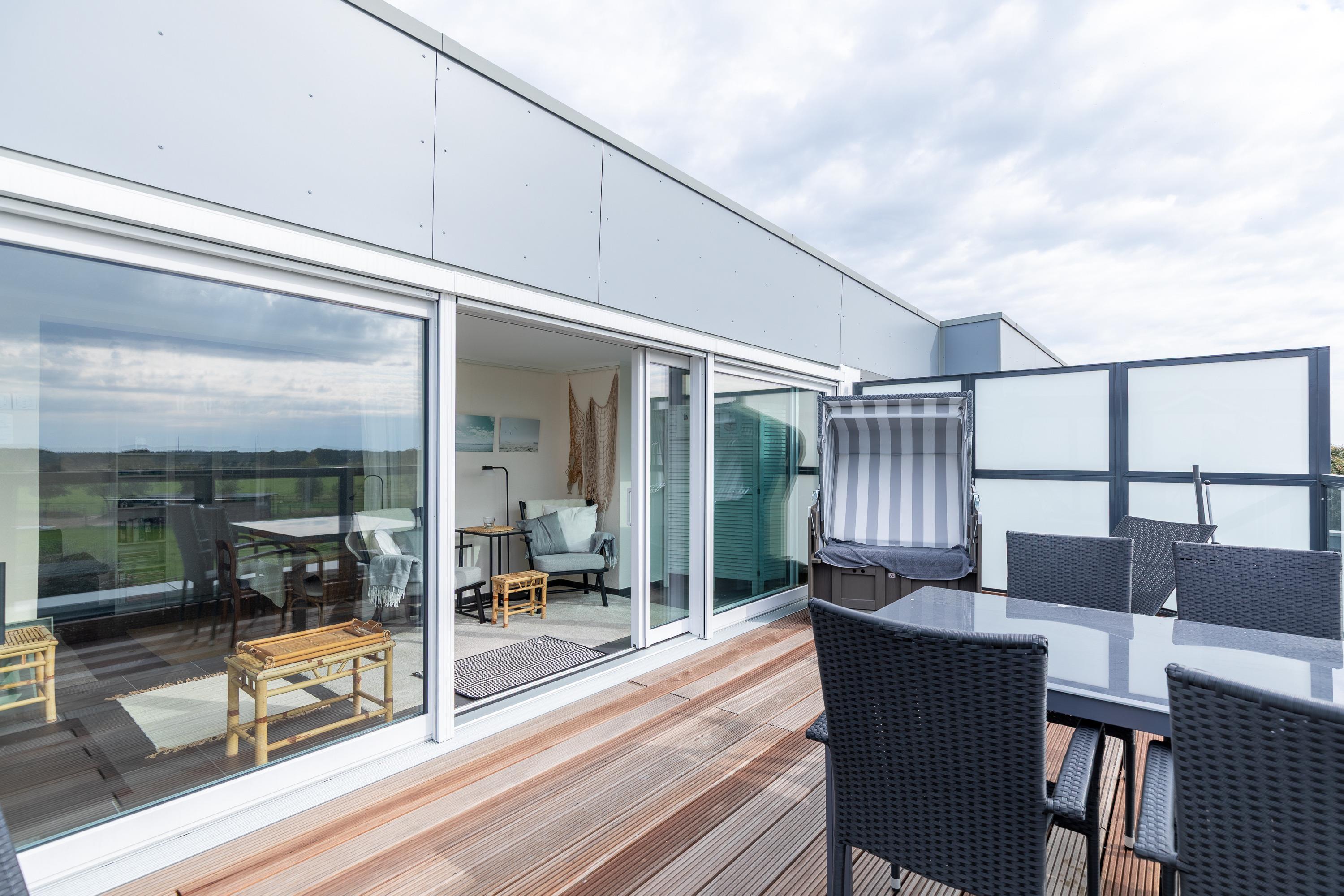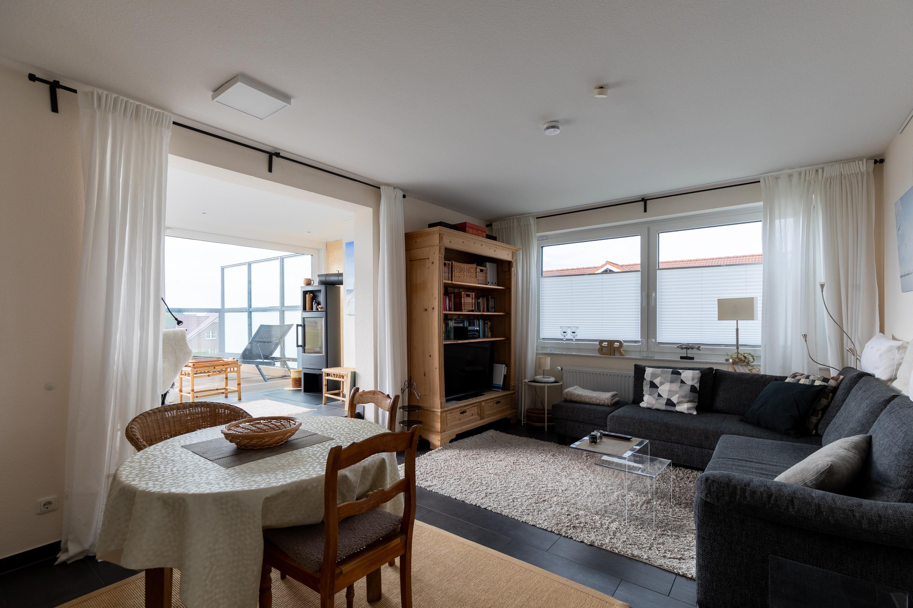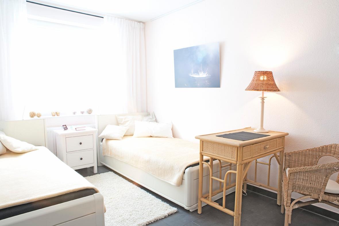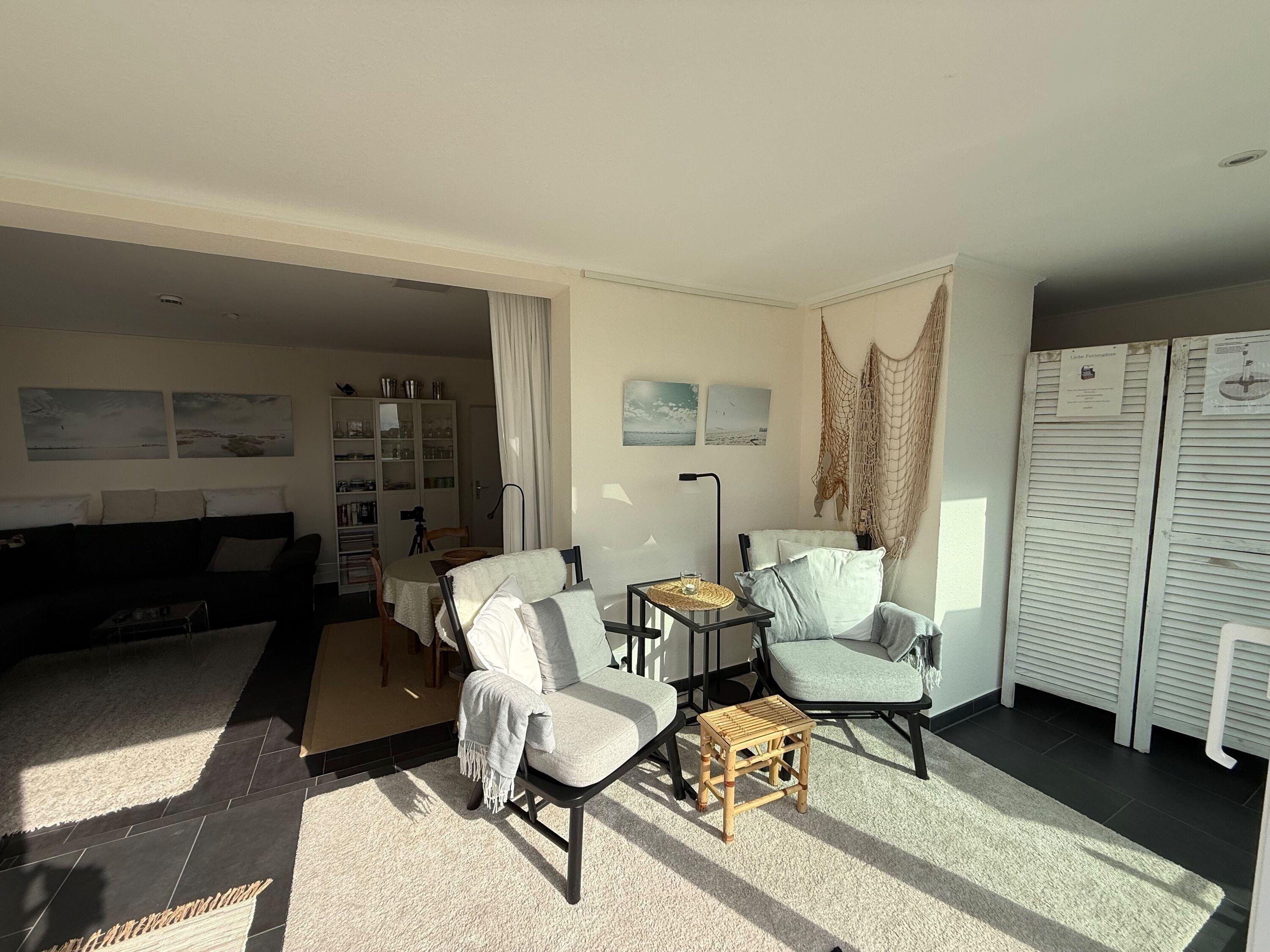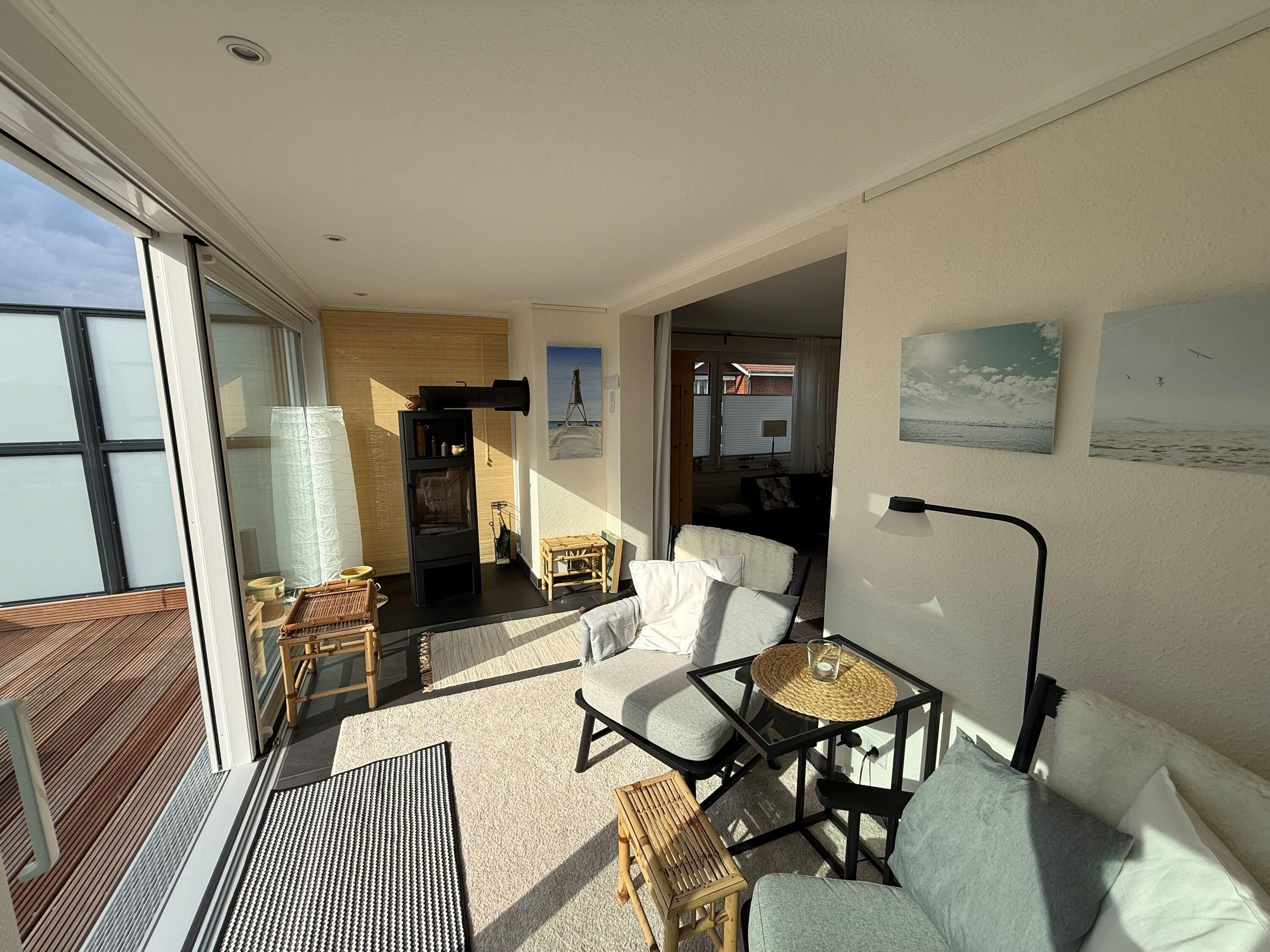 Die modern eingerichtete Wohnung (ca. 62m²) ist für bis zu 2 Personen ausgestattet. 1 Schlafzimmer mit 2 Einzelbetten und TV, Wohnzimmer mit gemütlichem Ecksofa, Flatscreen TV, Mini Stereoanlage, Essplatz mit 4 Stühlen und Zugang zum Wintergarten mit Kamin und großer Dachterrasse (mit Strandkorb, Liegen und Stühlen), Küchenzeile (Ceranfeld, Mikrowelle, Kaffeemaschine, Wasserkocher, Toaster, Geschirrspüler), 1 Bad mit ebenerdiger Dusche und WC, Flur, PKW-Stellplatz am Haus, Nichtraucher, es sind keine Tiere erlaubt.