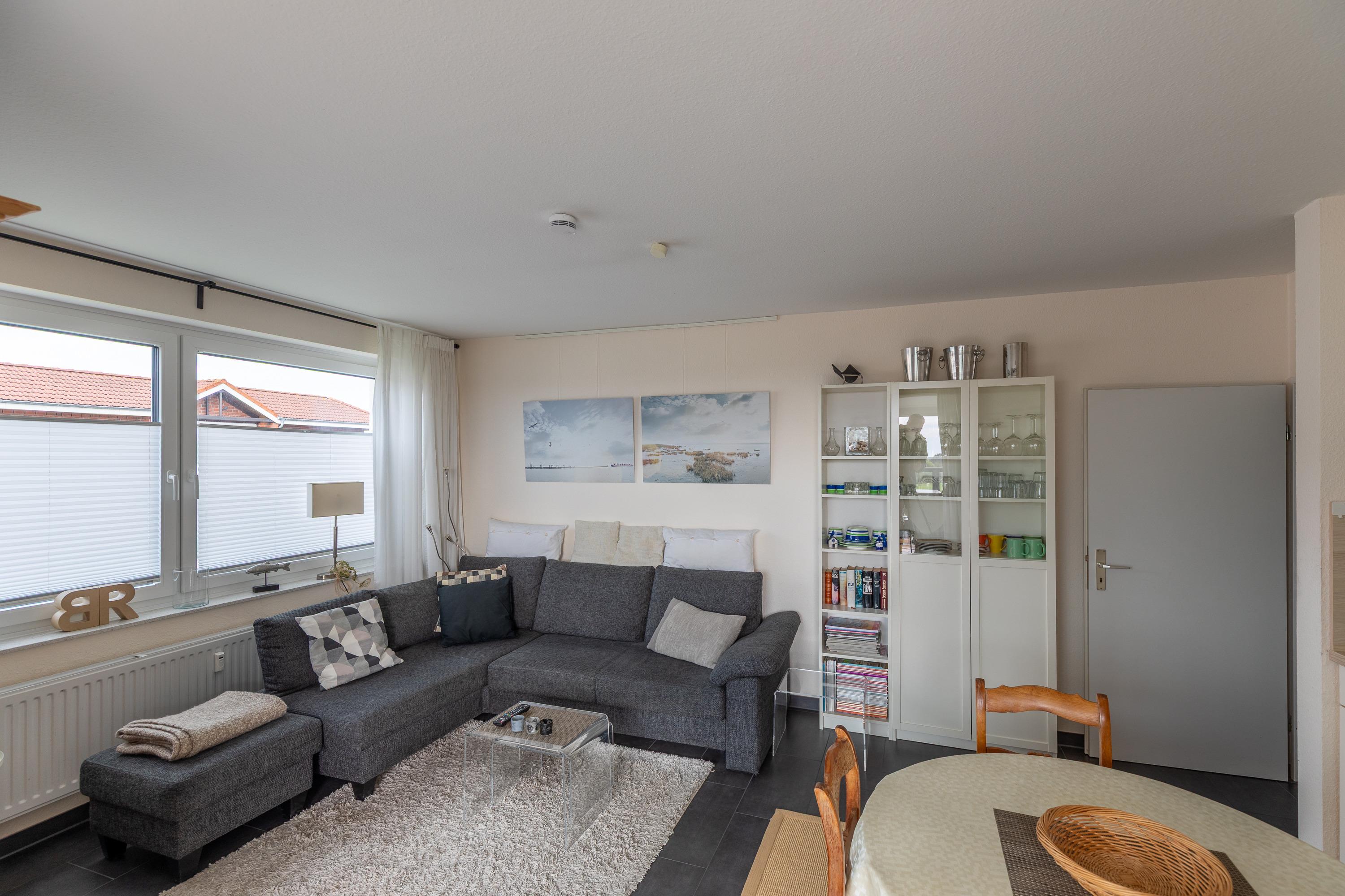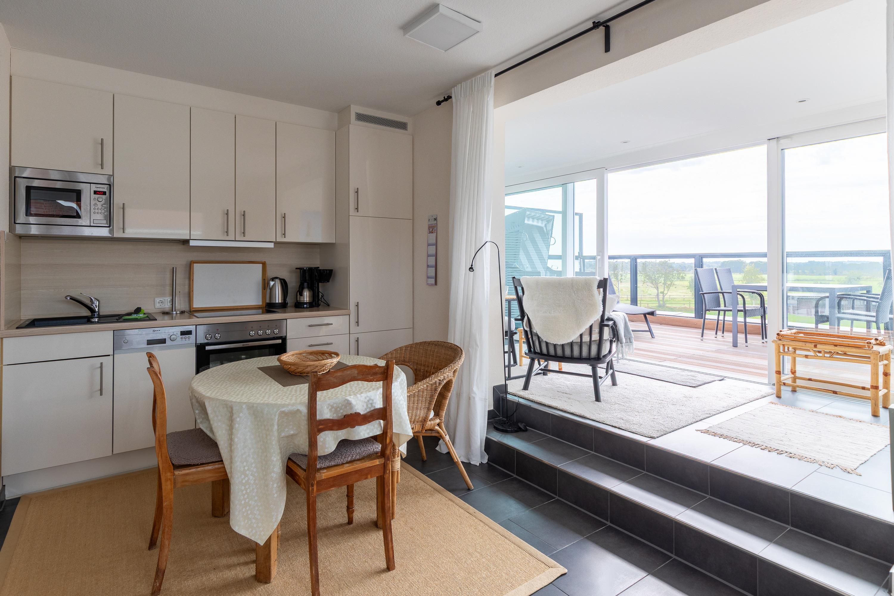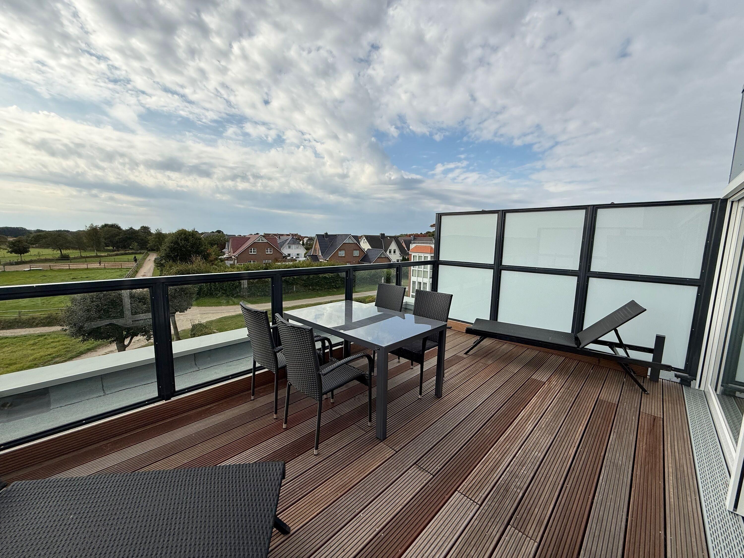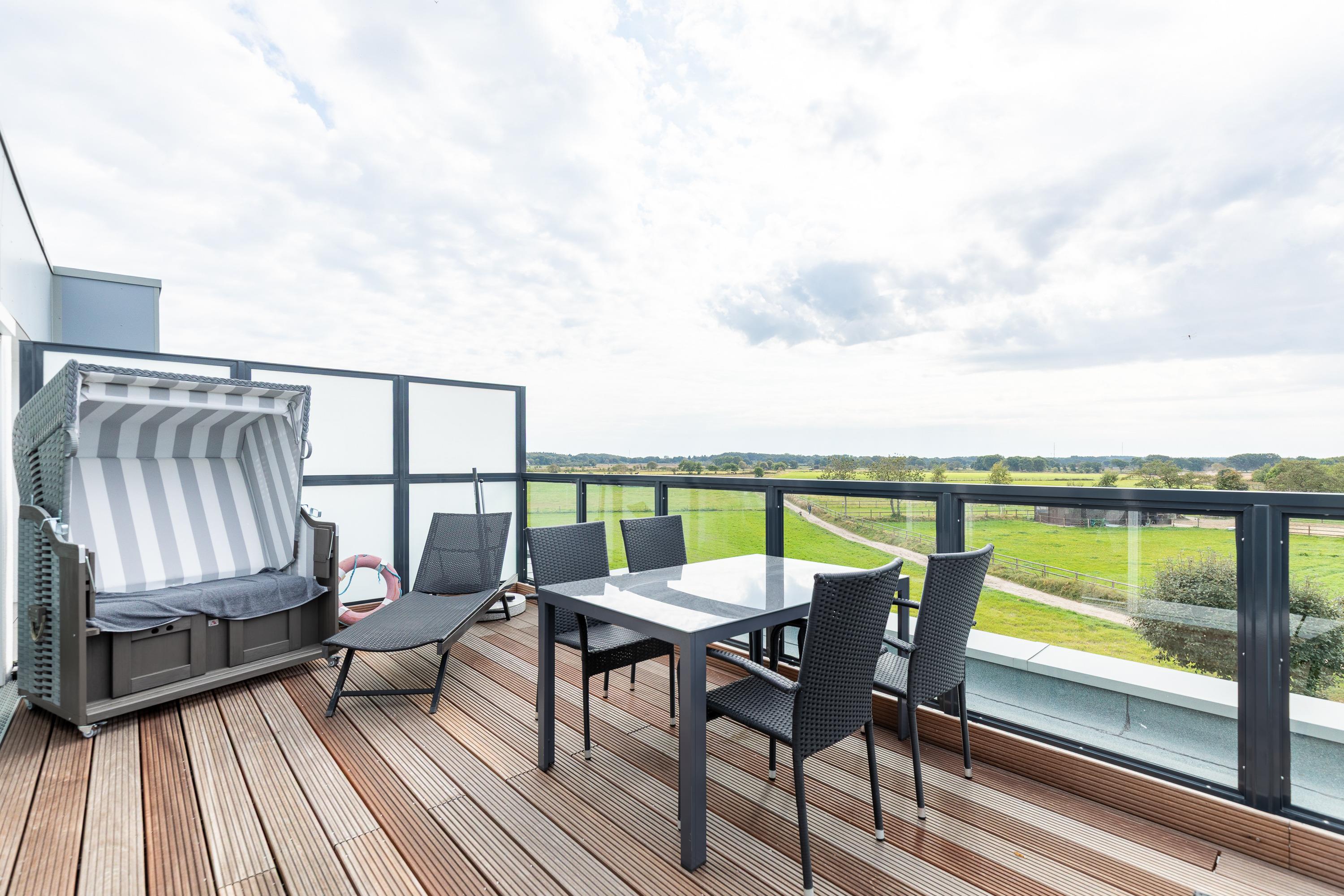 Die modern eingerichtete Wohnung (ca. 62m²) ist für bis zu 2 Personen ausgestattet. 1 Schlafzimmer mit 2 Einzelbetten und TV, Wohnzimmer mit gemütlichem Ecksofa, Flatscreen TV, Mini Stereoanlage, Essplatz mit 4 Stühlen und Zugang zum Wintergarten mit Kamin und großer Dachterrasse (mit Strandkorb, Liegen und Stühlen), Küchenzeile (Ceranfeld, Mikrowelle, Kaffeemaschine, Wasserkocher, Toaster, Geschirrspüler), 1 Bad mit ebenerdiger Dusche und WC, Flur, PKW-Stellplatz am Haus, Nichtraucher, es sind keine Tiere erlaubt.
