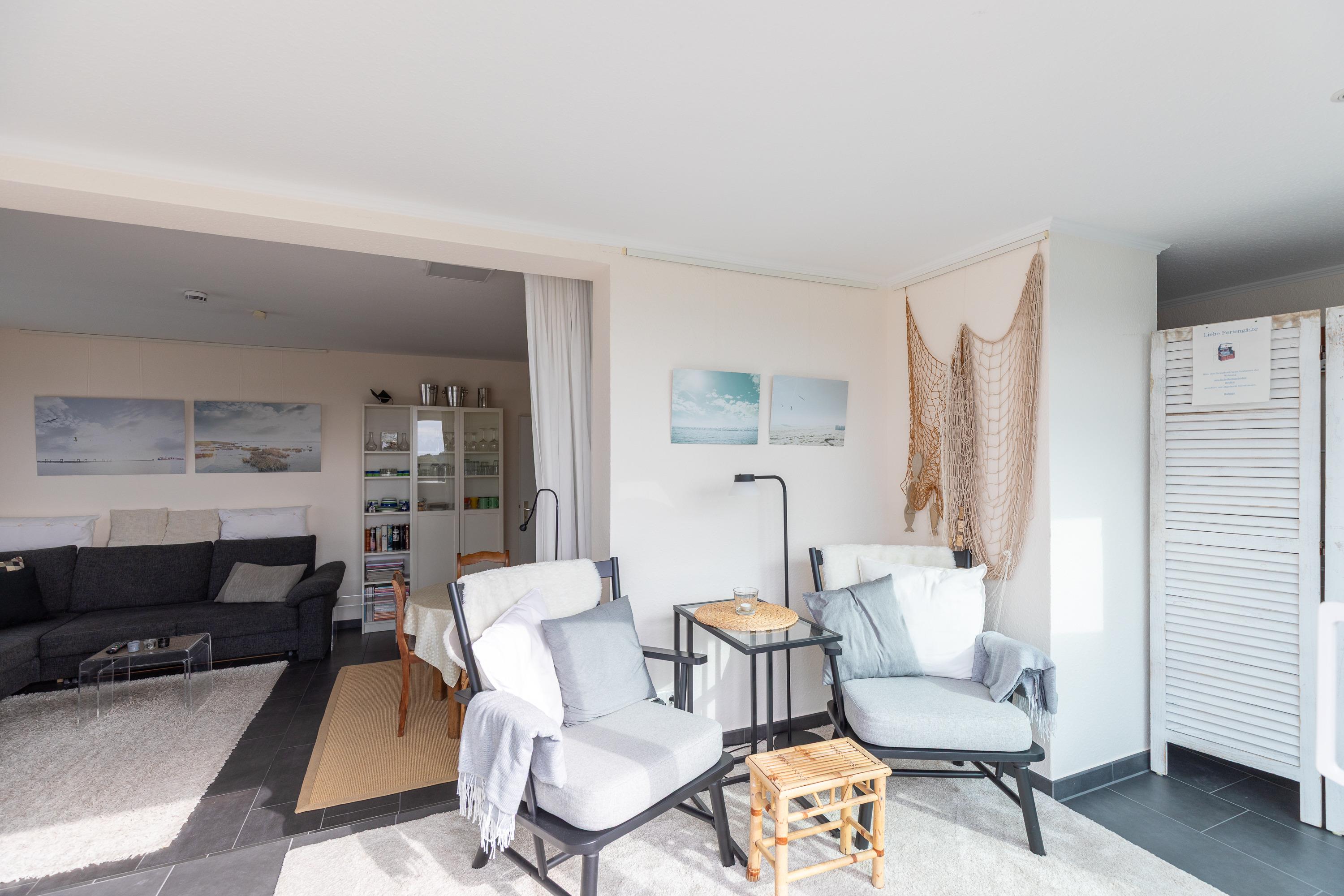 Kostenloses WLAN, Kamin im Wintergarten (mit Tisch und 4 Stühlen), ein Schwimmbad im Nachbarhaus (kann kostenlos zu den Öffnungszeiten genutzt werden), Waschmaschine und Trockner geg. Gebühr im Haus, Dampfsauna und Finnische Sauna (jeweils im Nachbarhaus) geg. Gebühr. Für die kleinen steht ein Kinderspielplatz zur Verfügung. Genießen Sie die Leichtigkeit und Weitläufigkeit unserer Ferienwohnungen und die Wohlfühlatmosphäre an der Nordsee.