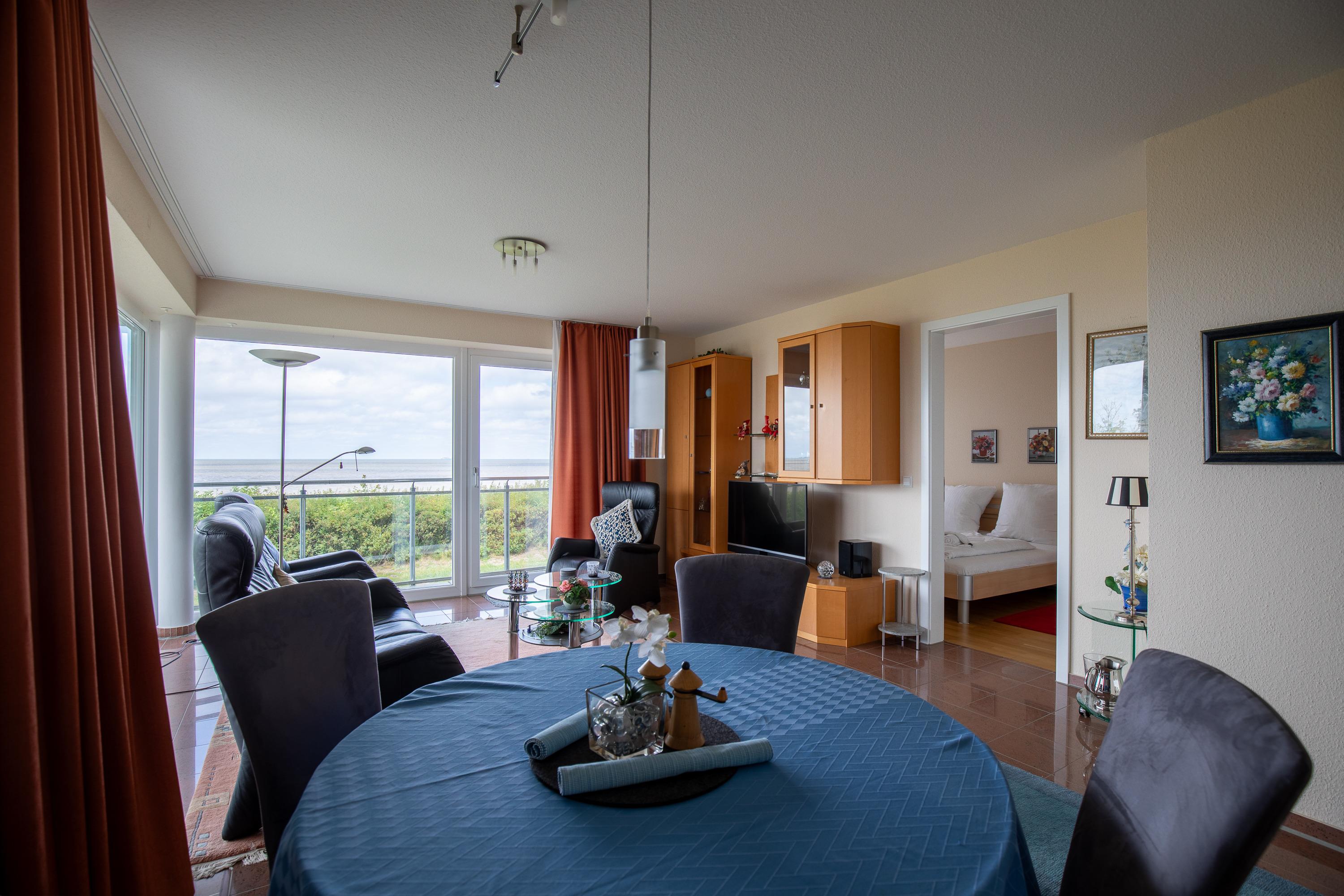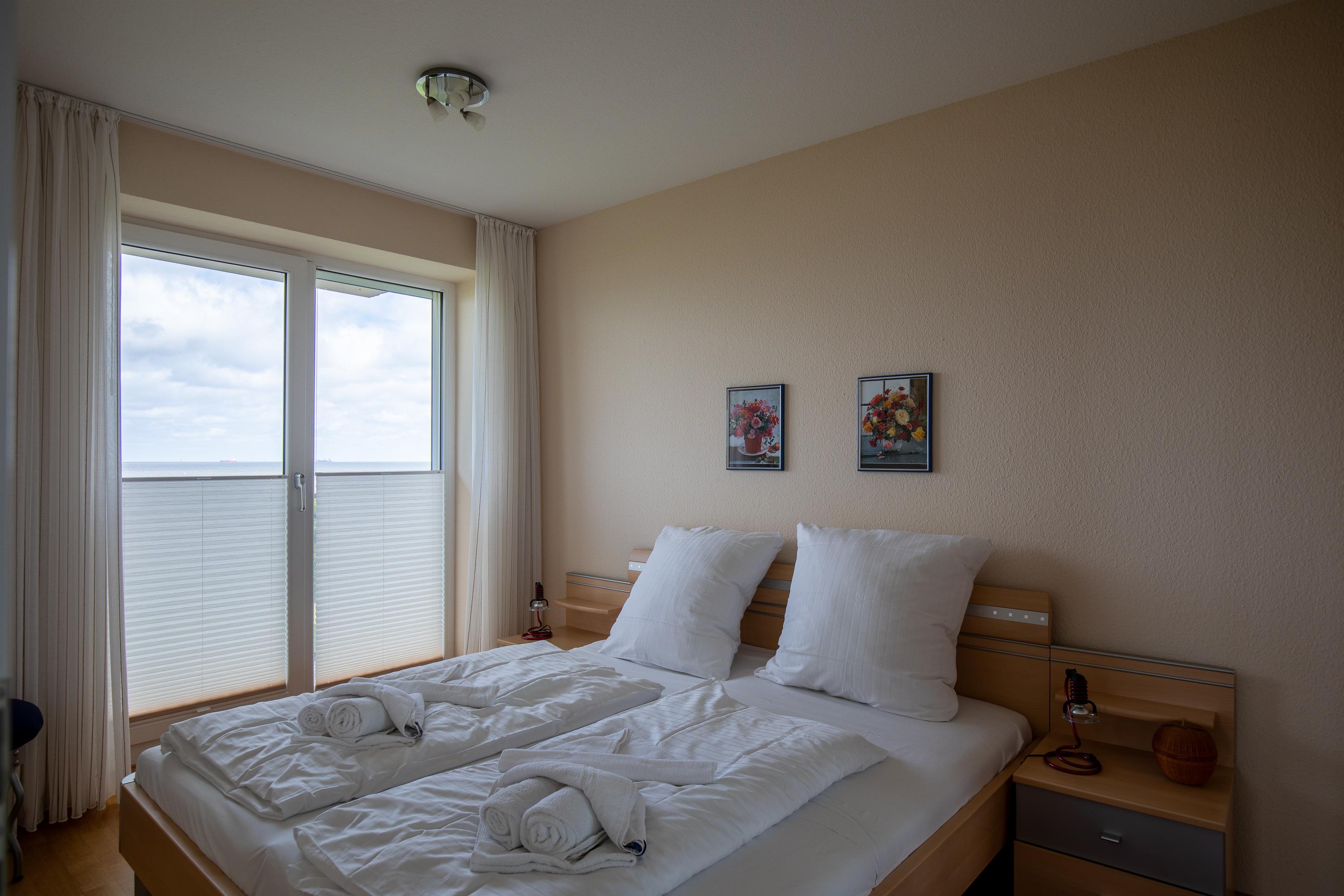 Die 2 Raum Wohnung mit einer Größe von ca. 70 m² Wohnfläche ist komplett bis zu 2 Personen ausgestattet. 1 Schlafzimmer mit einem Doppelbett und Kleiderschrank, großes Wohnzimmer mit gemütlicher Sitzecke, Essplatz, Blick auf die Nordsee, Zugang zum Balkon, separate Küche (Backofen, Cerankochfeld, Geschirrspüler, Toaster, Kaffeemaschine, Wasserkocher), Bad mit Dusche, WC, 1 Flatscreen TV im Wohnzimmer, Nichtraucherwohnung, keine Haustiere, PKW-Stellplatz in der Tiefgarage (Höhe der Einfahrt 1,90 m).