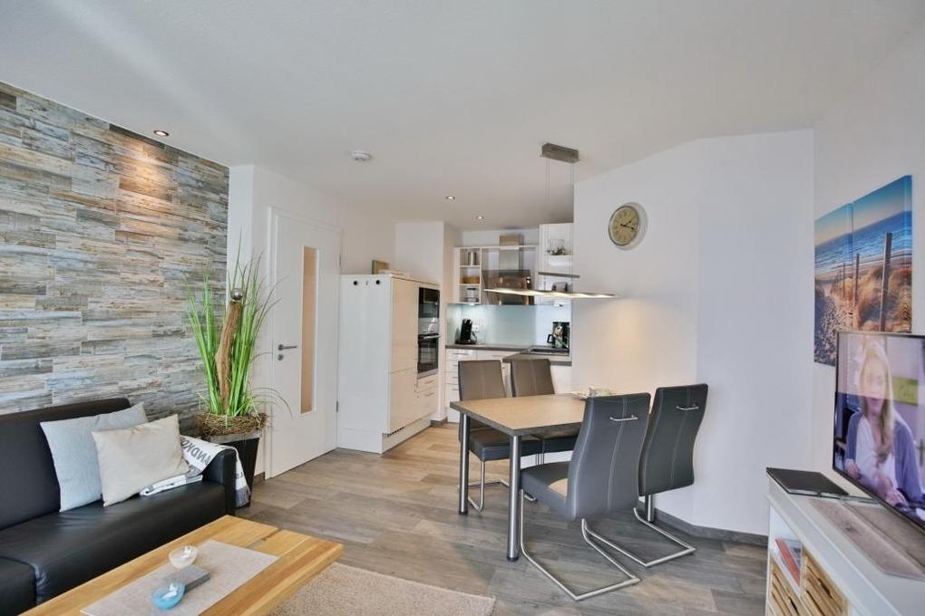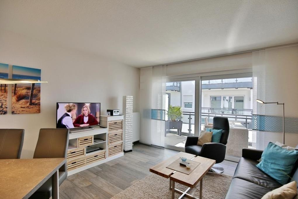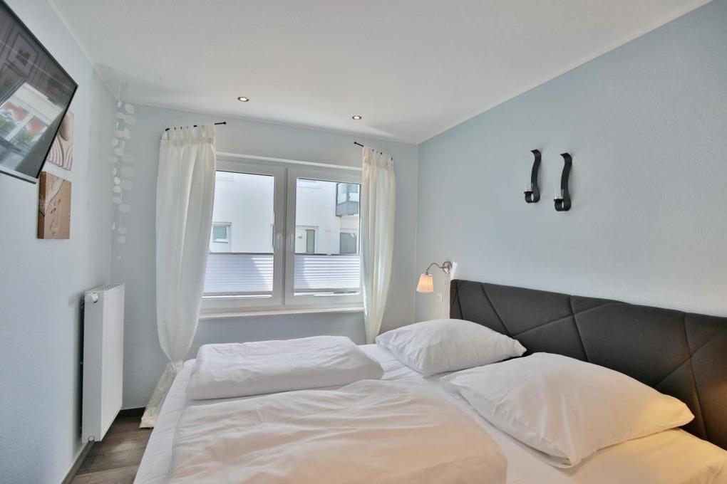 Schöne 2-Raum-Neubau-Wohnung auf der 1. Etage, zentrumsnah in Duhnen. Vollständige Küchenzeile mit Mikrow, Backofen, Geschirrspüler etc. Wohnzimmer mit Schlafcouch und Balkon (west) , 2x SAT-TV, Stereoanlage, kostenfreies W-Lan, separates Schlafzimmer mit franz. Doppelbett, Außenjalousien [&] Moskitonetz, ebenerdige Dusche/WC, reservierter Pkw-Stellplatz in der Tiefgarage #5, keine Haustiere und natürlich Nichtraucher.