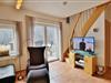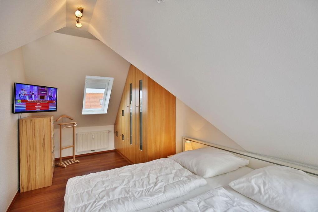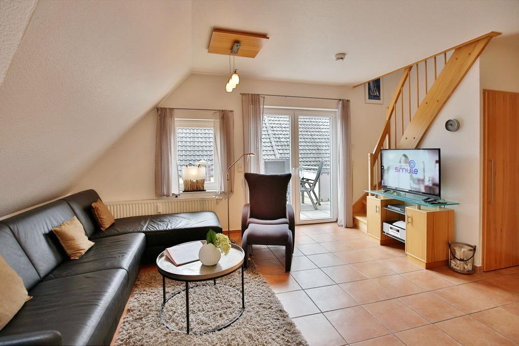 Schöne 2 Zimmer Maisonette Wohnung (ca. 50m²) in der 1. Etage. Nichtraucher, Schlafzimmer mit Doppelbett [&] TV im Dachgesch., Wohnzimmer mit großem Südbalkon, Kabel-TV, kostenfreies Wlan, Stereo, Küchenzeile (Gefrief., Backofen und Geschirrspüler), Dusche/Wc, Nichtraucher, keine Haustiere, Pkw-Stellplatz #6.