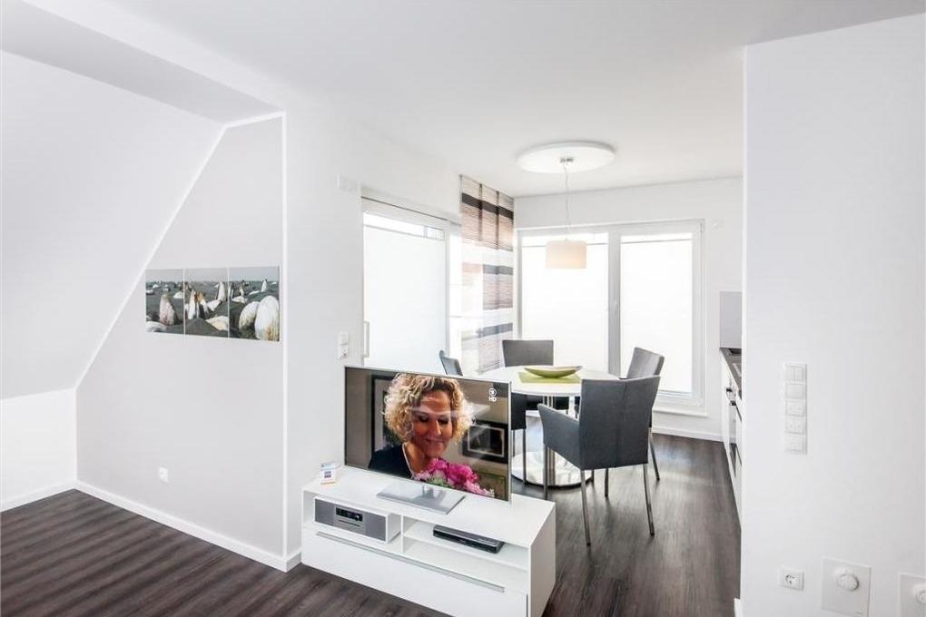 Sehr schöne, moderne 3-Raum-Wohnung bis 4 Pers über zwei Etagen (64m²), 2.Etage, 2 Schlafzimmer mit Doppelbetten, Wohnzimmer mit großer Küchenzeile (Back., Mikrow., Geschirrspüler), 2x Du/WC, 2xSAT-TV, Blue-Ray, CD-Radio, W-LAN kostenlos, großer Westbalkon mit Balkonmöbeln und Sonnenschirm (saisonabhängig), reservierter Pkw-Stellplatz vor dem Haus, keine Haustiere erlaubt, Nichtraucher.
