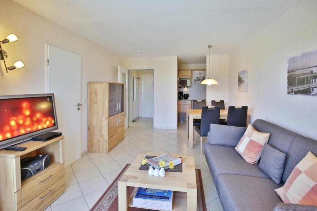 2-Raum-Wohnung auf ca. 40m², 3. Etage, komplett ausgestattet bis 4 Pers., 1 Schlafzimmer mit 2 Einzelbetten (0,90m x 2,00m), 1 kombiniertes Wohn/Schlafzimmer mit Schlafcouch, Sat-TV, kostenloses W-Lan, CD-Radio, Blue-Ray-Player, Küchenzeile mit 2 Pl.-Herd, Mikrowelle und Geschirrspüler, Dusche /WC (neu in 2020), Flur, Balkon (west), keine Haustiere, Tiefgarage #306.