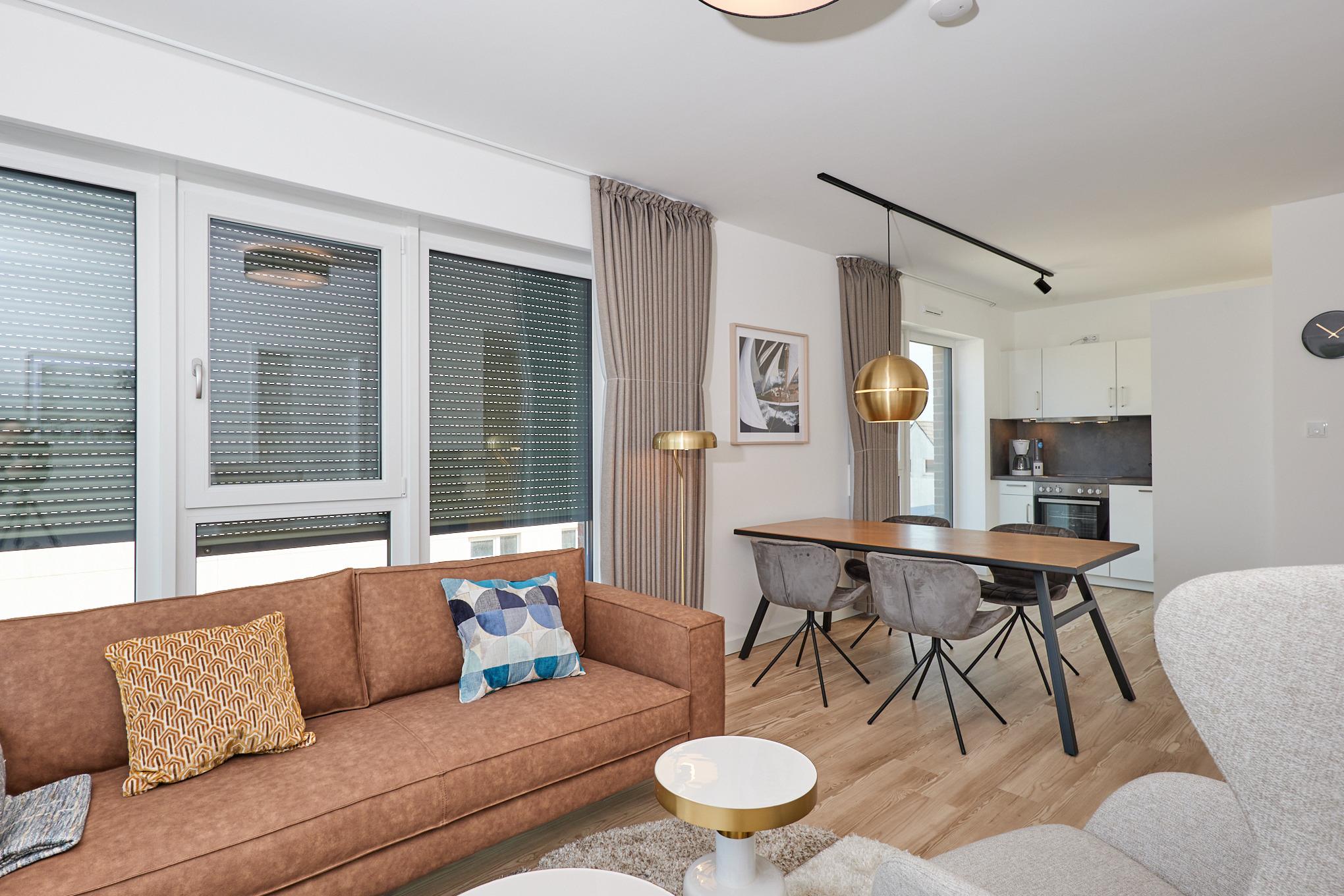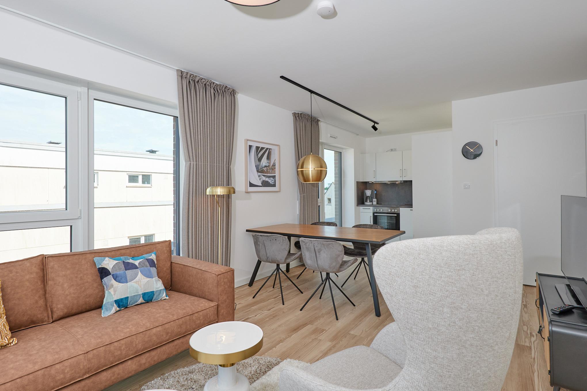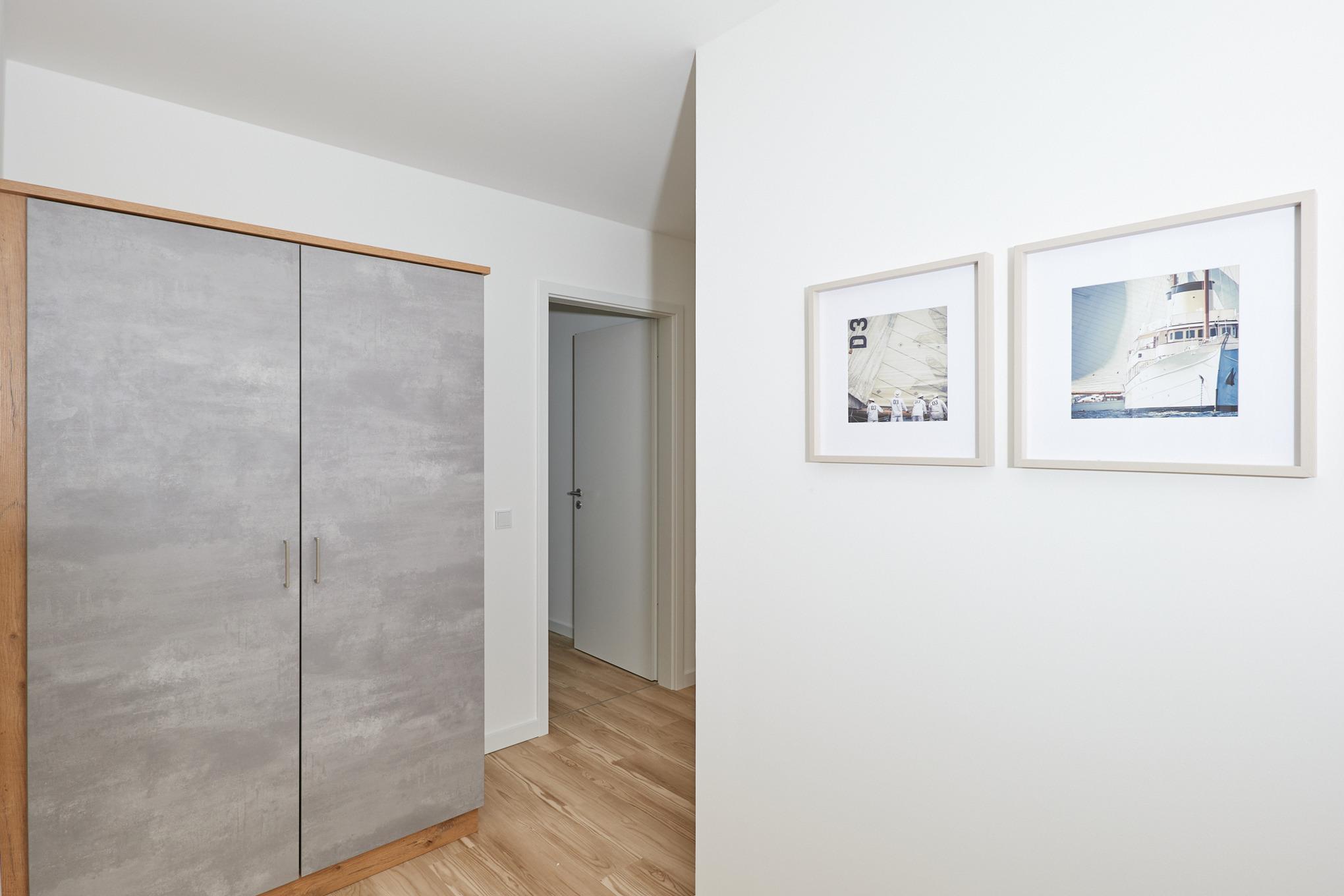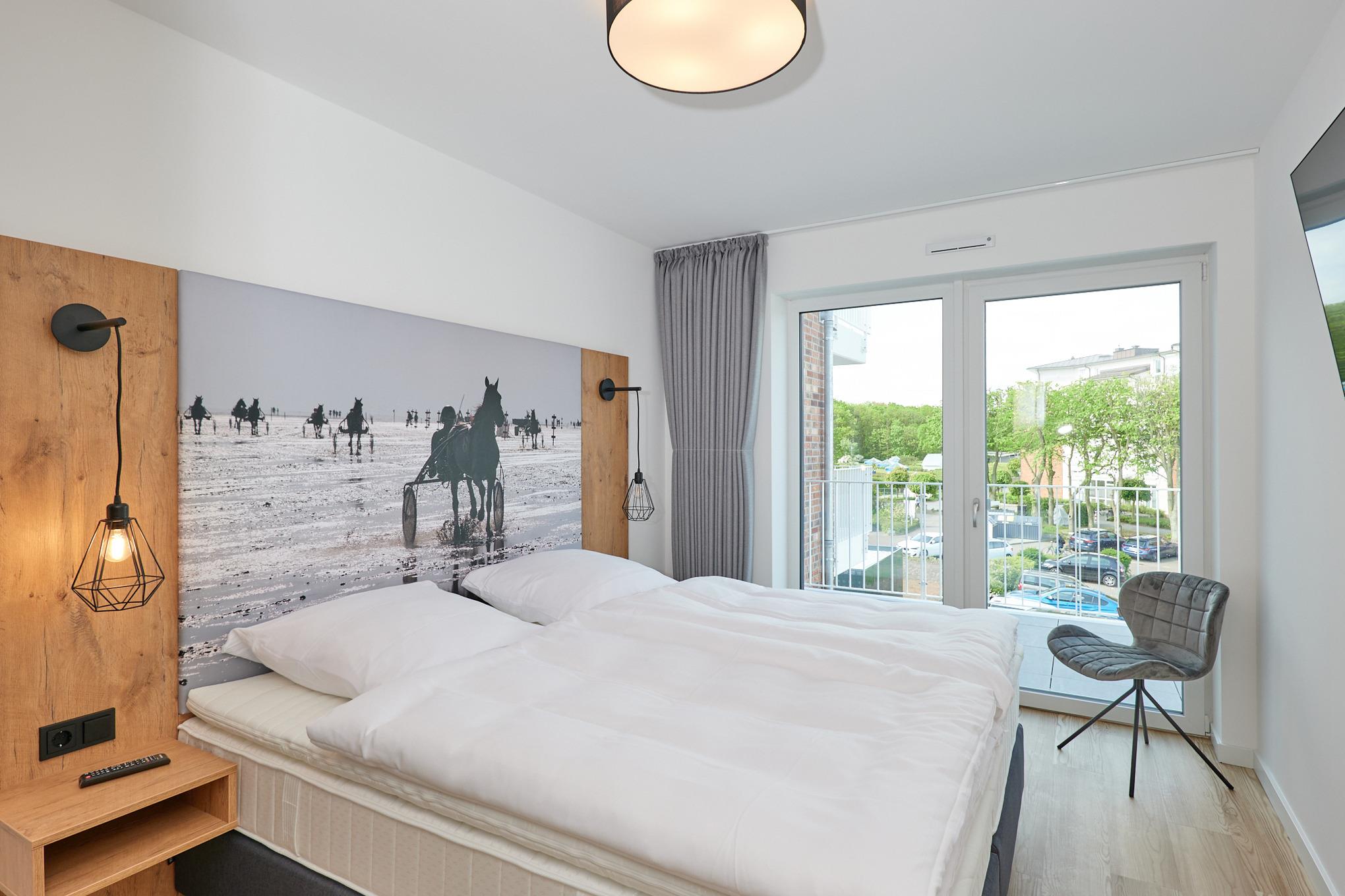 Neubau Mai 2023! Sehr schöne, moderne 3-Raum-Wohnung bis 4 Pers. voll ausgestattet auf ca. 87 m² in der 3.Etage gelegen, 2 Schlafzimmer (1x Doppelbett, 1x 2 Einzelbetten) und Außenjalousien an allen Fenstern, ebenerdige Dusche/WC, Wohnzimmer mit großer Küchenzeile (Backofen, Geschirrspüler, Mikrowelle) und Teilseesicht, 2x Kabel-TV, Radio, kostenfreies W-LAN-Internet, großer Balkon (west) mit Teilseesicht, Personenaufzug, reservierter Pkw-Stellplatz in der Tiefgarage inkl., es sind keine Haustiere erlaubt und natürlich Nichtraucher. Durchfahrtshöhe Tiefgarage: 2,05m.