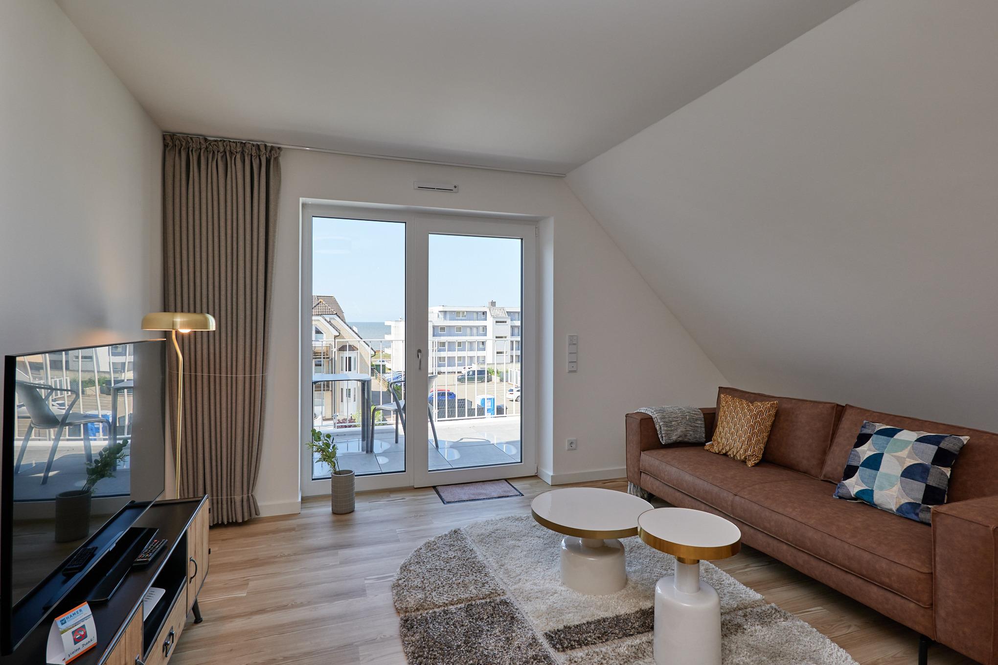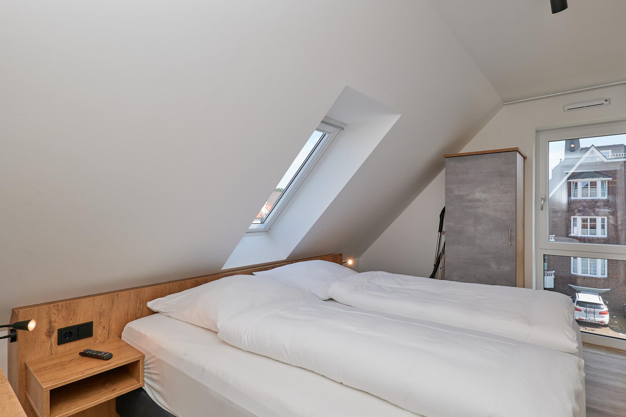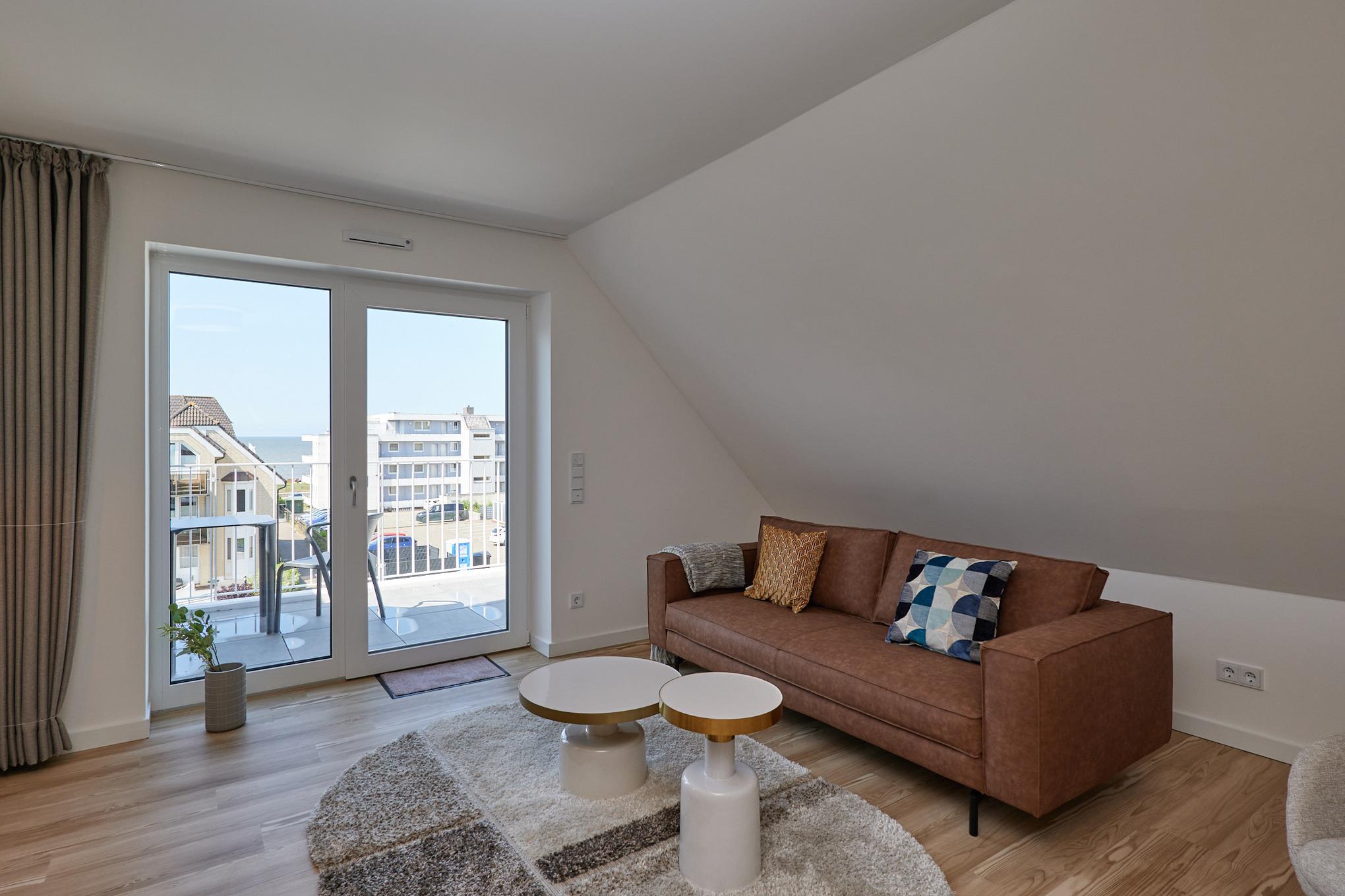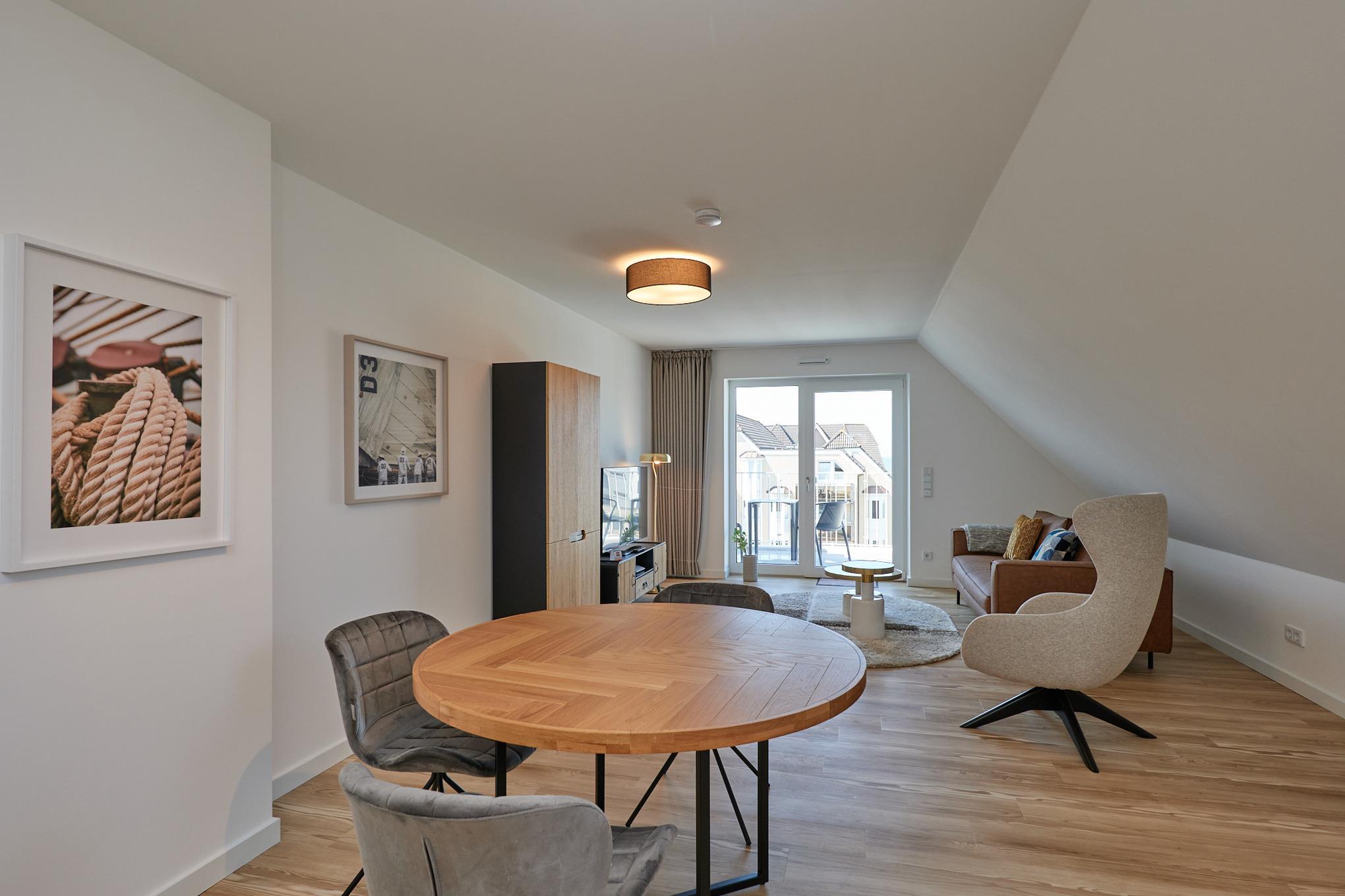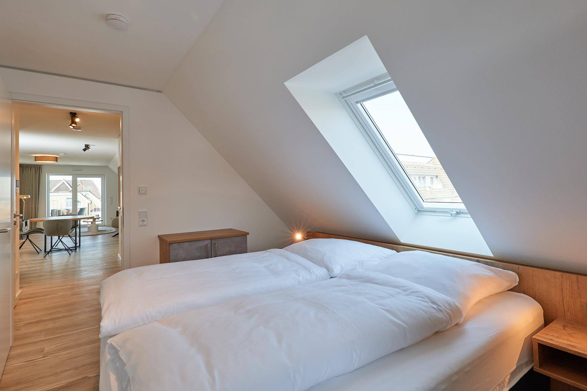 Neubau Mai 2023! Sehr schöne, moderne 2-Raum-Wohnung bis 2 Pers. voll ausgestattet auf ca. 49 m² in der 3.Etage gelegen, 1 Schlafzimmer mit komfortablen Doppelbett (Bettwäsche inkl.) und Außenjalousien an allen Fenstern (Veluxfenster mit Rollo innen), ebenerdige Dusche/WC, Wohnzimmer mit Küchenzeile (2 Platten, Mikrowelle/Backkombi, Geschirrspüler) 2x Kabel-TV, Radio, kostenfreies W-LAN-Internet, großer Balkon mit Teilseesicht (nord/west), beide Zimmer mit Dachschrägen, Personenaufzug, die Wohnung ist barrierefrei erreichbar, reservierter Pkw-Stellplatz in der Tiefgarage inkl., es sind keine Haustiere erlaubt und natürlich Nichtraucher. Durchfahrtshöhe Tiefgarage: 2,05m.