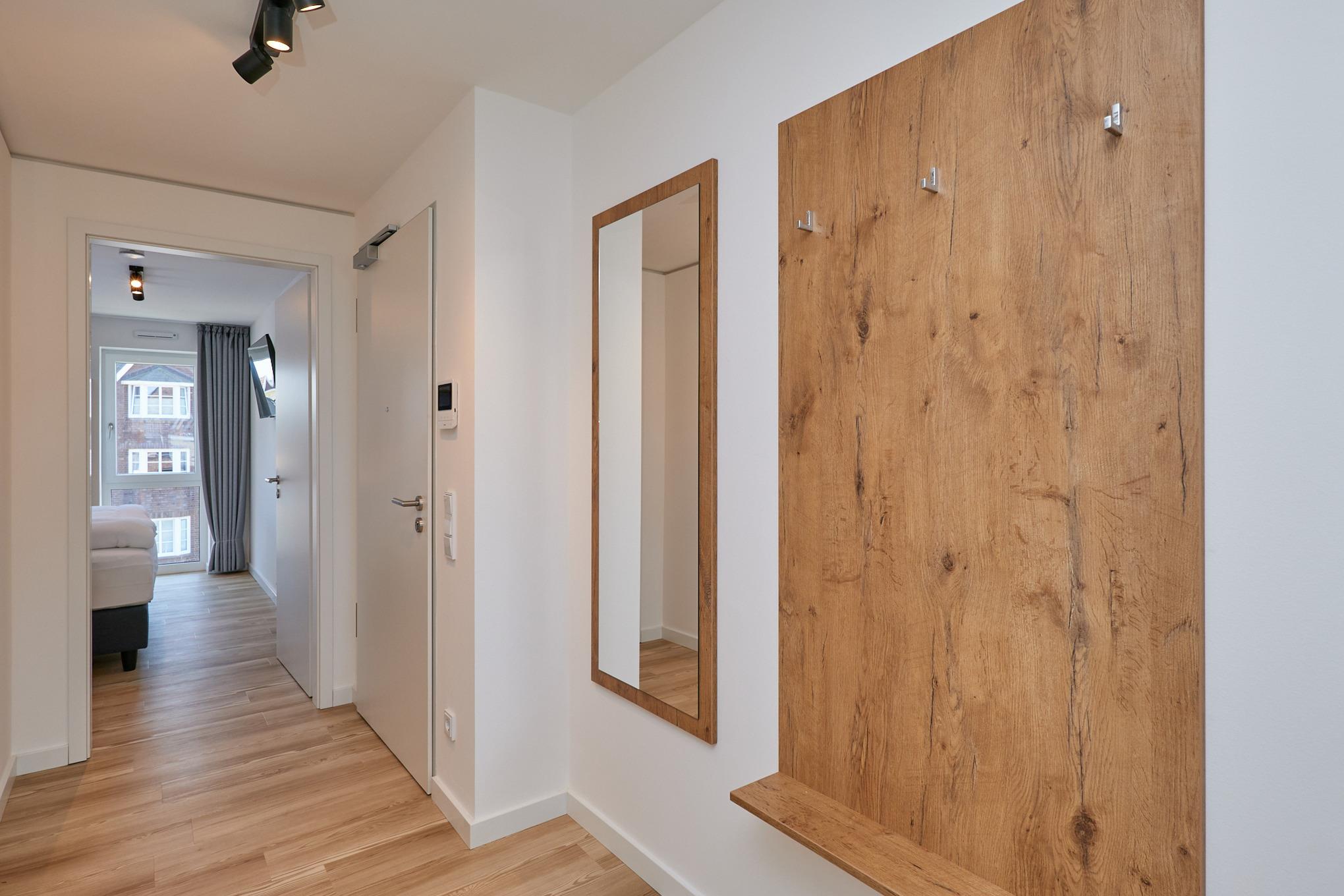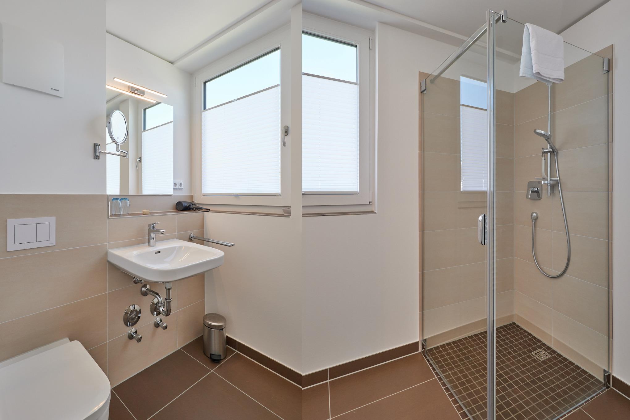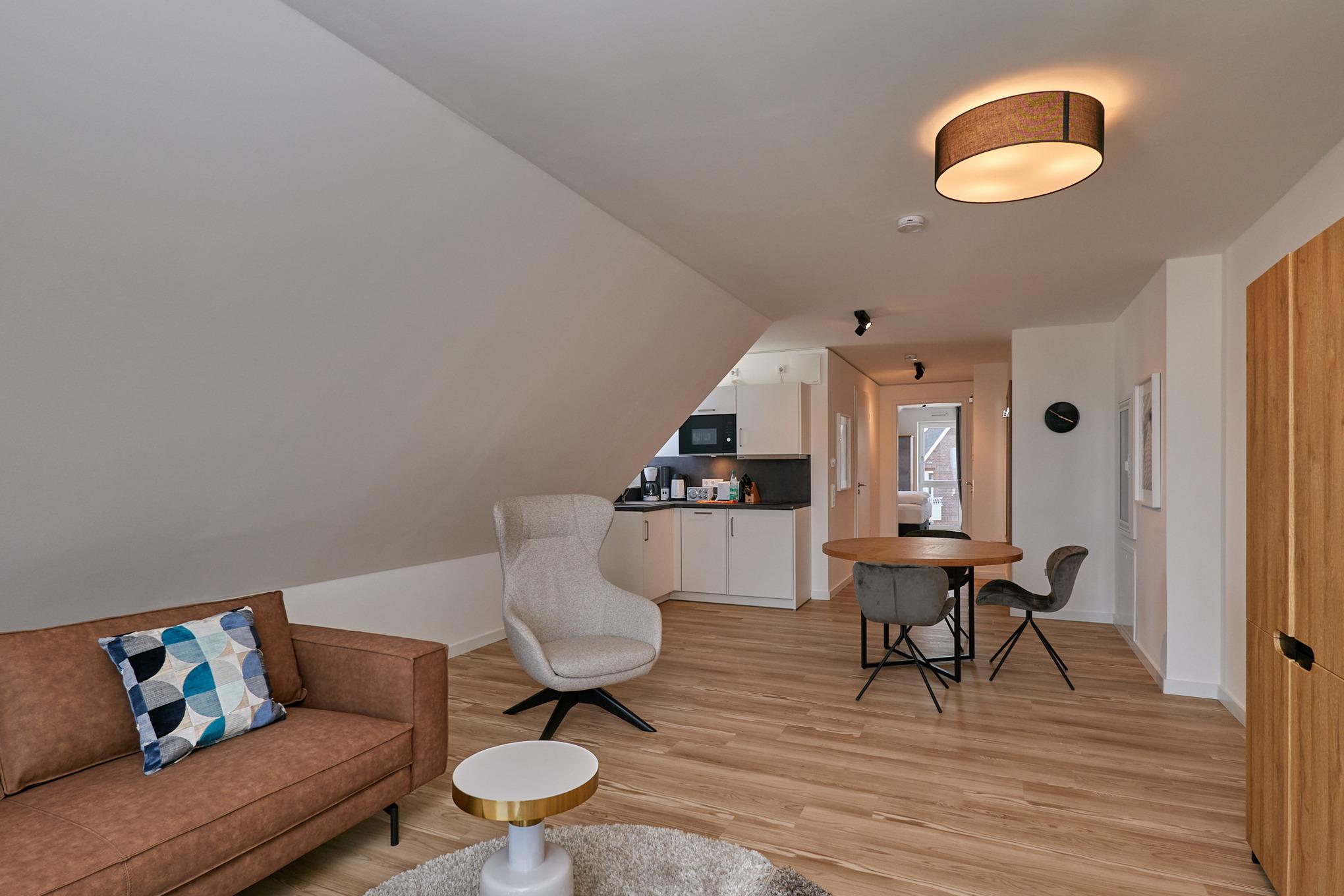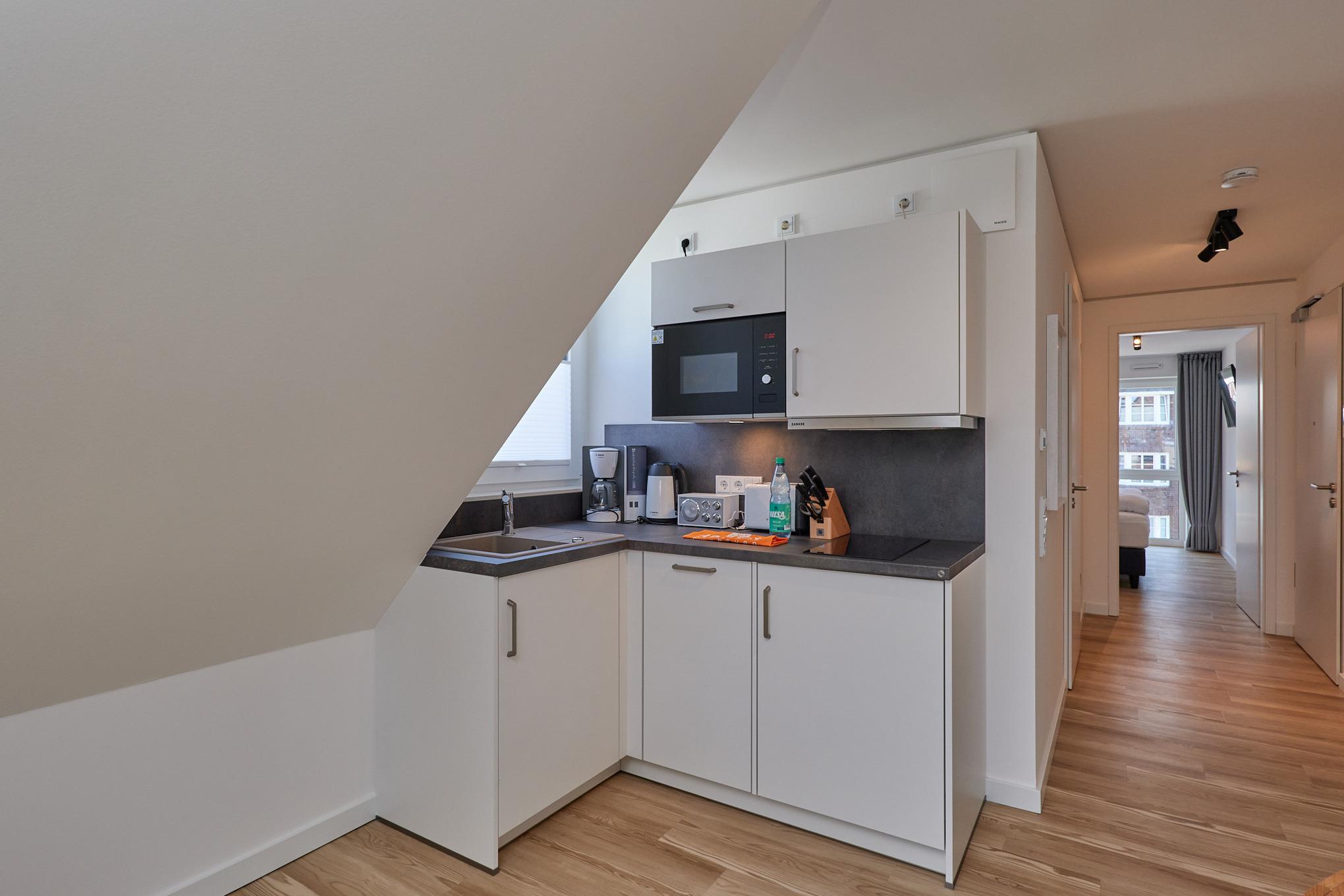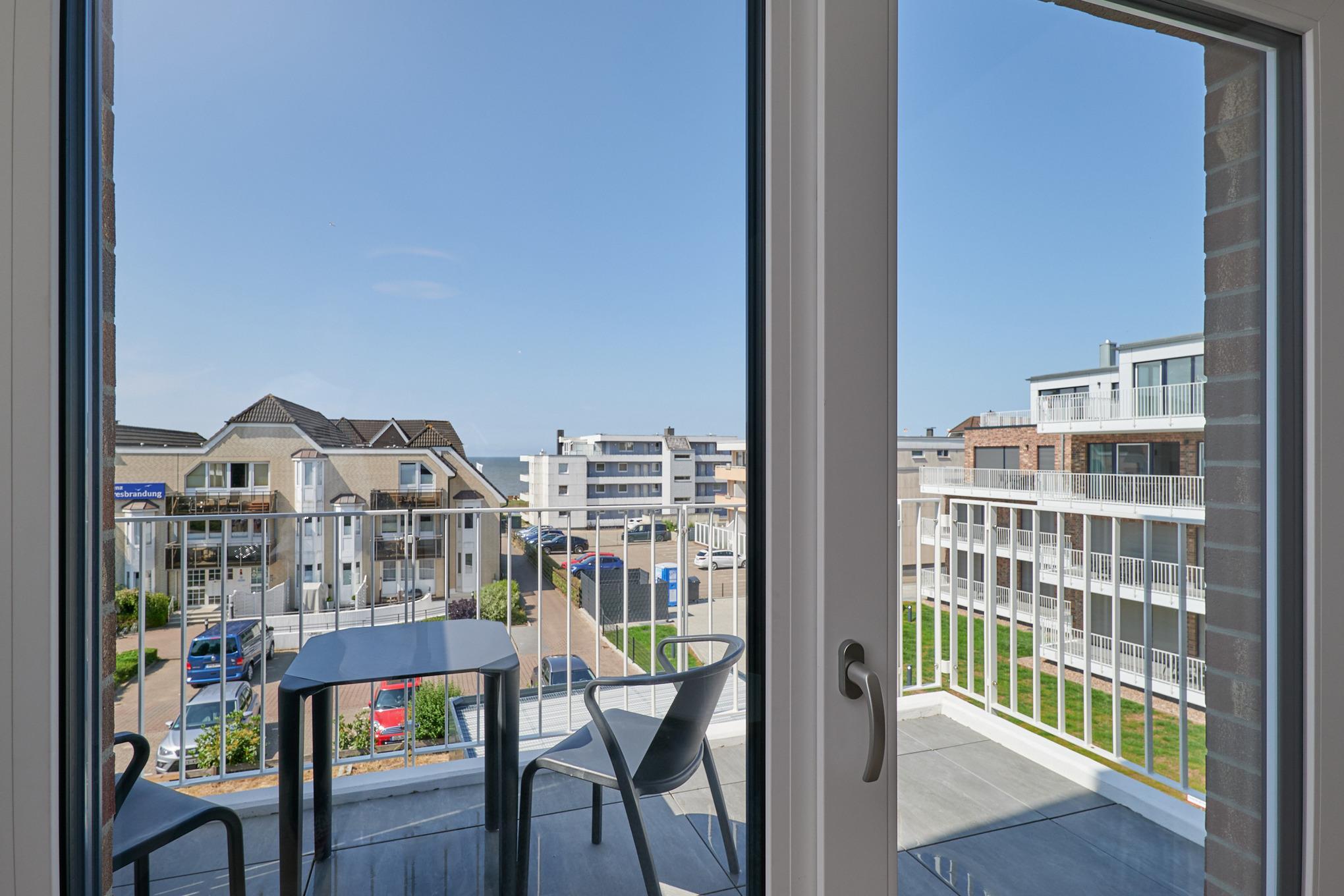Neubau Mai 2023! Sehr schöne, moderne 2-Raum-Wohnung bis 2 Pers. voll ausgestattet auf ca. 49 m² in der 3.Etage gelegen, 1 Schlafzimmer mit komfortablen Doppelbett (Bettwäsche inkl.) und Außenjalousien an allen Fenstern (Veluxfenster mit Rollo innen), ebenerdige Dusche/WC, Wohnzimmer mit Küchenzeile (2 Platten, Mikrowelle/Backkombi, Geschirrspüler) 2x Kabel-TV, Radio, kostenfreies W-LAN-Internet, großer Balkon mit Teilseesicht (nord/west), beide Zimmer mit Dachschrägen, Personenaufzug, die Wohnung ist barrierefrei erreichbar, reservierter Pkw-Stellplatz in der Tiefgarage inkl., es sind keine Haustiere erlaubt und natürlich Nichtraucher. Durchfahrtshöhe Tiefgarage: 2,05m.