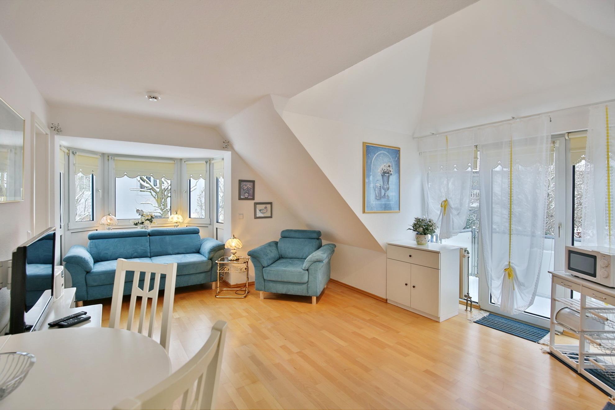 Zentral gelegene 2-Raum-Wohnung in der 1. Etage, ca. 35m², komplett ausgestattet bis 2 Pers., 1 Schlafzimmer mit Doppelbett, 1 Wohnzimmer mit kleinem West-Balkon, Küchenzeile (Backofen, Geschirrspüler und Mikrowelle), Kabel-TV, DVD-Player, Radio, Du/WC, Flur, keine Haustiere, Nichtraucher, allergikergerecht, reservierter Pkw-Stellplatz #12 auf dem Außengelände.