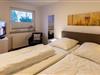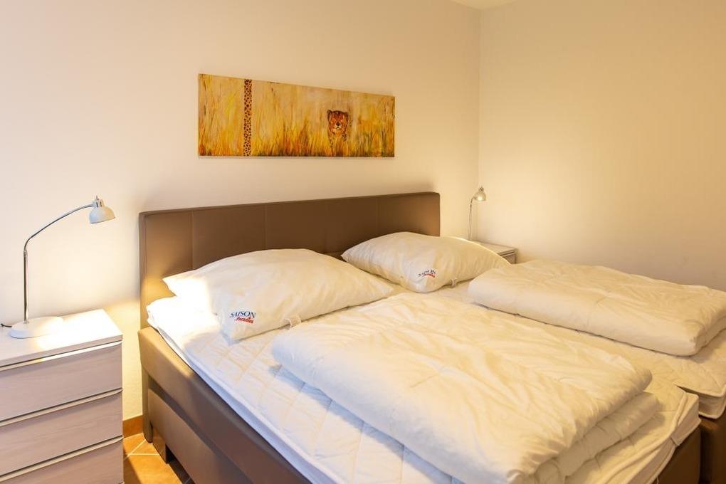 2-Raum-Parterrewohnung mit ca. 52m². Komplett ausgestattet bis 4 Pers. Wohnzimmer mit Küchenzeile vollausgestatter Küchenzeile (Geschirrspüler, Backofen etc.), Doppelbettcouch und Zugang zur Terrasse (west), Kabel-TV, W-Lan kostenfrei. 1 Schlafzimmer mit Doppelbett [&] TV, Du/WC, keine Haustiere, Nichtraucher, reservierter Pkw-Stellplatz #13 vor dem Haus.