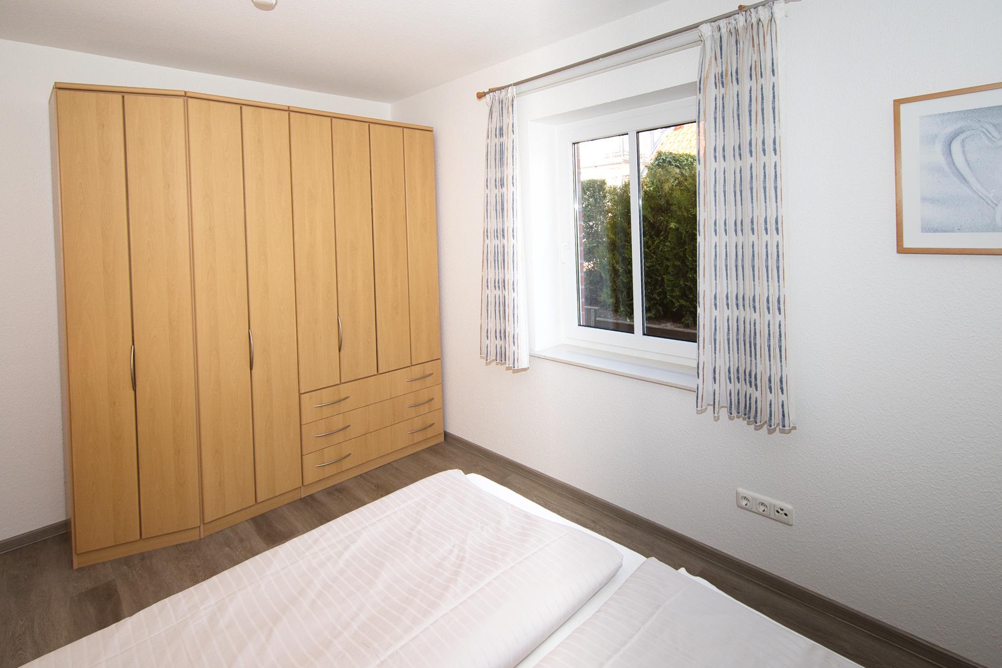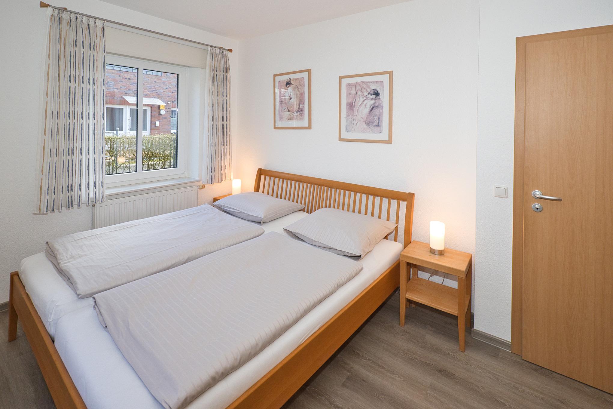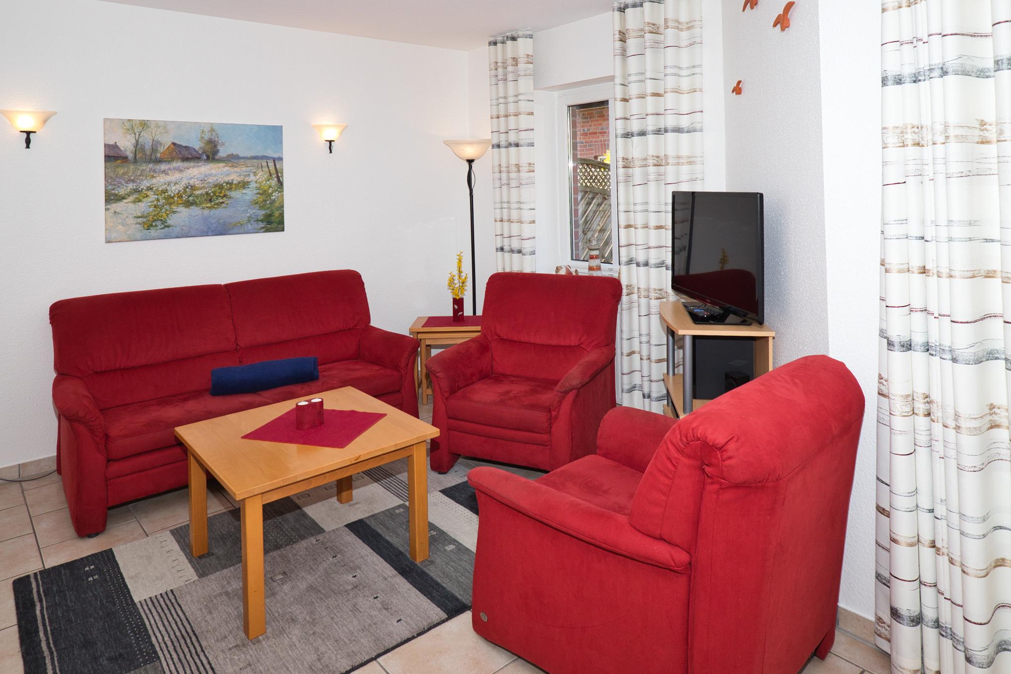 Unsere im Friesenstil erbaute, rollstuhlfreundliche 3-Raum-Wohnung befindet sich in einem verkehrsberuhigten Wohngebiet und bietet auf ca. 60 m² alles, was Sie für einen erholsamen Urlaub brauchen. Die Nichtraucherwohnung (Rauchen auf der Terrasse erlaubt) verfügt über ein gemütliches Schlafzimmer mit Doppelbett (180x200 cm, Höhe 50 cm) und einen Schlafbereich mit einem Einzelbett (140x200 cm, Höhe 50 cm). Das Wohnzimmer ist einladend und mit einer Essecke, einem Flachbildschirm HD und einem DVD Blu-ray Player ausgestattet. Die angrenzende Küchenzeile verfügt über einen Geschirrspüler, einen E-Herd und einen Backofen.