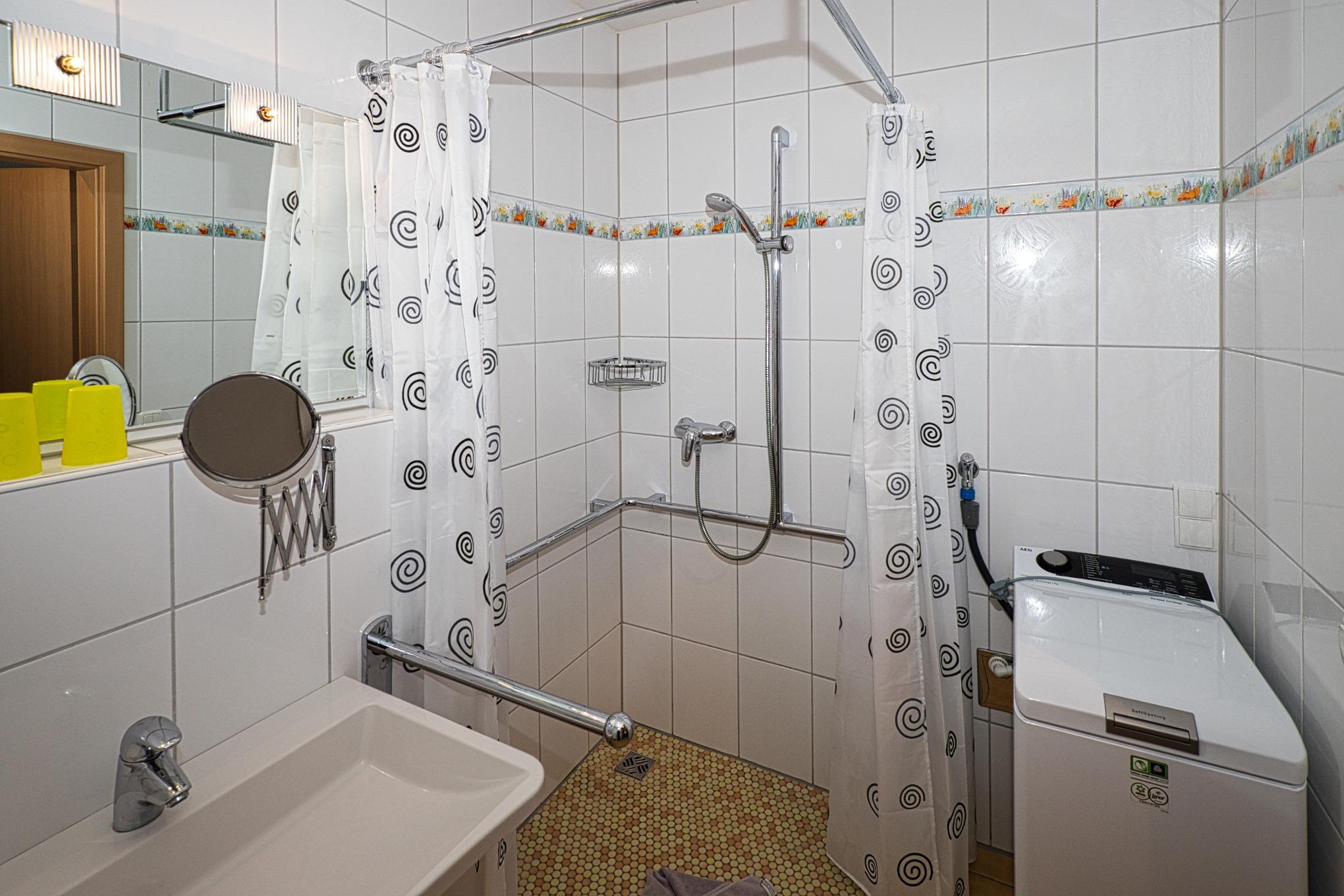 Das barrierefreie Bad mit Dusche/WC und Fußbodenheizung ist besonders auf die Bedürfnisse von Menschen mit Handicap ausgelegt. Es bietet Haltegriffe, ein unterfahrbares Waschbecken, einen stabilen Duschstuhl und einen Spiegel auf 1,80 m Höhe. Alle Türen haben eine Durchfahrtsbreite von 1,06 m.