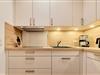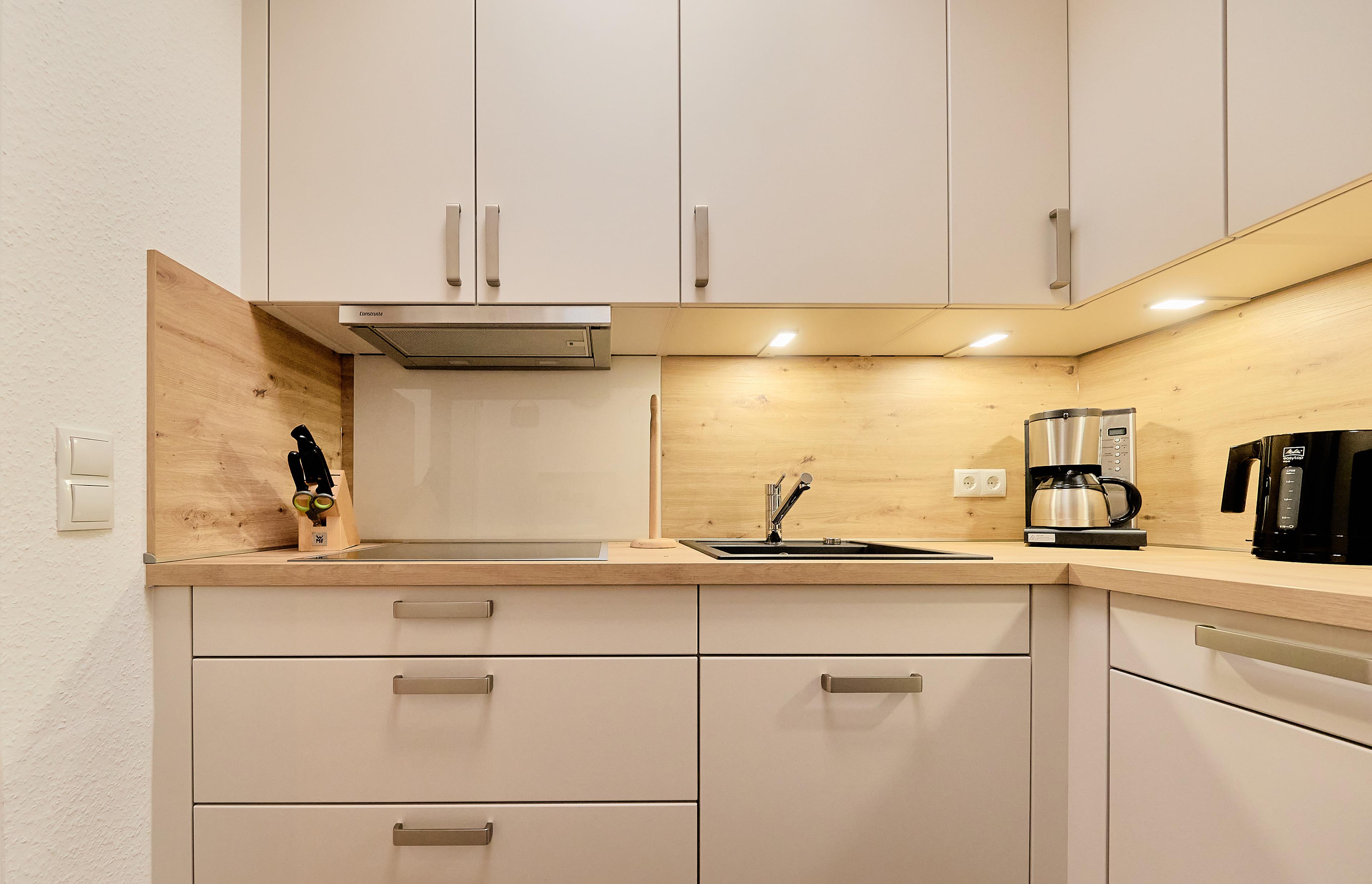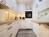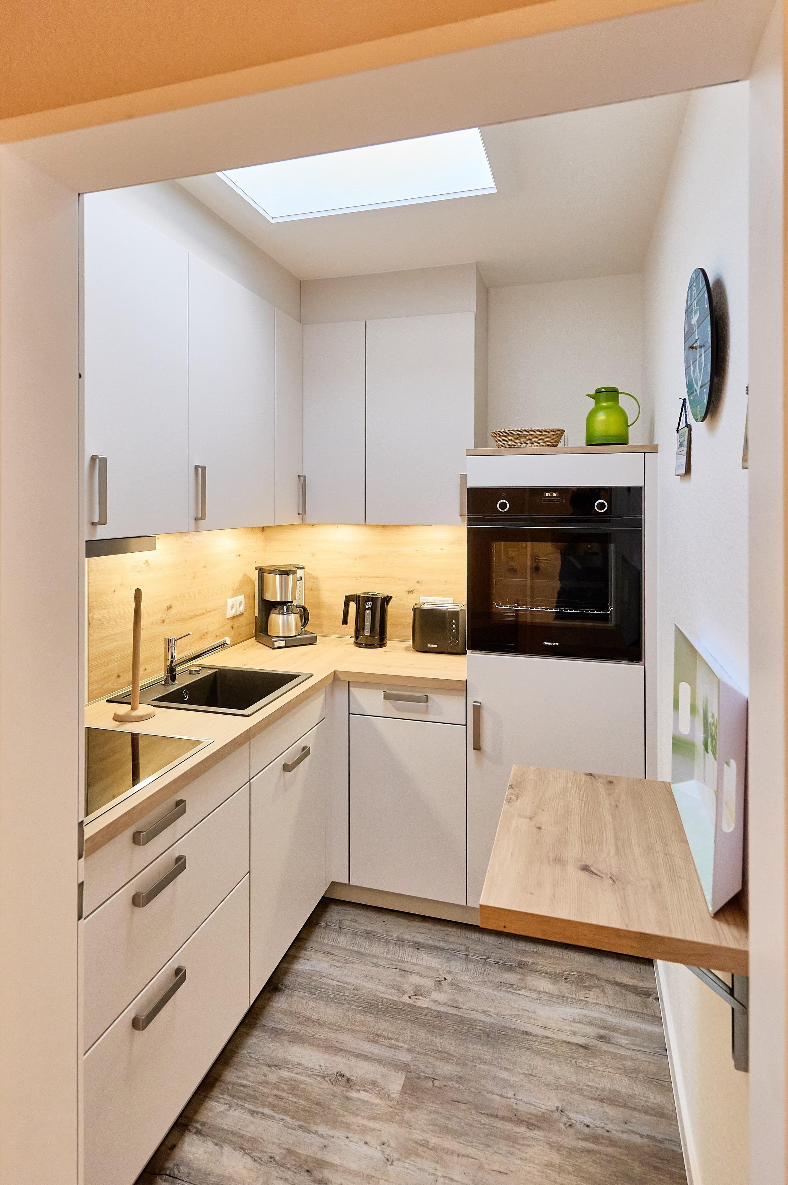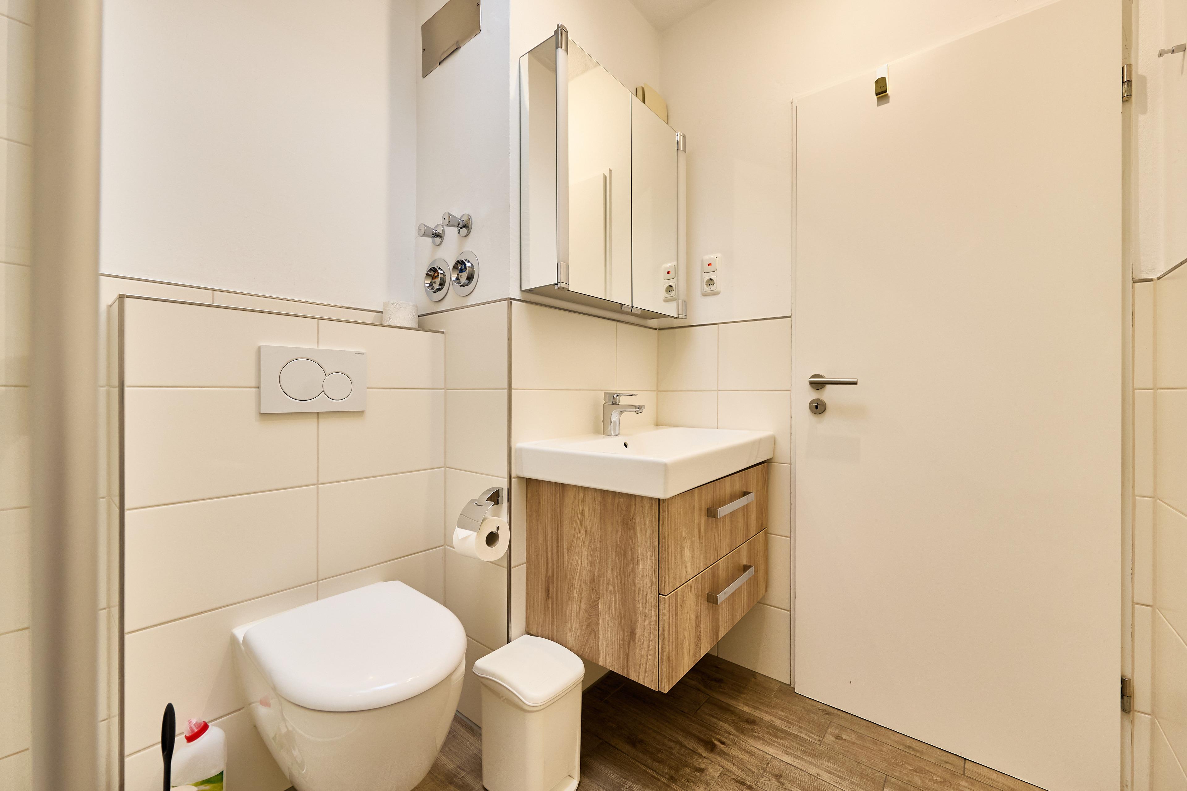 Die Wohnung ist außerdem mit einem modernen Duschbad mit WC (große ebenerdige Dusche), einem Flur mit Garderobe und einem Schlafzimmer, Doppelbett mit Kleiderschrank ausgestattet. Die separate und moderne Küche bietet Geschirrspüler, Herd mit Abzug, einen Backofen, ein Kühlschrank mit Gefrierfach, sowie einen klappbaren Stehtresen für die Essenszubereitung.