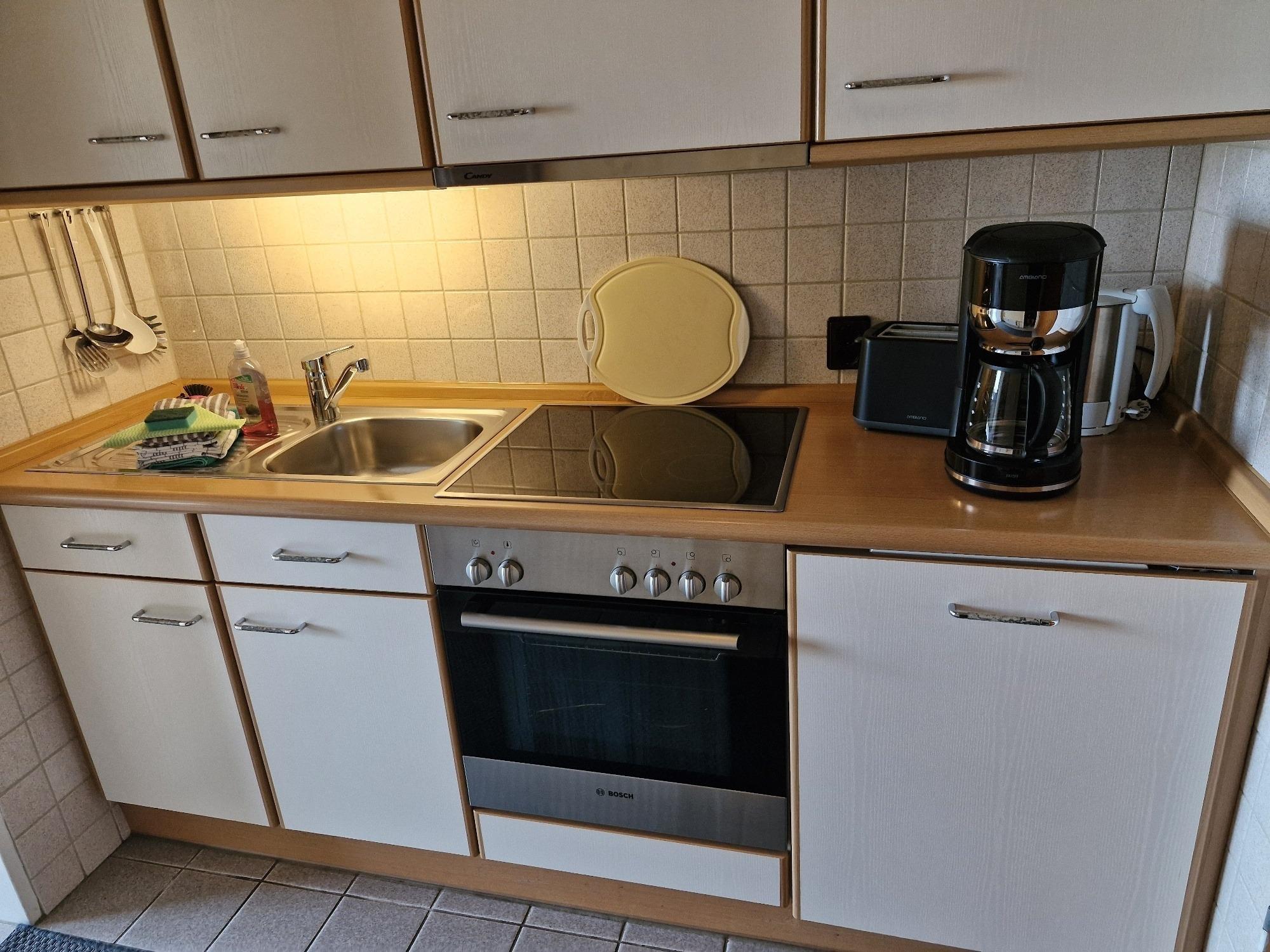 Die Küchenzeile befindet sich im Eingangsbereich der Wohnung und ist komplett eingerichtet. Sie bietet alles, was Sie für die tägliche Selbstverpflegung benötigen – vom Frühstück bis zur kleinen Mahlzeit am Abend.