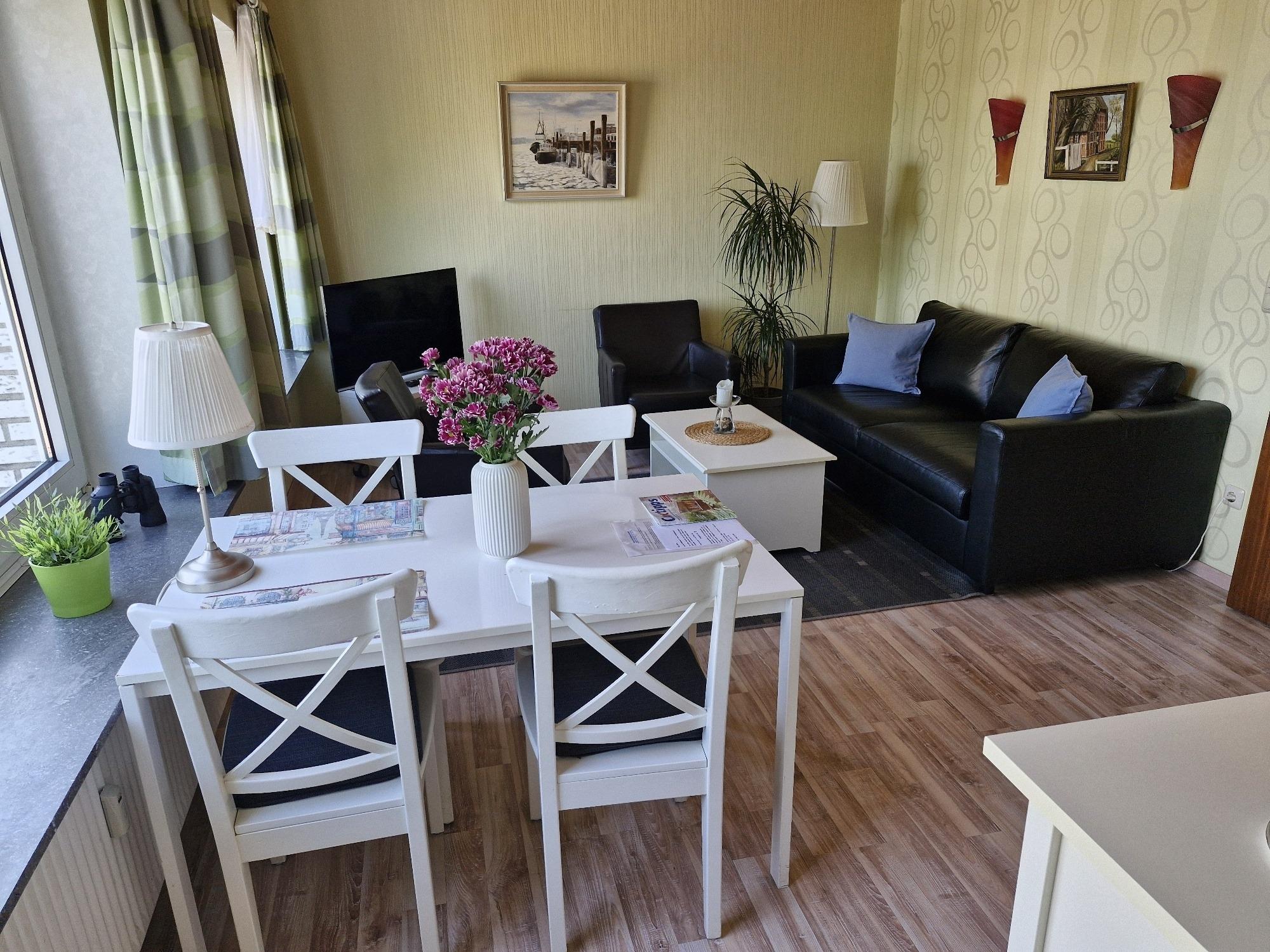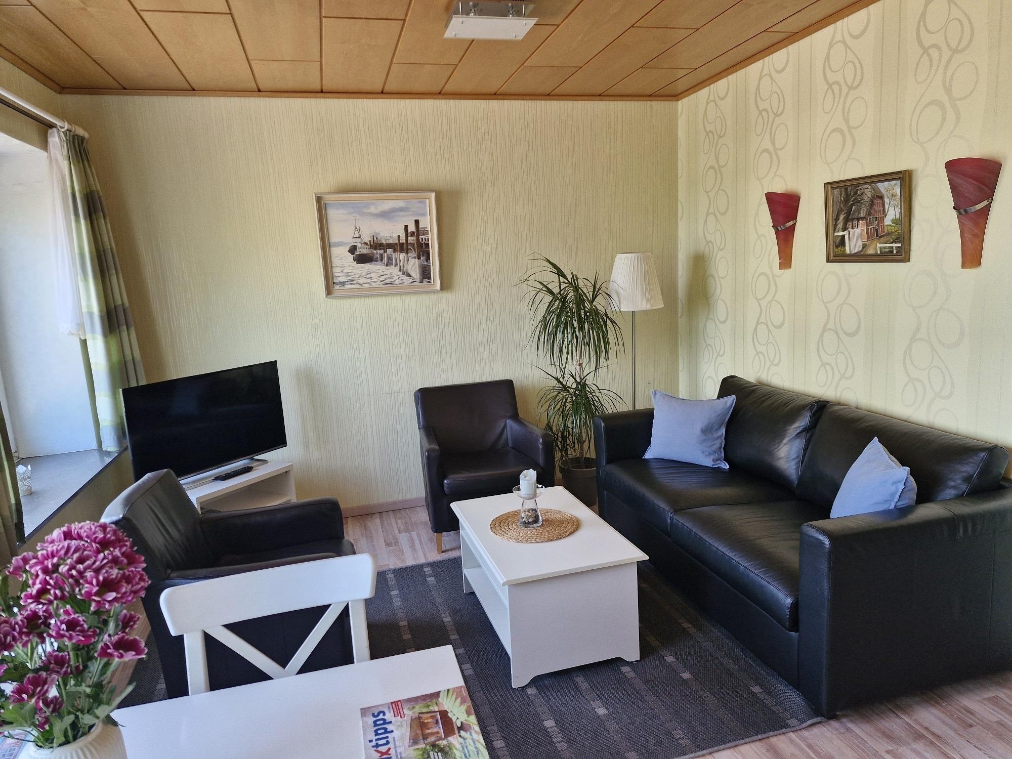 Die ca. 33 m² große 2-Zimmer-Ferienwohnung liegt im 2. Obergeschoss und ist individuell sowie geschmackvoll eingerichtet. Im Wohnbereich stehen ein Sofa und zwei bequeme Ledersessel zur Verfügung – ideal zum Lesen, Fernsehen oder für ruhige Urlaubsmomente nach einem Strandtag.
