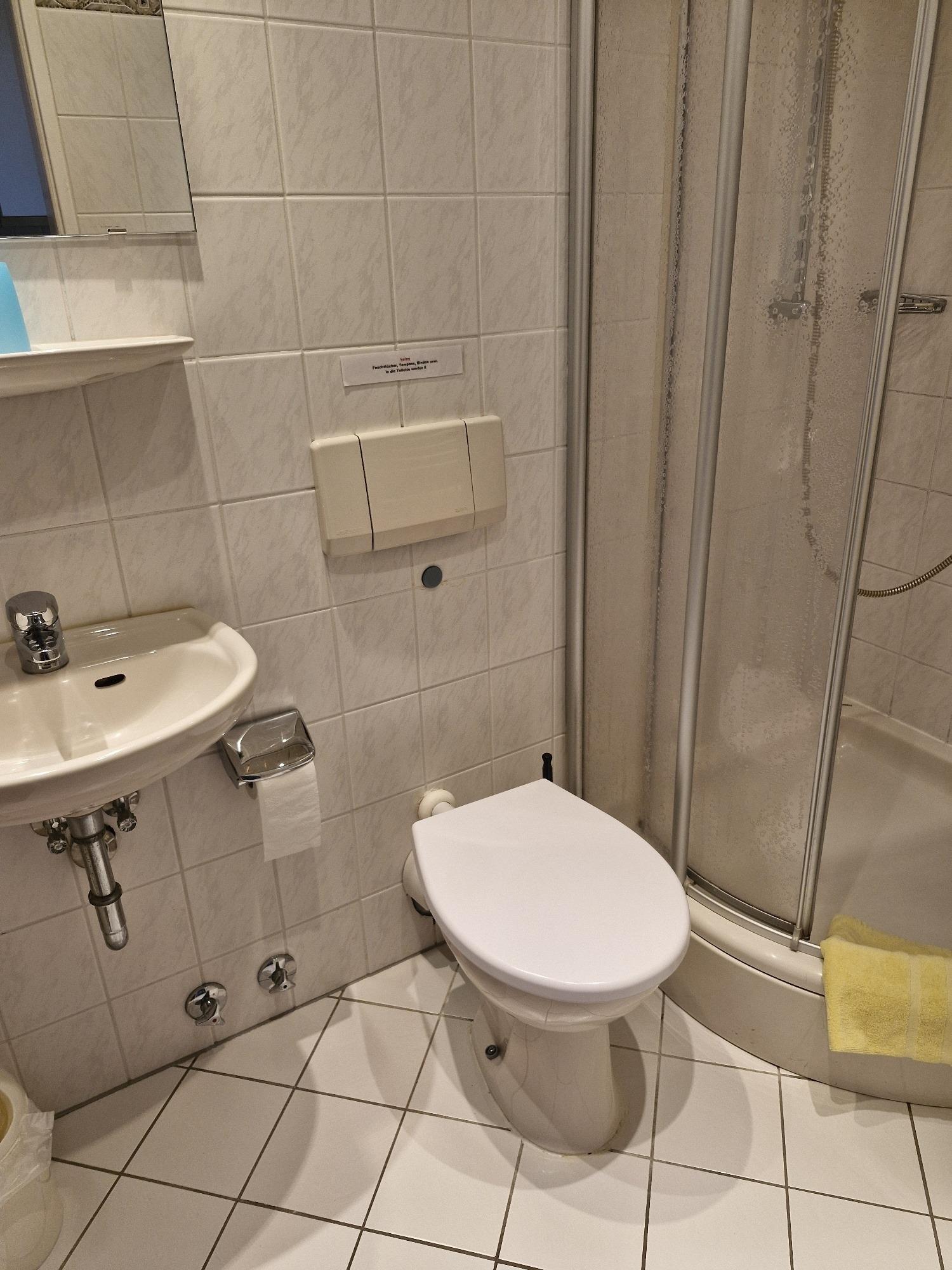Das Badezimmer ist funktional ausgestattet und verfügt über Dusche und WC.
