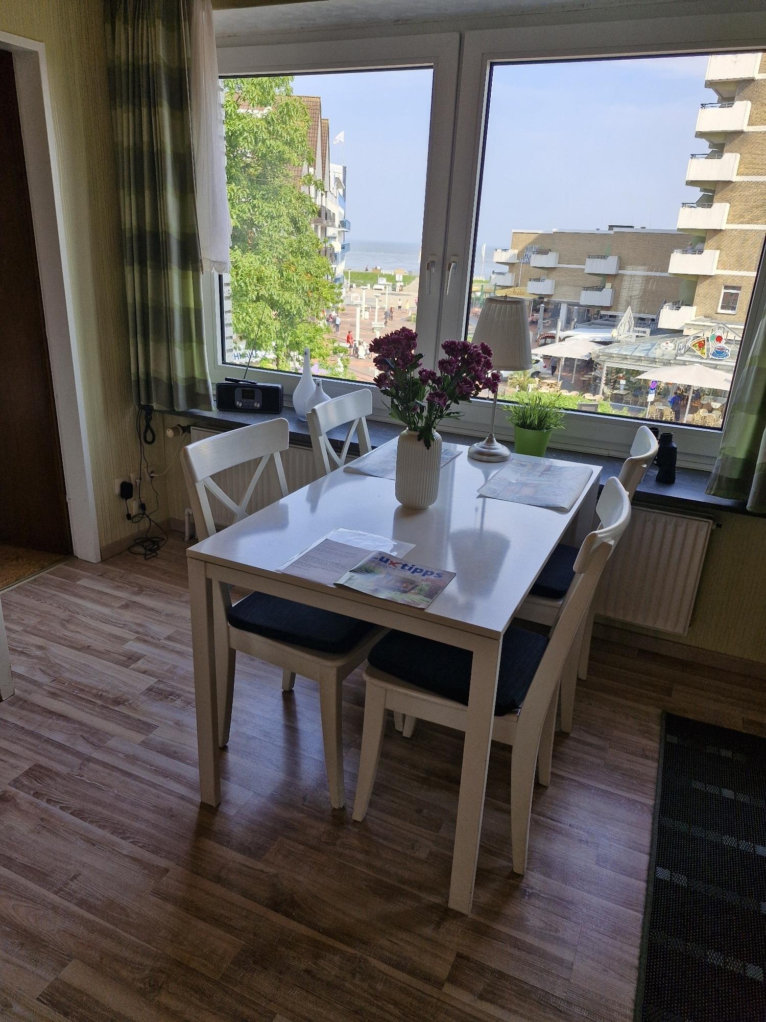 Der Wohnbereich ist freundlich gestaltet und bildet den Mittelpunkt der Wohnung. Ein großzügiges Fenster zur Nordseite eröffnet einen lebendigen Blick auf die Fußgängerzone Strandstraße, die Nordsee sowie – bei guter Sicht – auf die vorbeiziehenden Schiffe in der Elbfahrrinne. Von der gemütlichen Sitzecke ebenso wie vom Essplatz aus lässt sich das maritime Geschehen entspannt beobachten.