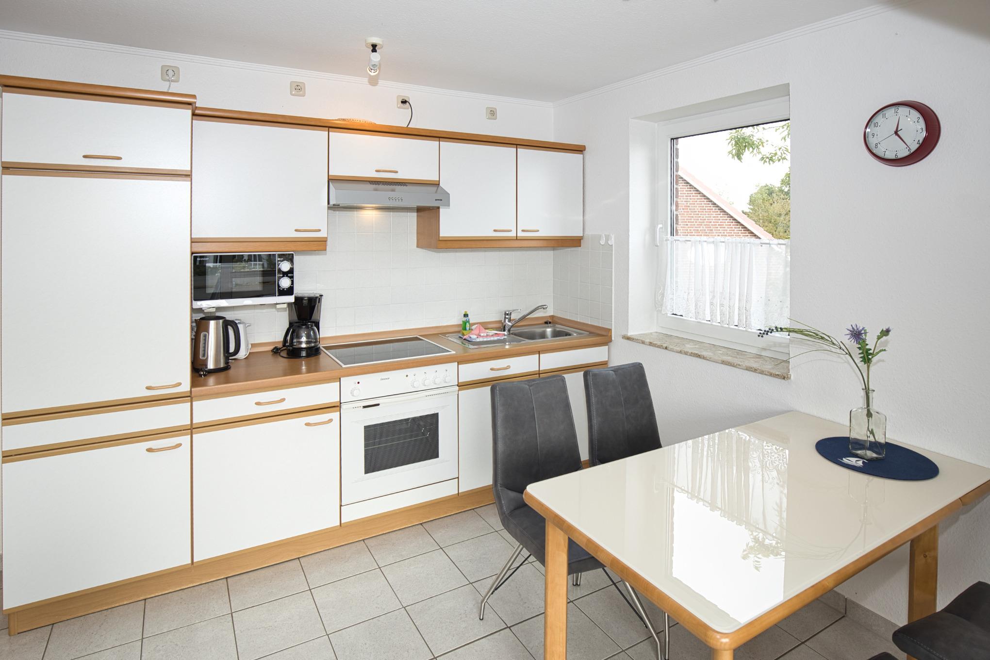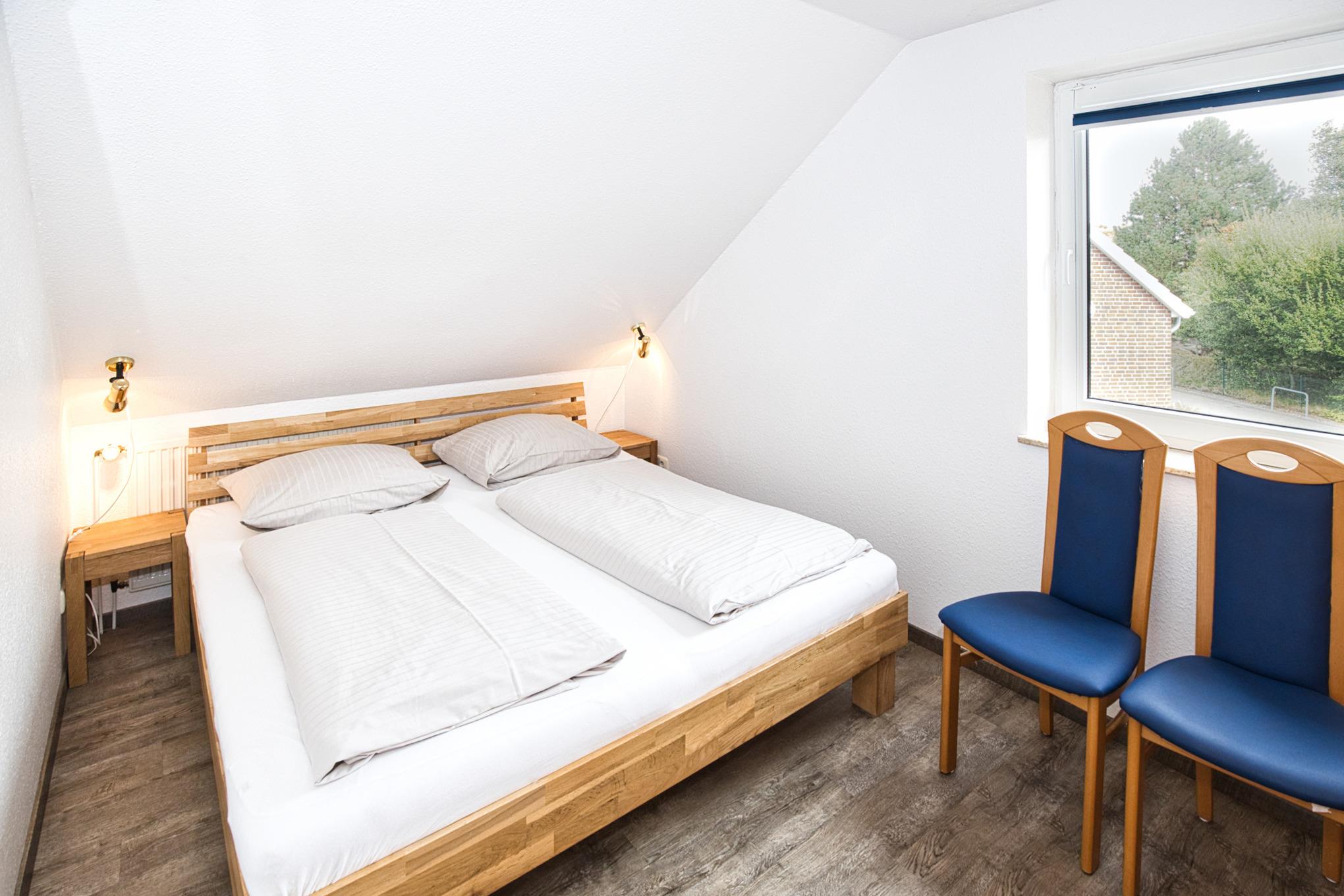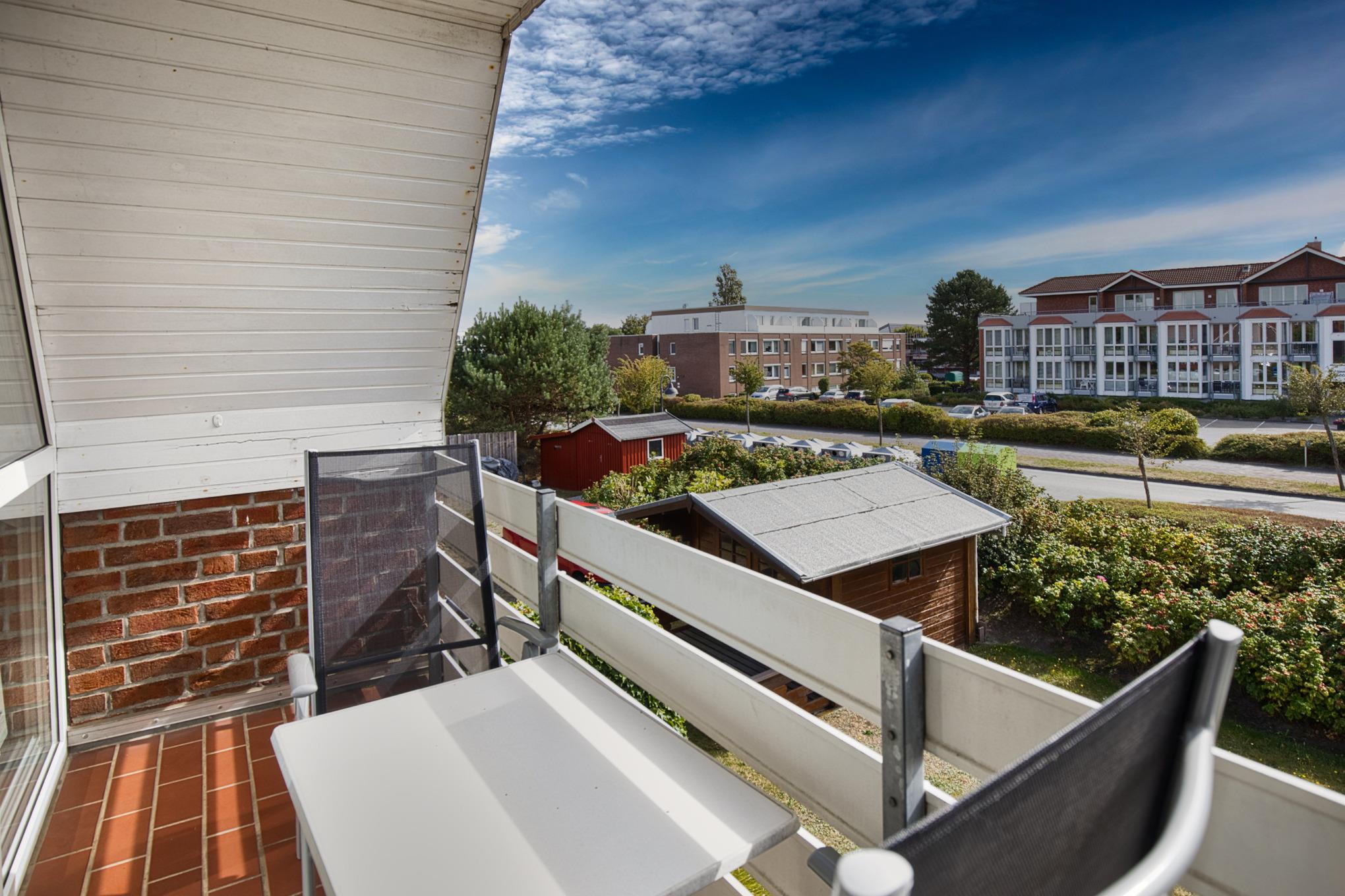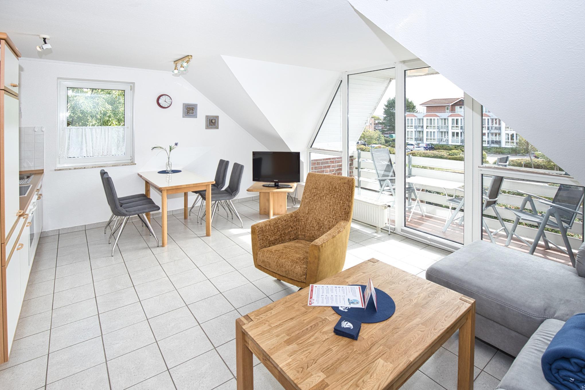 Maike 15b, 3-Raum, ca. 54m², 1.OG, bis zu 3 Personen. Die gemütlich ausgestattete Ferienwohnung empfängt Sie im 1.OG und ist aufgeteilt mit einem kleinen Flur, Duschbad/WC, Schlafzimmer mit Doppelbett, einem weiteren kleinen Schlafbereich mit einem Einzelbett. dieser Bereich ist ebenfalls durch eine Tür getrennt und vom Flur aus erreichbar. Des Weiteren ein Wohnbereich mit großem Esstisch und der gut ausgestatteten Einbauküche. Vom Wohnbereich geht es auf den sonnigen Süd Balkon (mit Balkonmöbeln). Die Wohnung hat einen eigenen Eingang mit einer direkt dahinterliegende Treppe zum 1. OG, in die Wohnung.