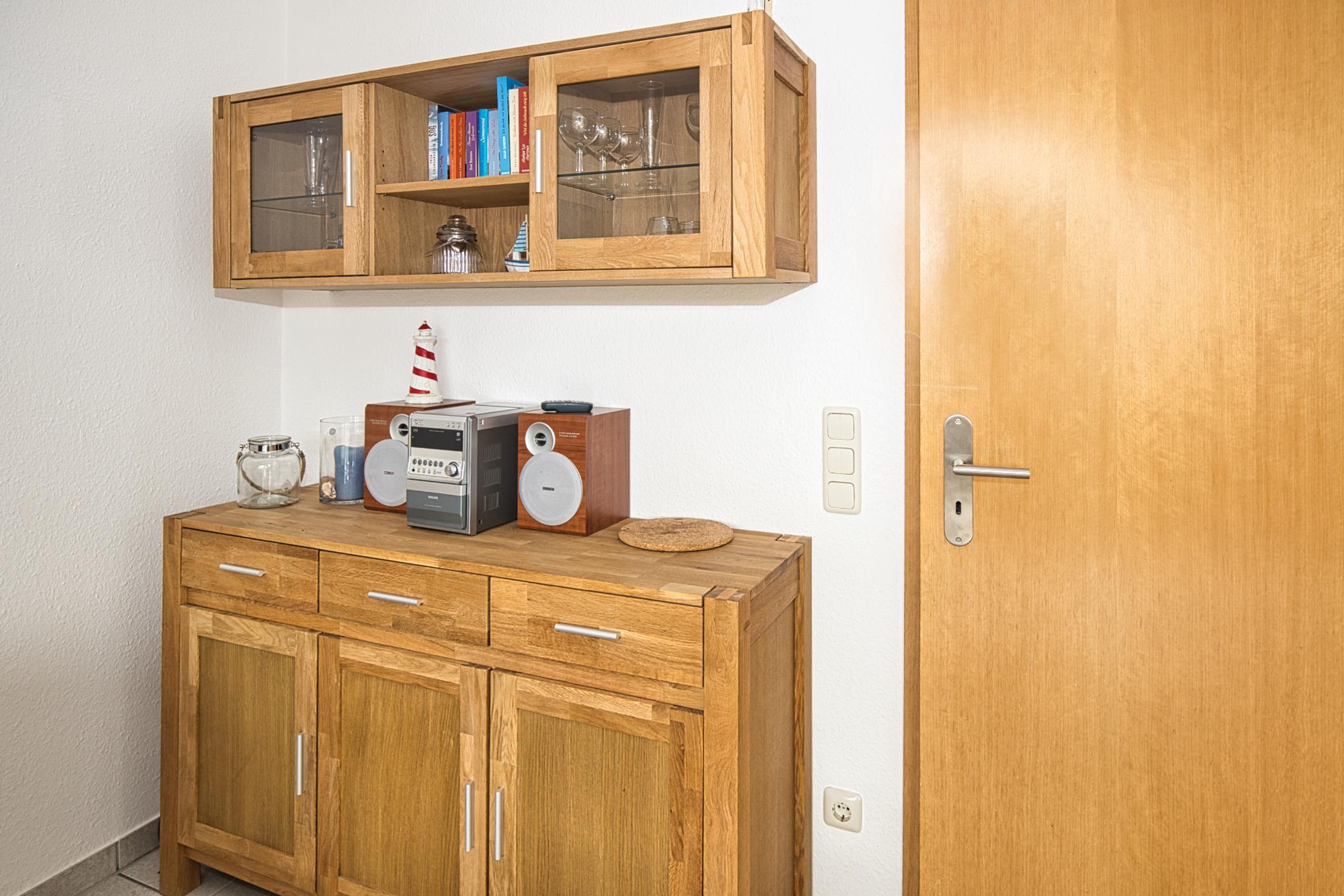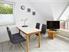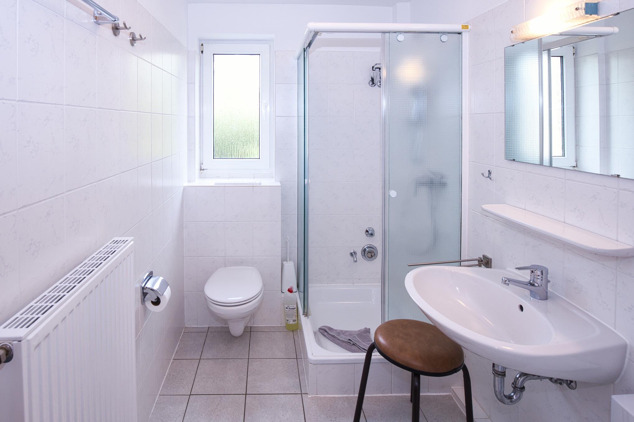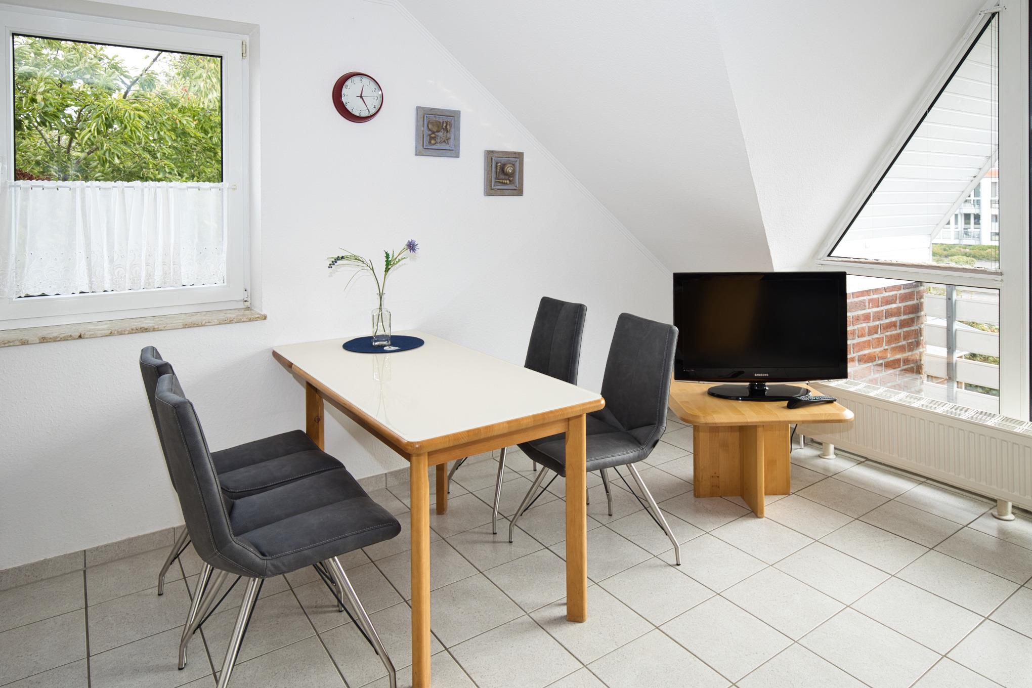 Maike 15b, 3-Raum, ca. 54m², 1.OG, bis zu 3 Personen. Die gemütlich ausgestattete Ferienwohnung empfängt Sie im 1.OG und ist aufgeteilt mit einem kleinen Flur, Duschbad/WC, Schlafzimmer mit Doppelbett, einem weiteren kleinen Schlafbereich mit einem Einzelbett. dieser Bereich ist ebenfalls durch eine Tür getrennt und vom Flur aus erreichbar. Des Weiteren ein Wohnbereich mit großem Esstisch und der gut ausgestatteten Einbauküche. Vom Wohnbereich geht es auf den sonnigen Süd Balkon (mit Balkonmöbeln). Die Wohnung hat einen eigenen Eingang mit einer direkt dahinterliegende Treppe zum 1. OG, in die Wohnung.