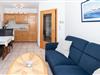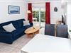 Die Wohnung verfügt über ein separates Schlafzimmer mit einem gemütlichen Doppelbett sowie ein "Kinderzimmer" mit zwei Einzelbetten. Ein helles Duschbad/WC steht zur Verfügung. Der Wohnbereich ist einladend gestaltet und bietet Zugang zur sonnigen Terrasse, die mit Terrassenmöbeln ausgestattet ist und zum Verweilen einlädt. Der Essbereich grenzt an die komfortable Einbauküche, die mit allem Notwendigen ausgestattet ist.