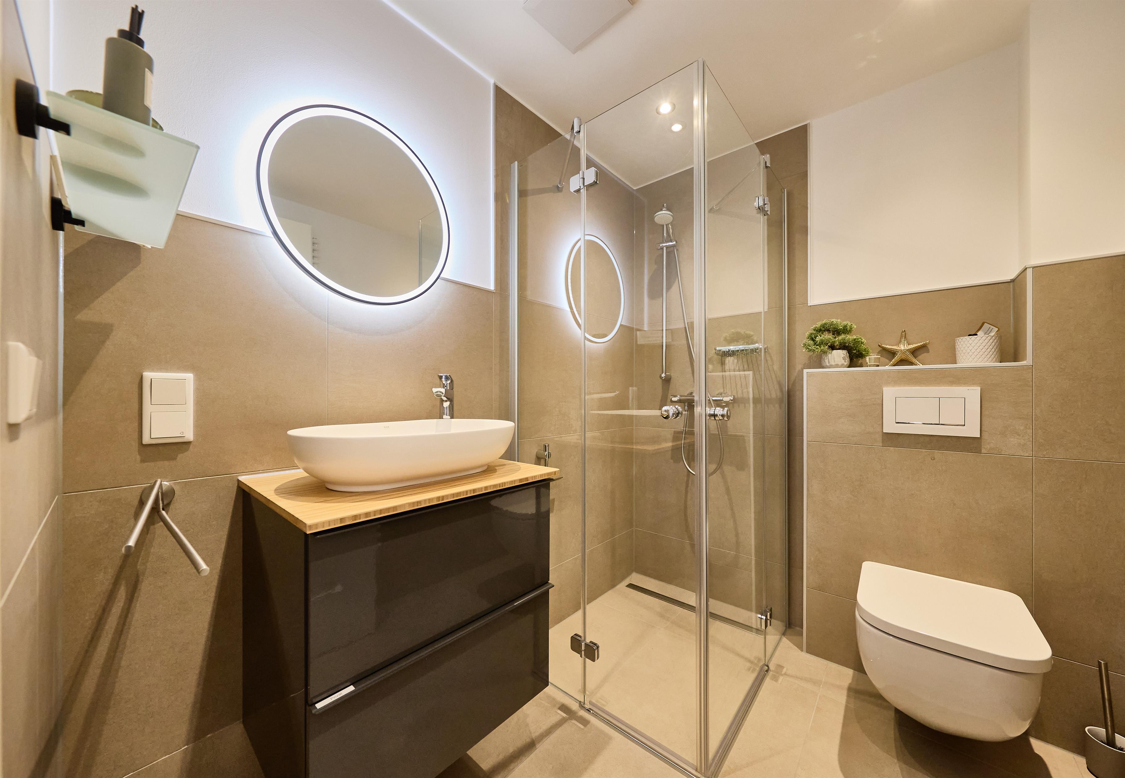 Modernes Badezimmer mit ebenerdiger Dusche und Handtuchheizkörper