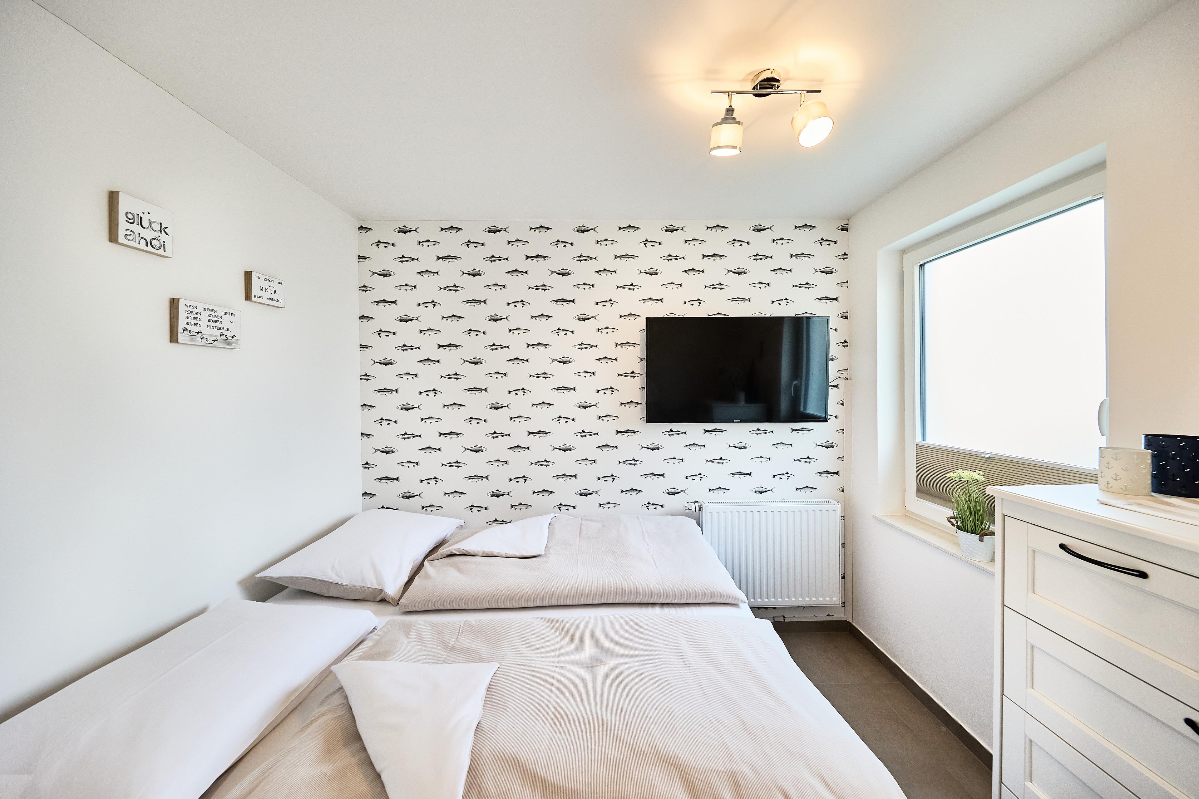 Schlafzimmer mit komfortablem Boxspringbett (180×200?cm) und zusätzlichem Flachbild-TV