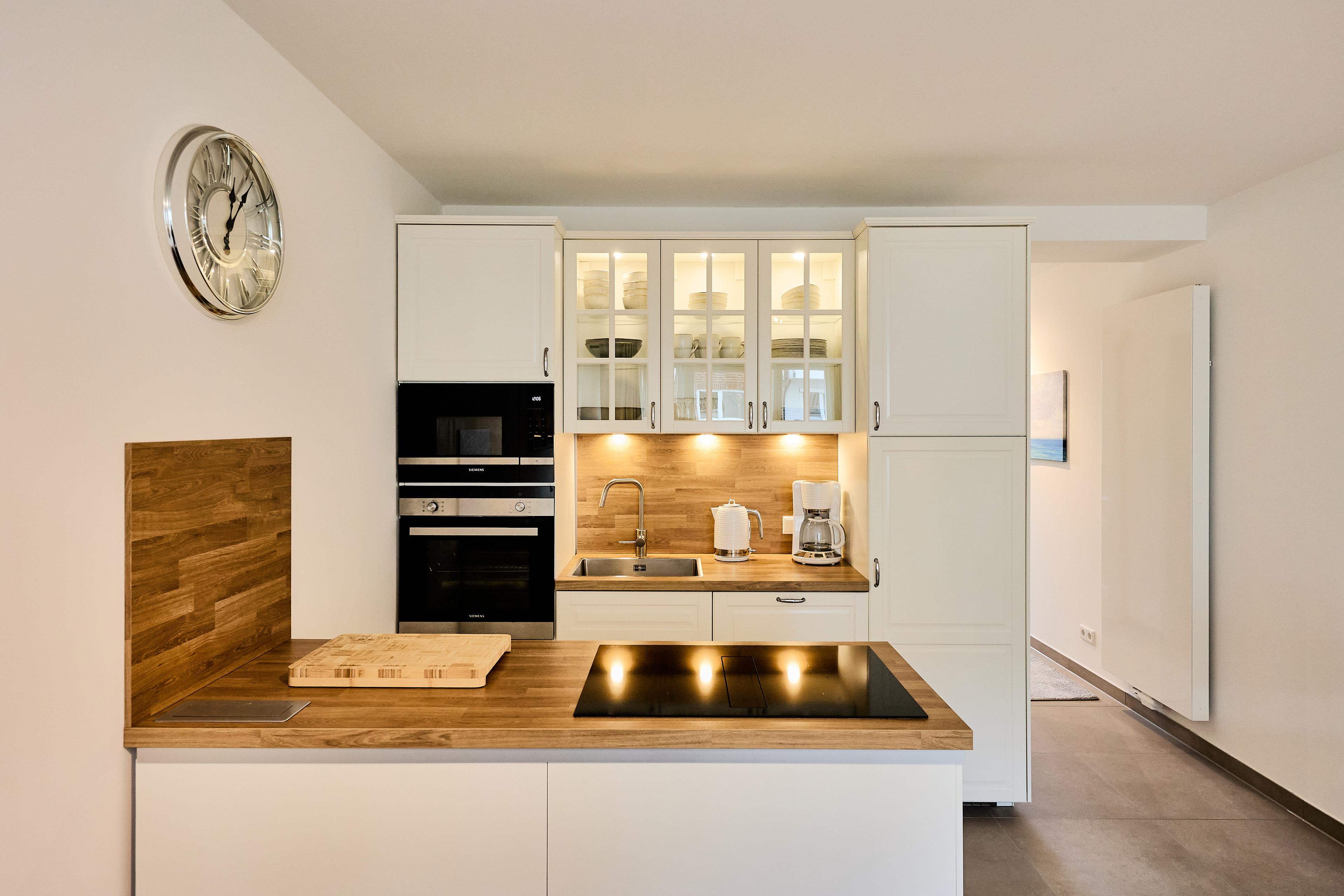 Separate, moderne Einbauküche mit Kochinsel: Induktionskochfeld mit integriertem Abzug, Backofen, Mikrowelle, Geschirrspüler, Kühlschrank mit Gefrierfach, eingelassene Steckdosenleiste