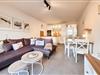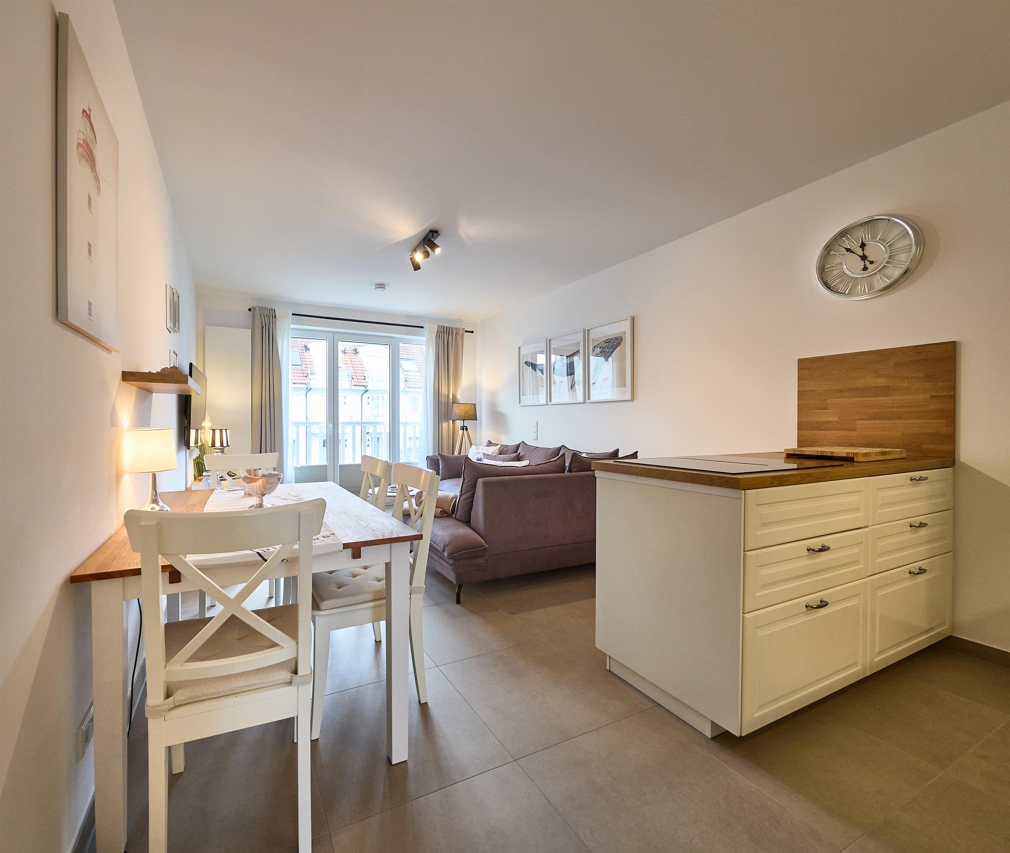 Heller Wohnbereich mit gemütlichem Ecksofa, Flachbild-TV, Essplatz und Zugang zum Balkon