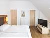 1x offenes Schlafzimmer mit Doppelbett und großem Dachfenster (verdunkelbar)