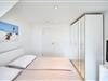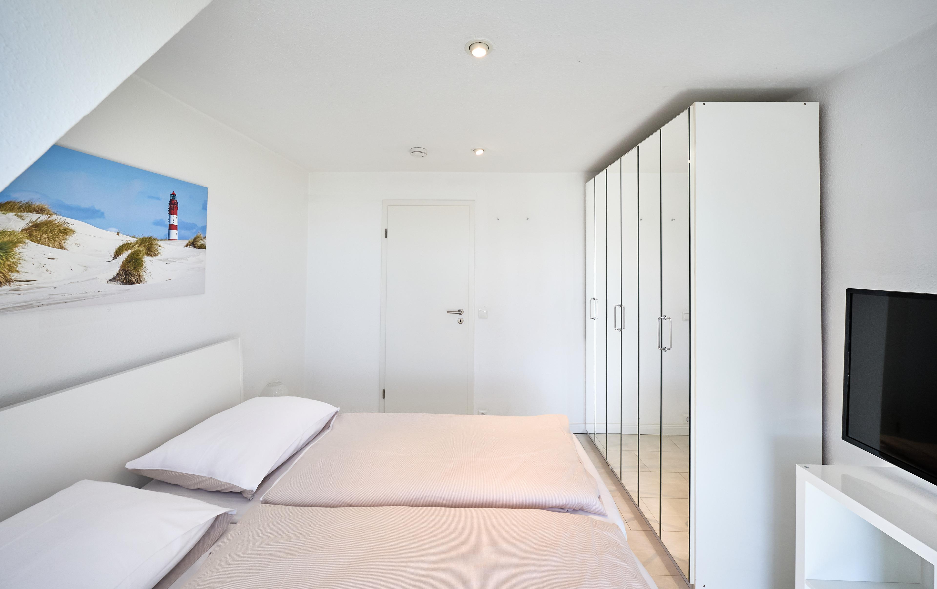 Das Schlafzimmer ist mit einem Doppelbett und einem großem Kleiderschrank, einem 2. TV und weiteren Annehmlichkeiten eingerichtet. Von hier aus kommen Sie auch auf einen kleinen Balkon, von dem man die Morgensonne genießen kann.