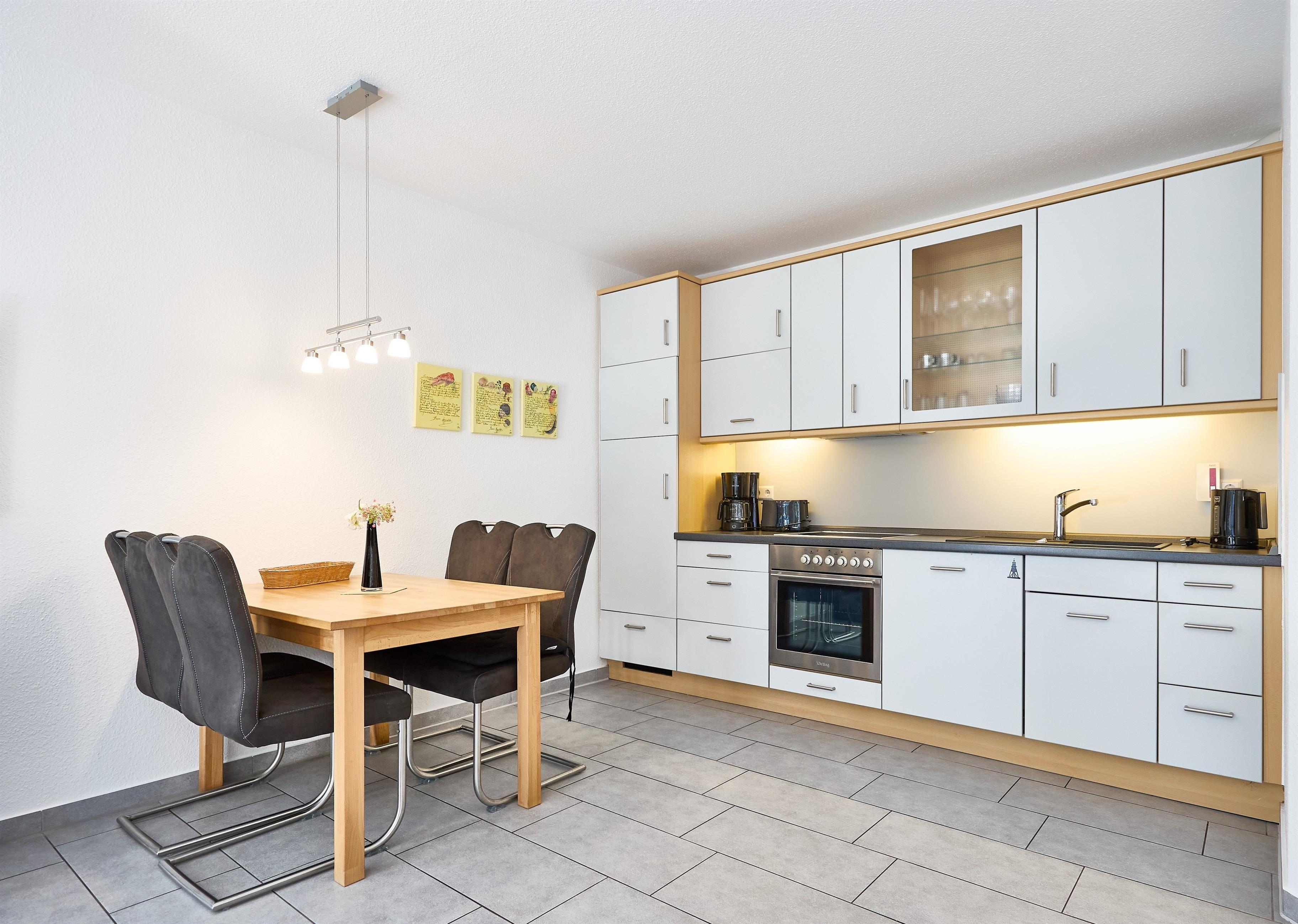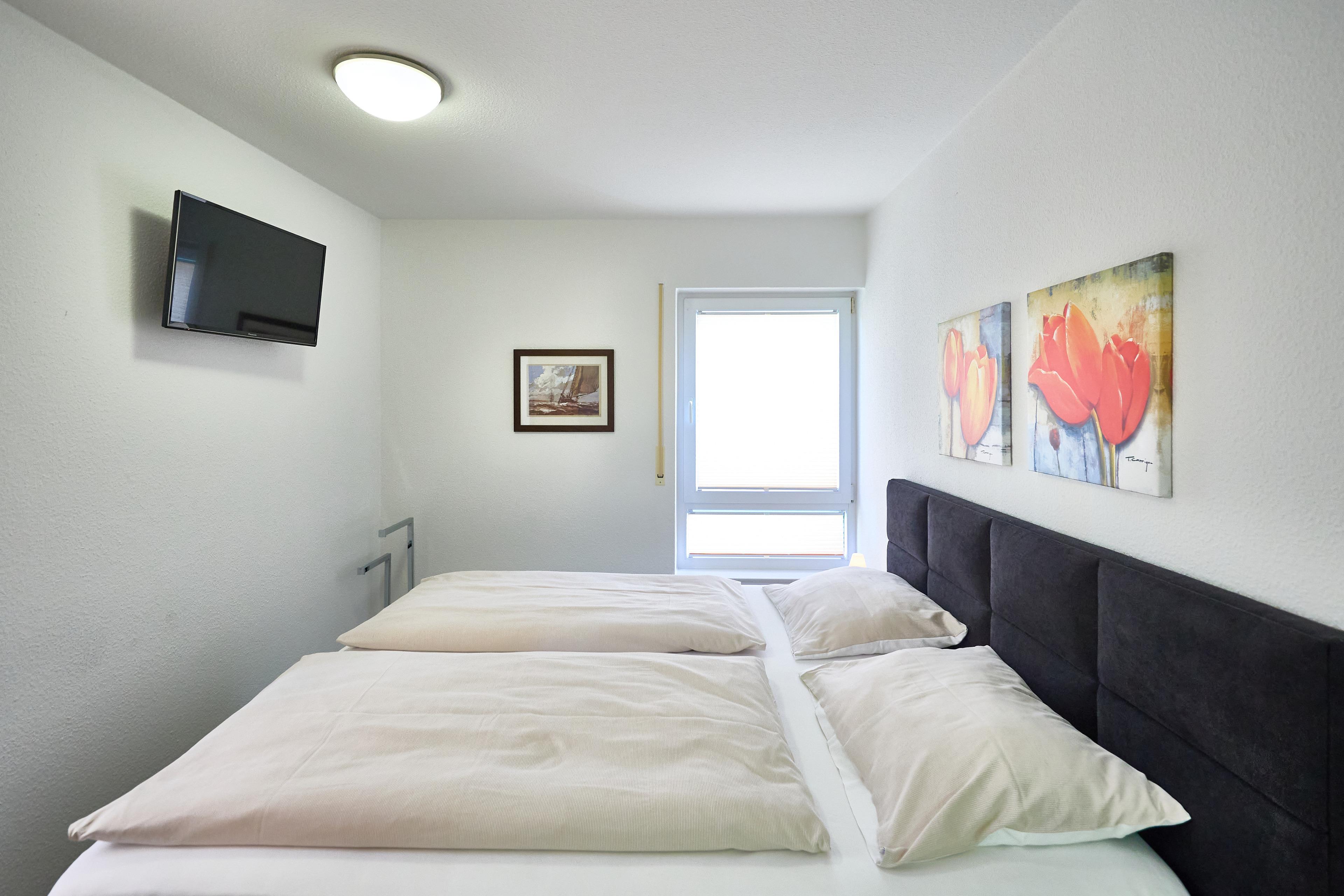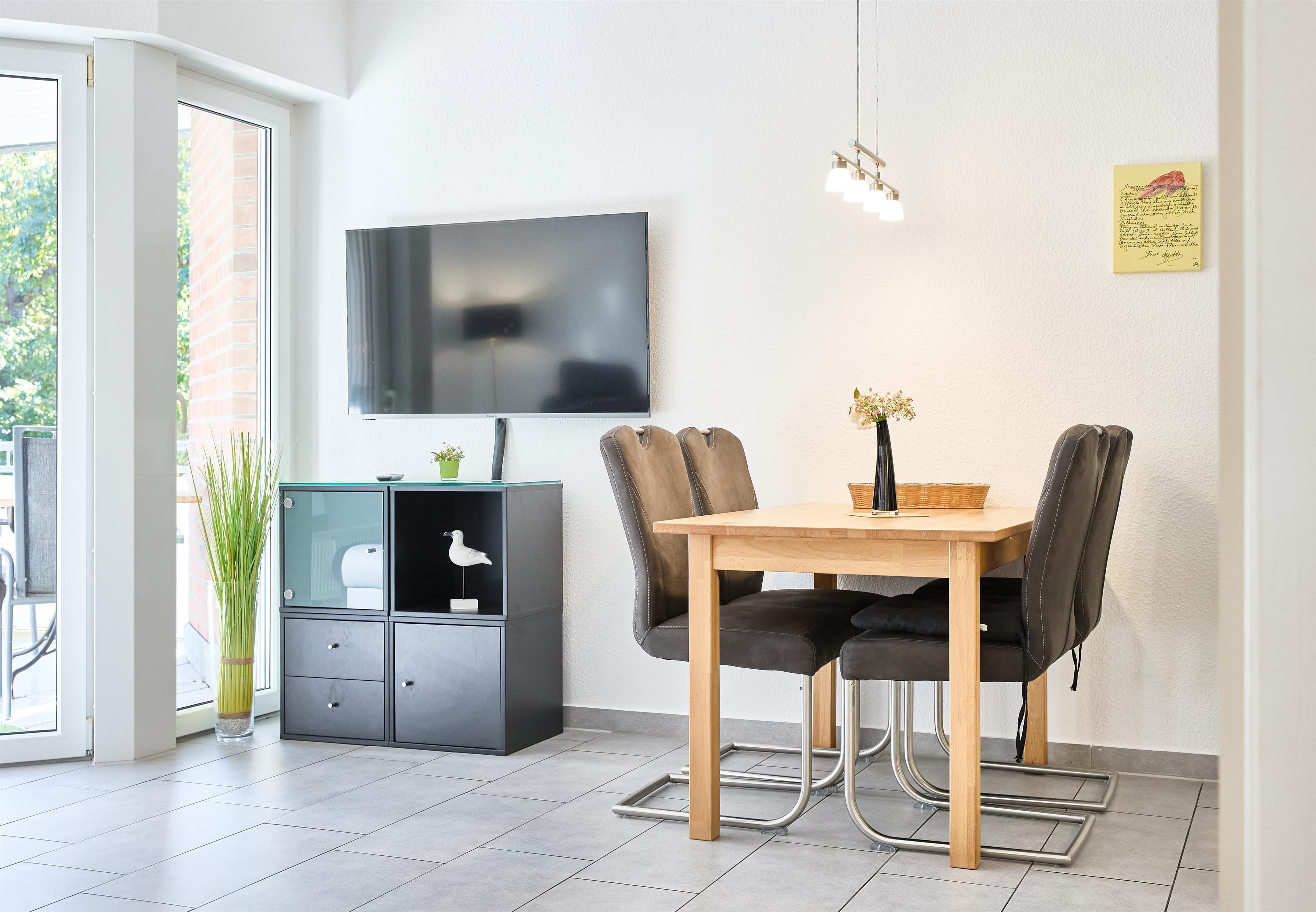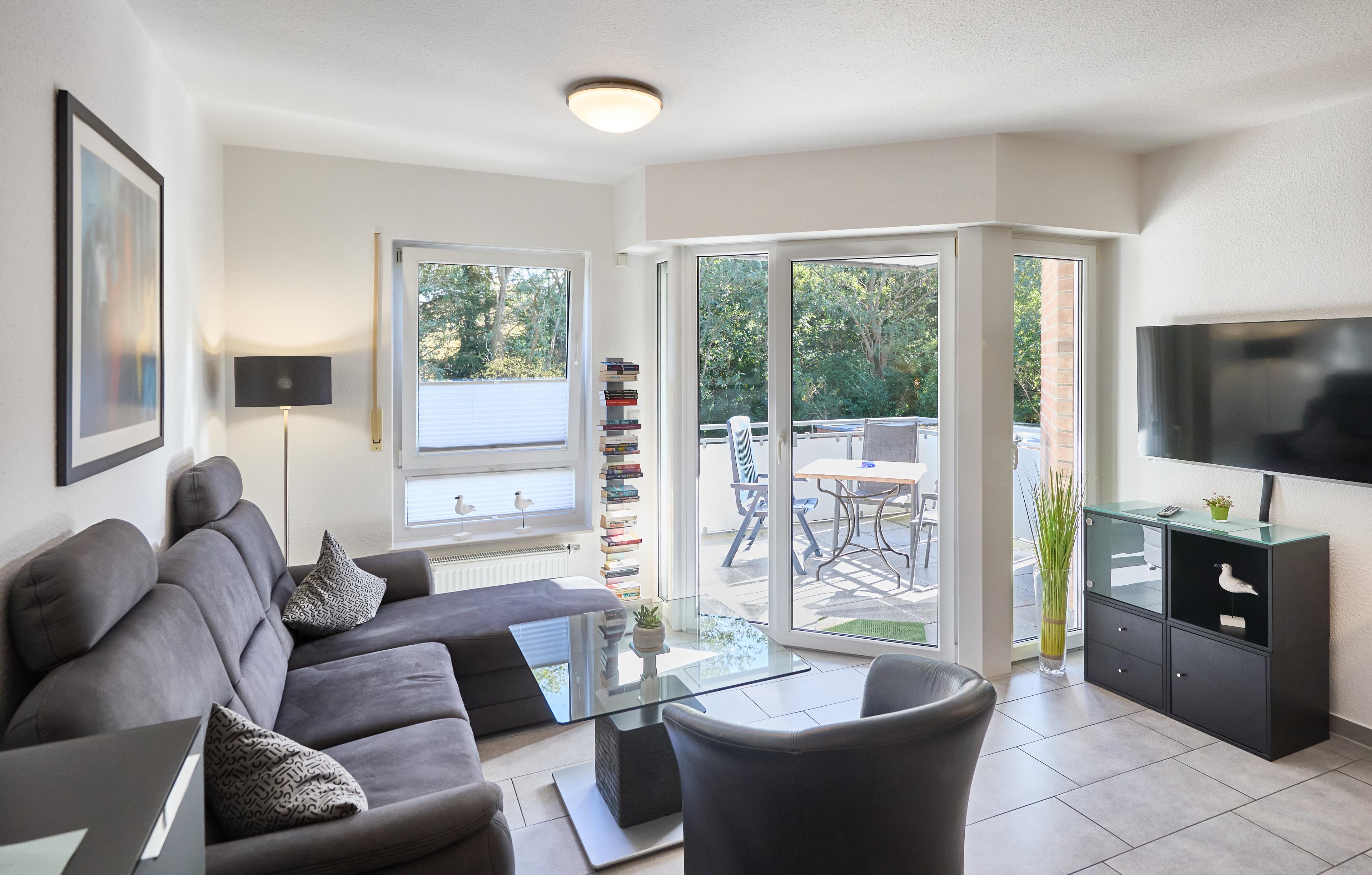 Strandburg, Whg. 5, 2-Raum, ca. 48m², 1.OG, mit Balkon und Blick ins Grüne (Süd/Ost Balkon), Strandkorb am Strand, bis zu 2[nbsp] Personen, hochwertig Urlauben. Diese sehr hochwertige Ferienwohnung (komplett allergikerfreundlich) ist mit einem gemütlichen Schlafzimmer mit großem Kleiderschrank und einem 2. TV, einem Duschbad (Dusche/WC mit Fenster), einem Abstellraum (für Ihre Koffer) aufgeteilt. Im Wohn- und Essbereich mit einer sehr gut ausgestatteten Einbauküche , einem großen Smart TV und Zugang zum Balkon können Sie den Tag genießen.