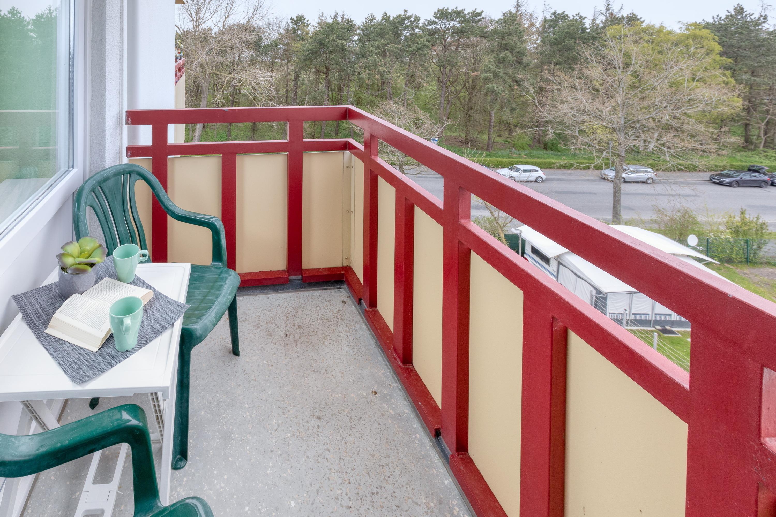 Das Apartment 66 ist ein 2-Raum-Apartment im 5. Obergeschoss für bis zu 4 Personen mit 38 qm. Der möblierte Ostbalkon bietet morgens Sonne und nachmittags Schatten.