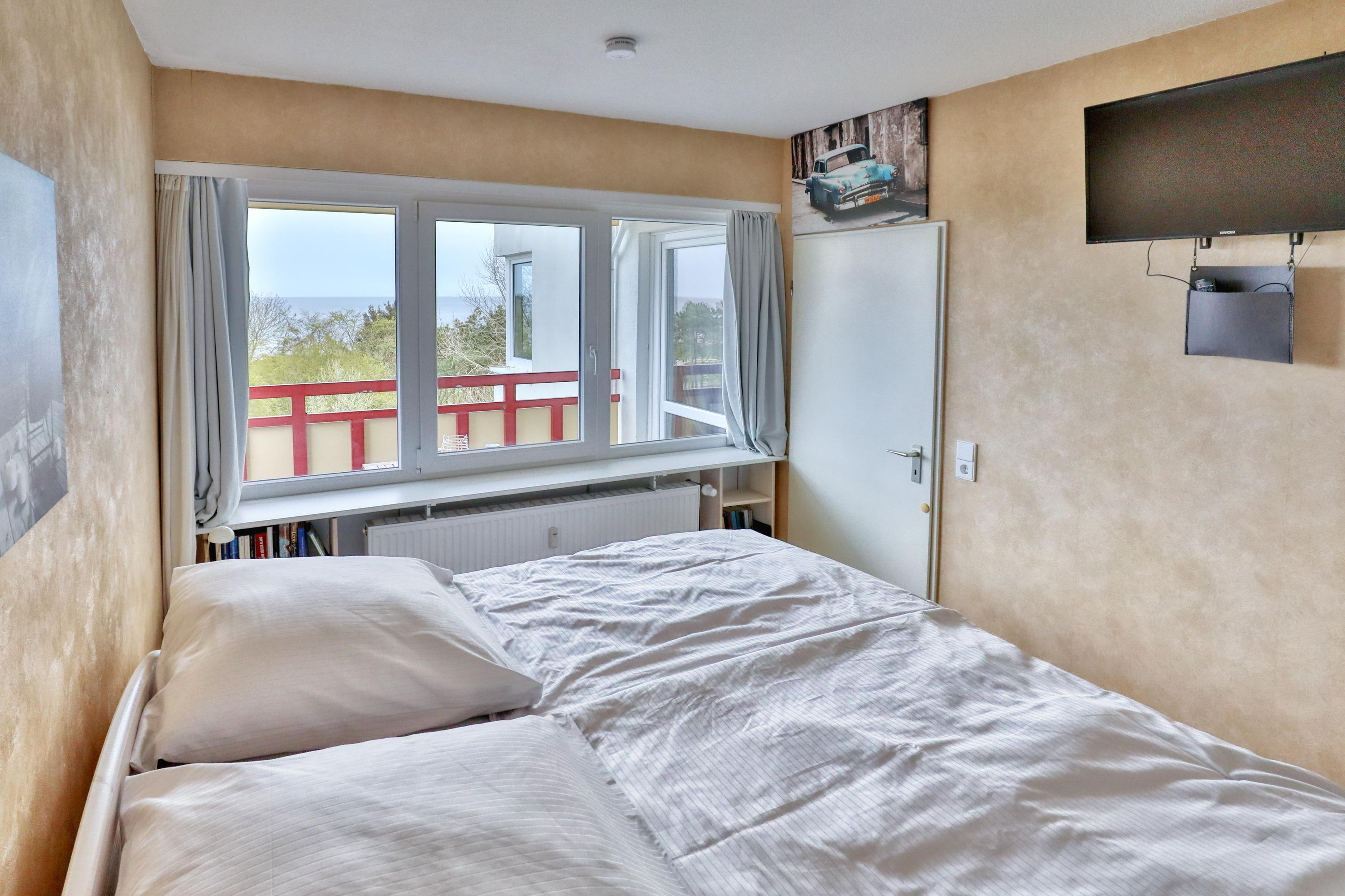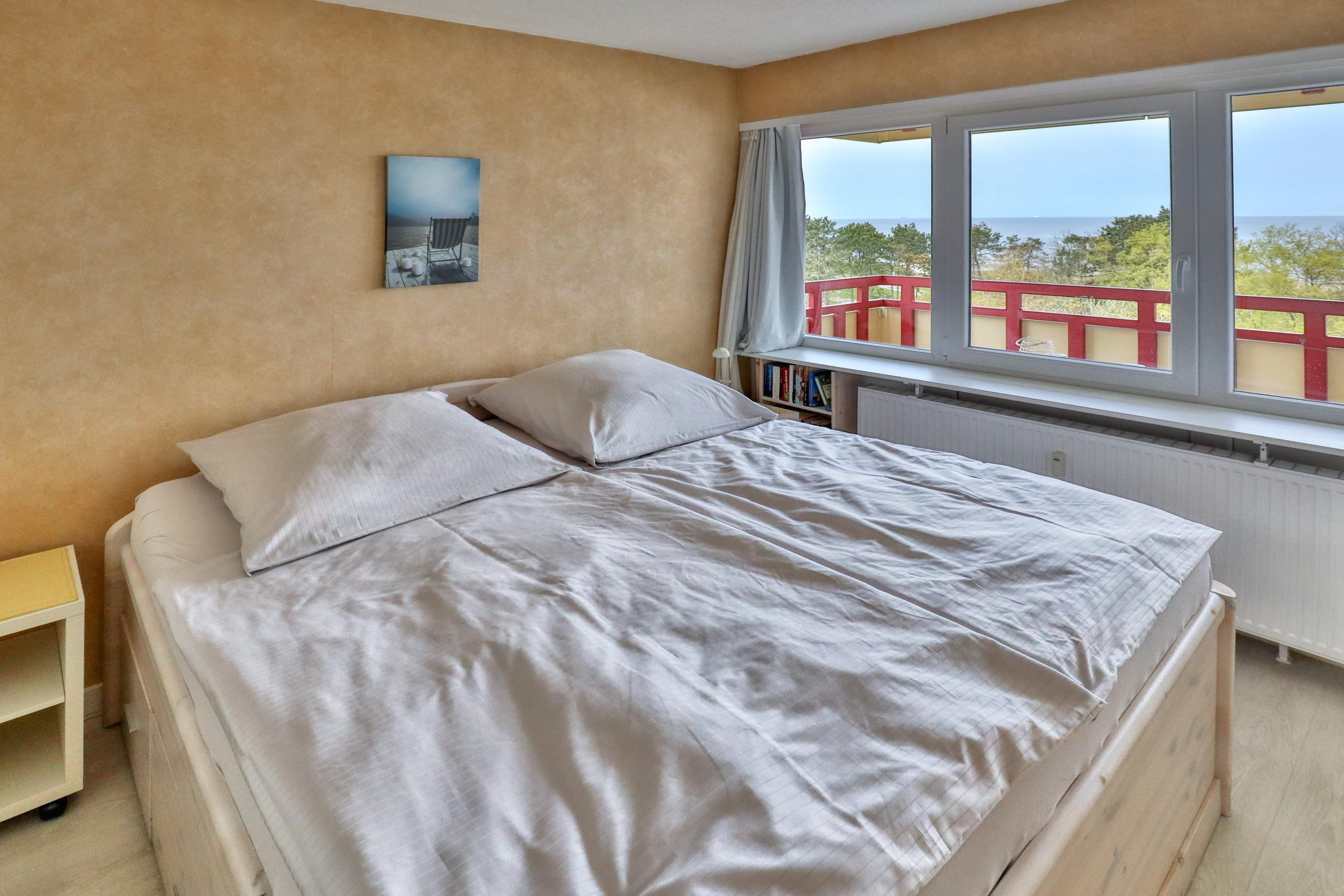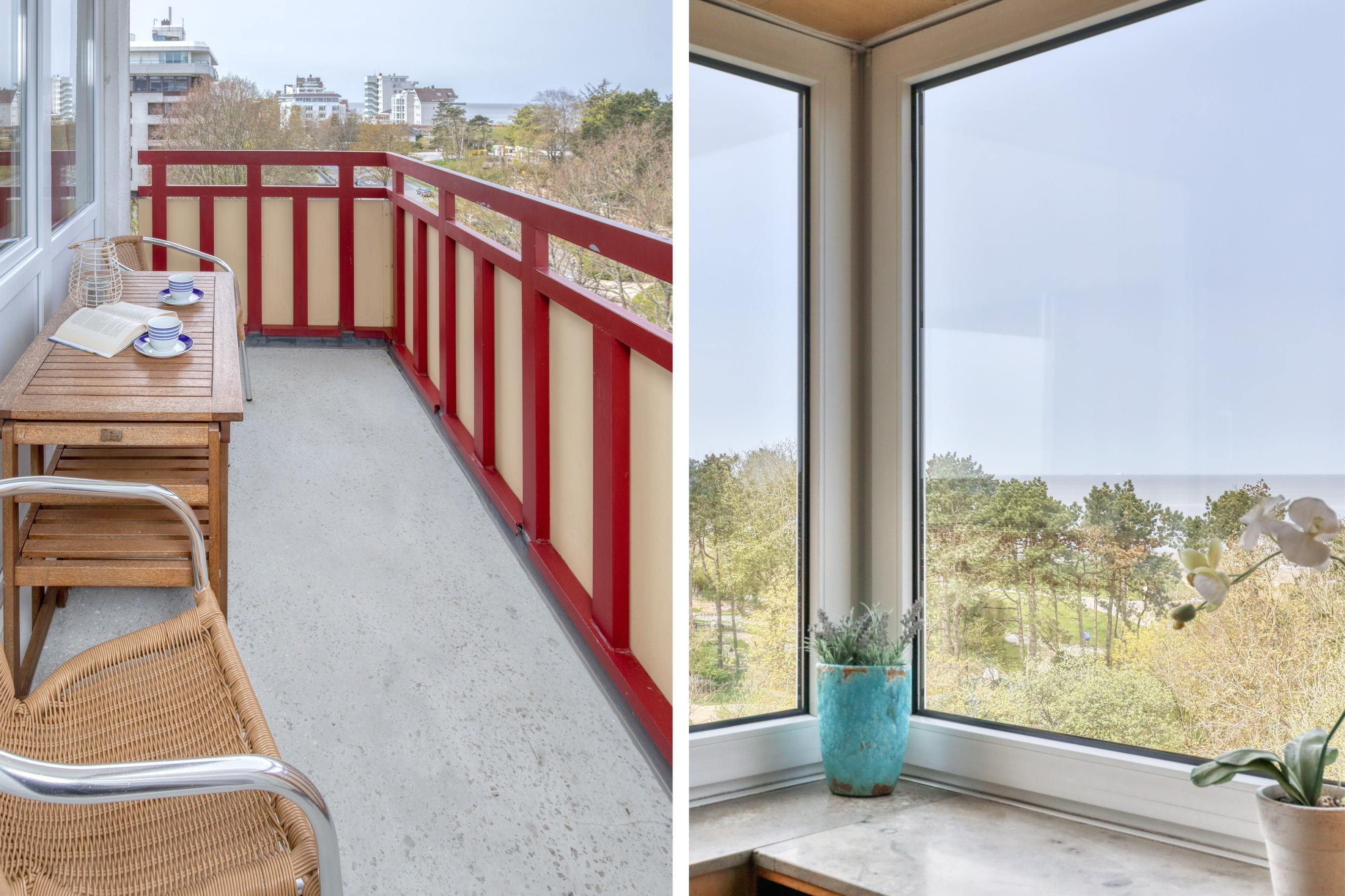 Das Apartment 76 ist ein 2-Raum-Apartment im 6. Obergeschoss für bis zu 3 Personen mit 39 qm. Der möblierte Westbalkon mit Meerblick bietet morgens Schatten und nachmittags Sonne.