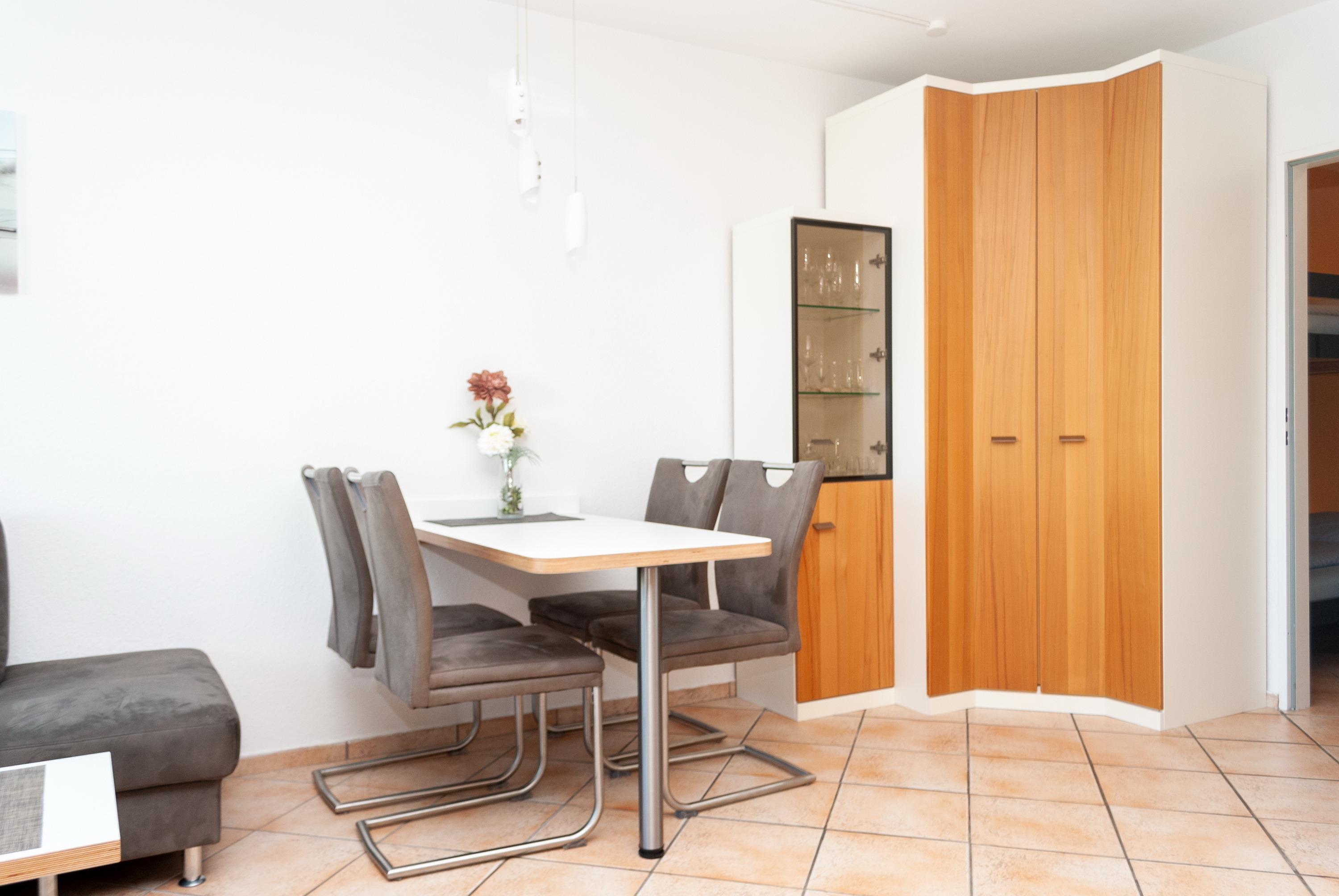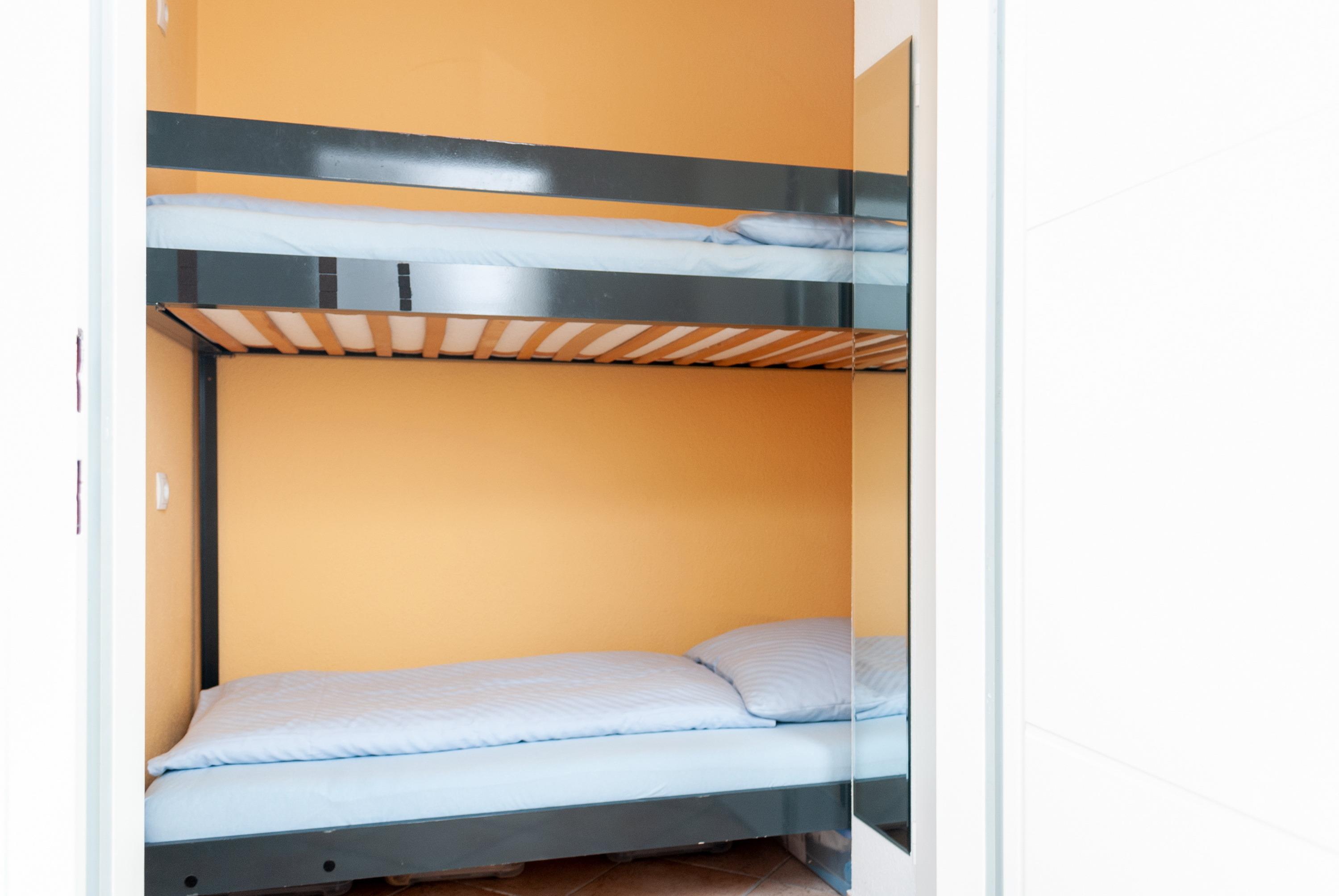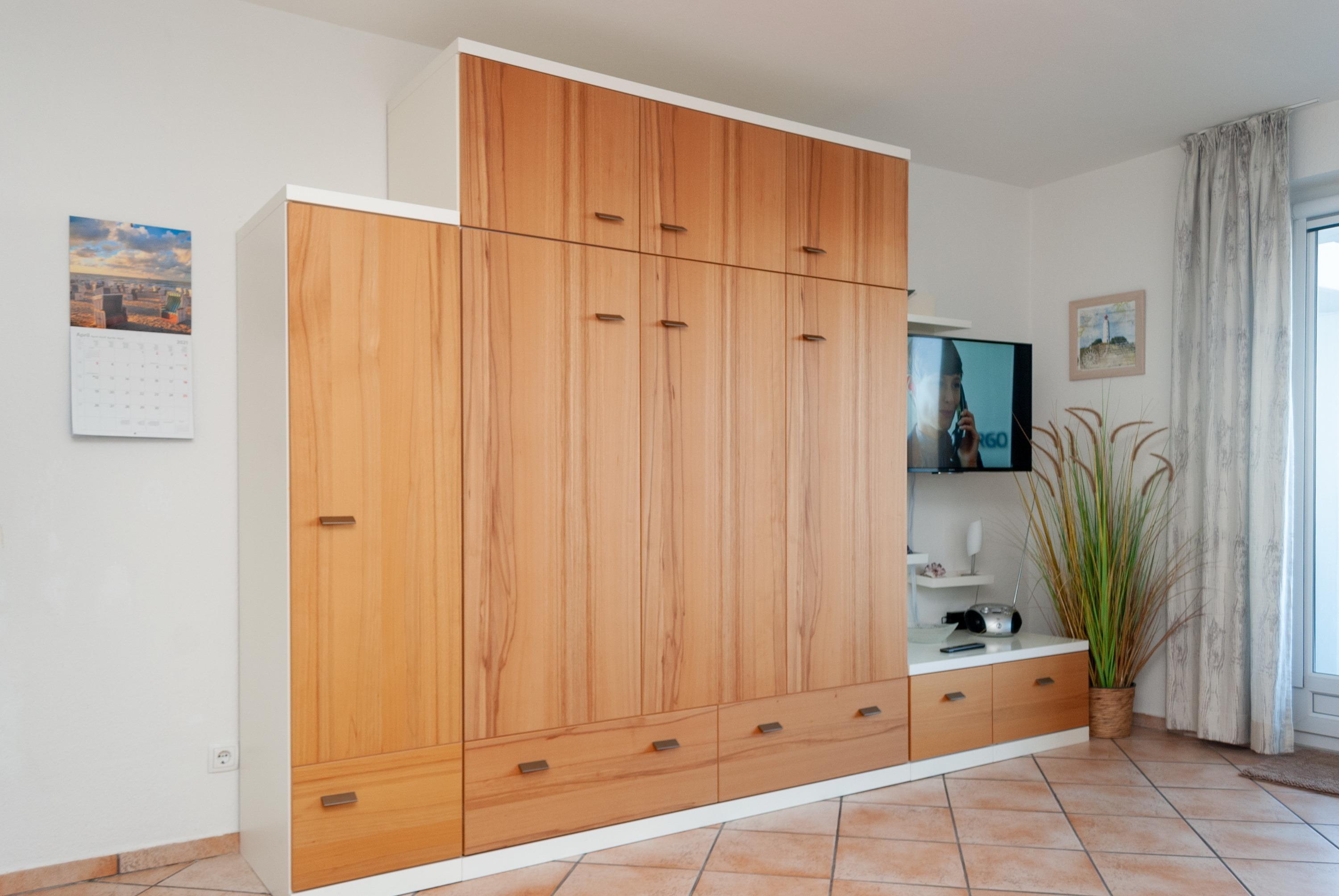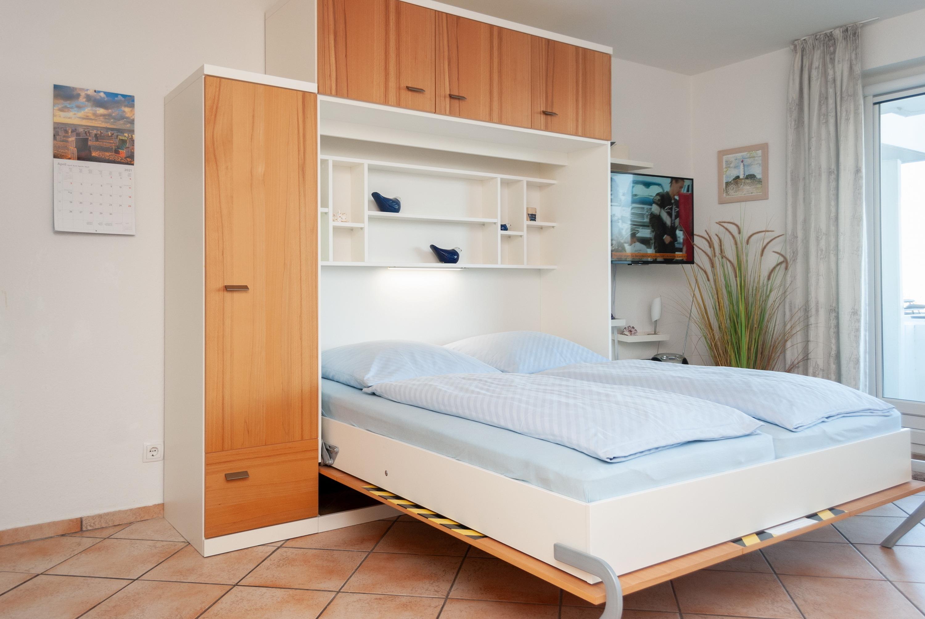 Das Apartment besteht aus einem Wohnbereich mit Schrankbett für 2 Personen ,einem zusätzlichem Etagenbett in einer Nische im Flur und einem Badezimmer mit Dusche sowie WC. Die Ferienwohnung beinhaltet eine voll ausgestattete offene Küche.
