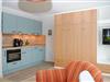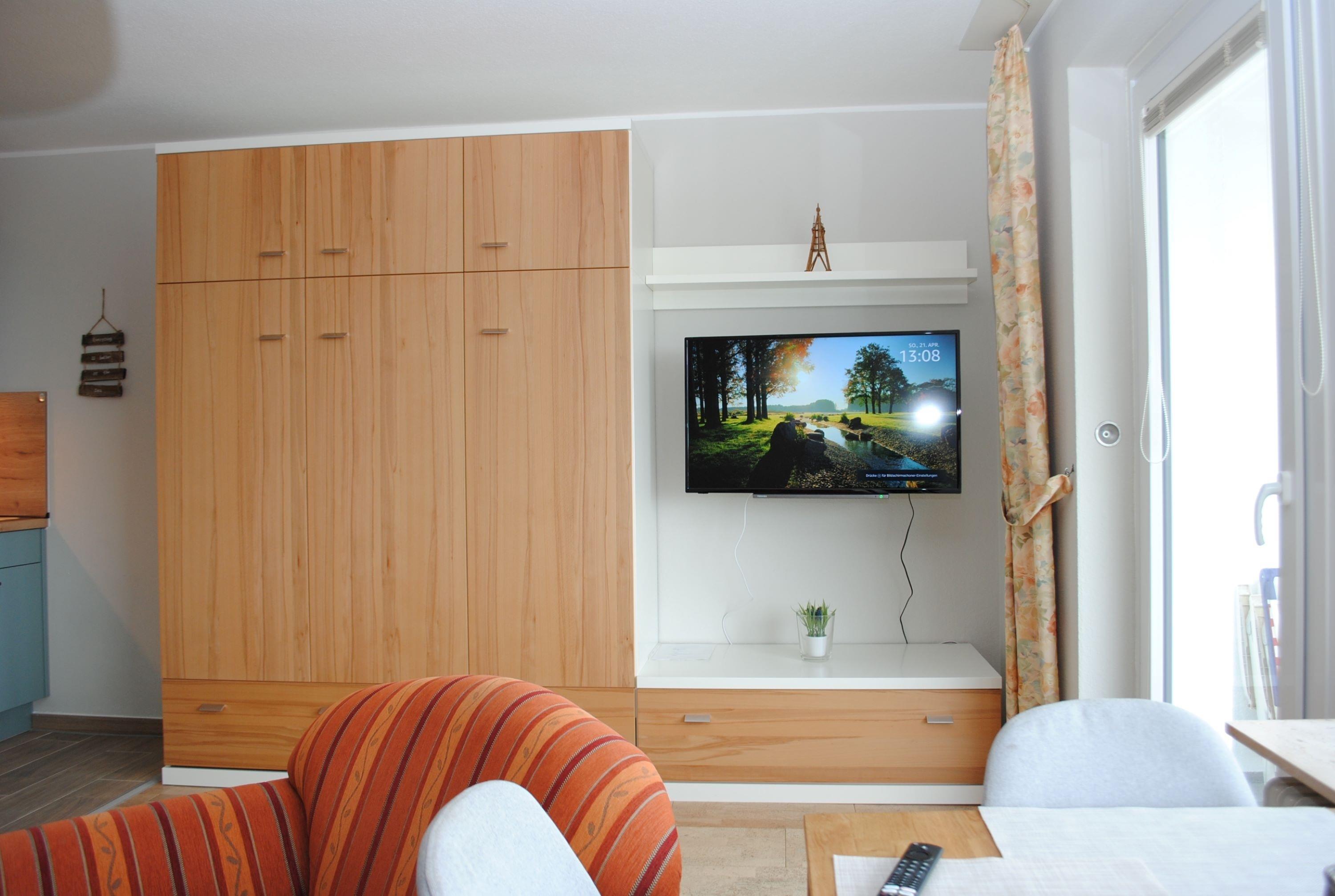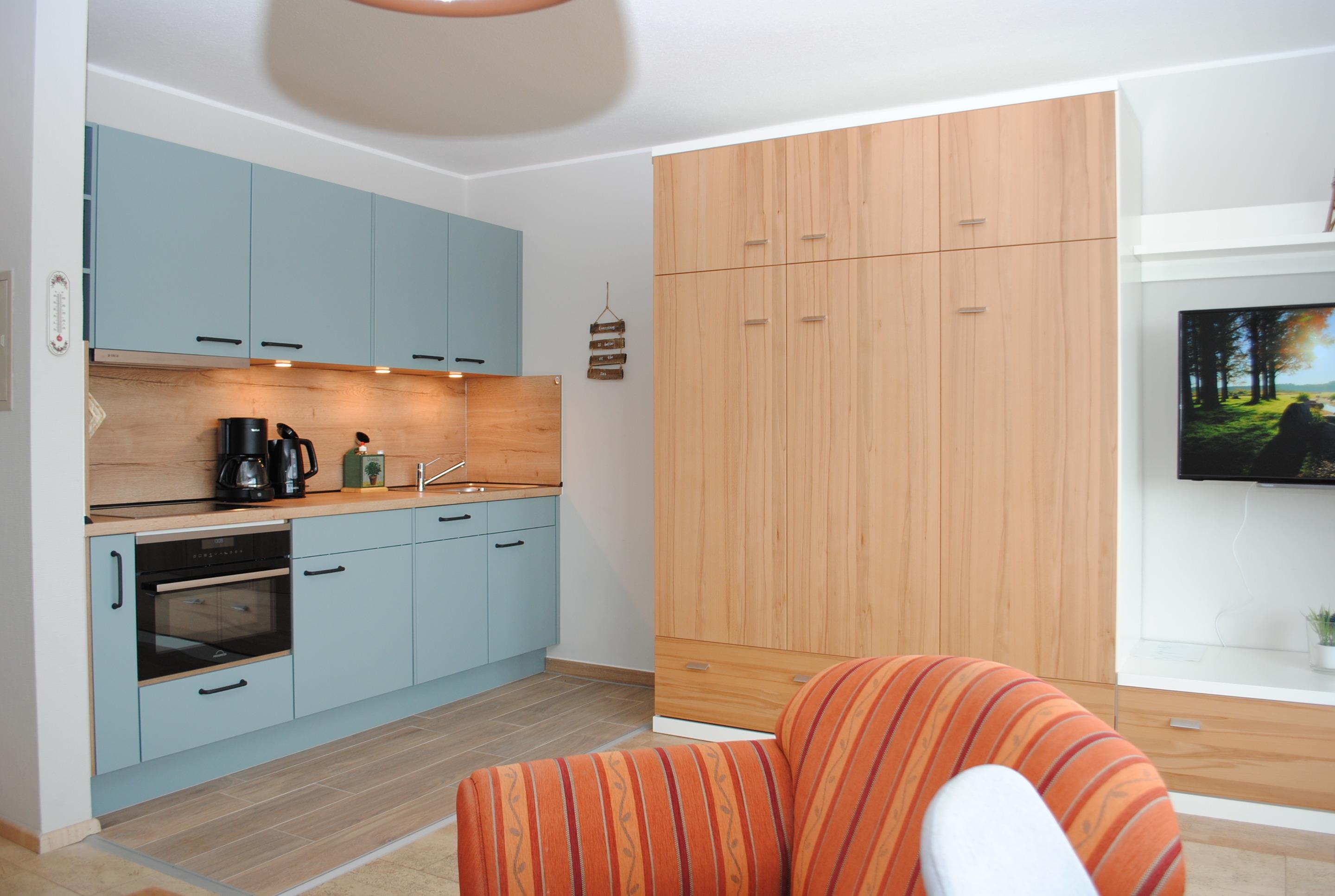 Das Apartment besteht aus einem Schlafzimmer mit 2 Einzelbetten, einem Wohnbereich mit zusätzlichem Schrankbett für 2 Personen und einem Badezimmer mit Dusche sowie WC. Die Ferienwohnung beinhaltet eine gut ausgestattete offene Küche.