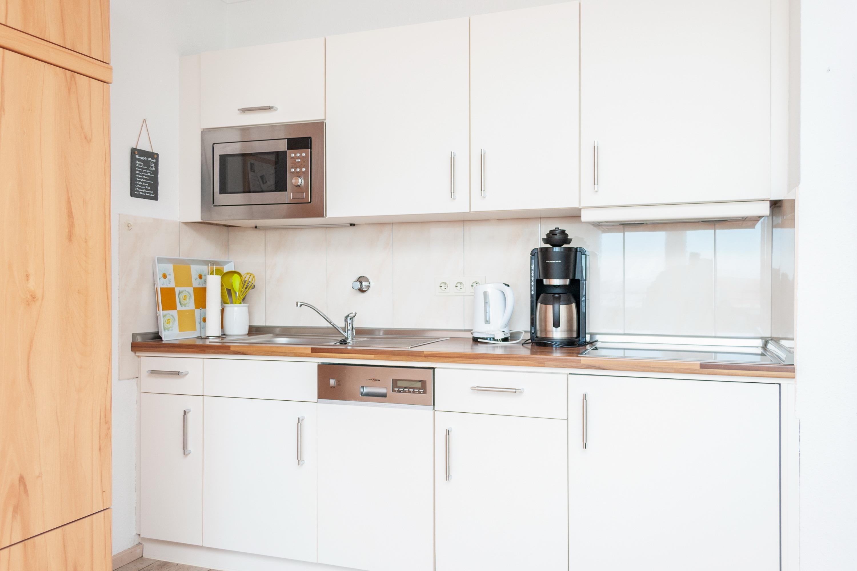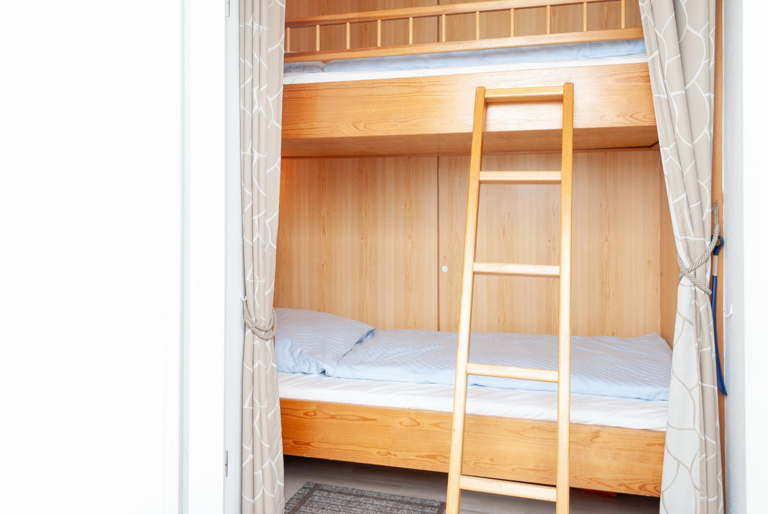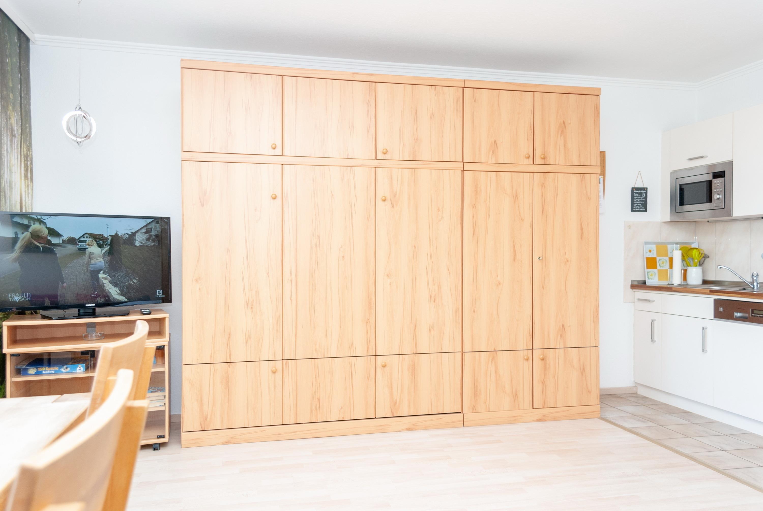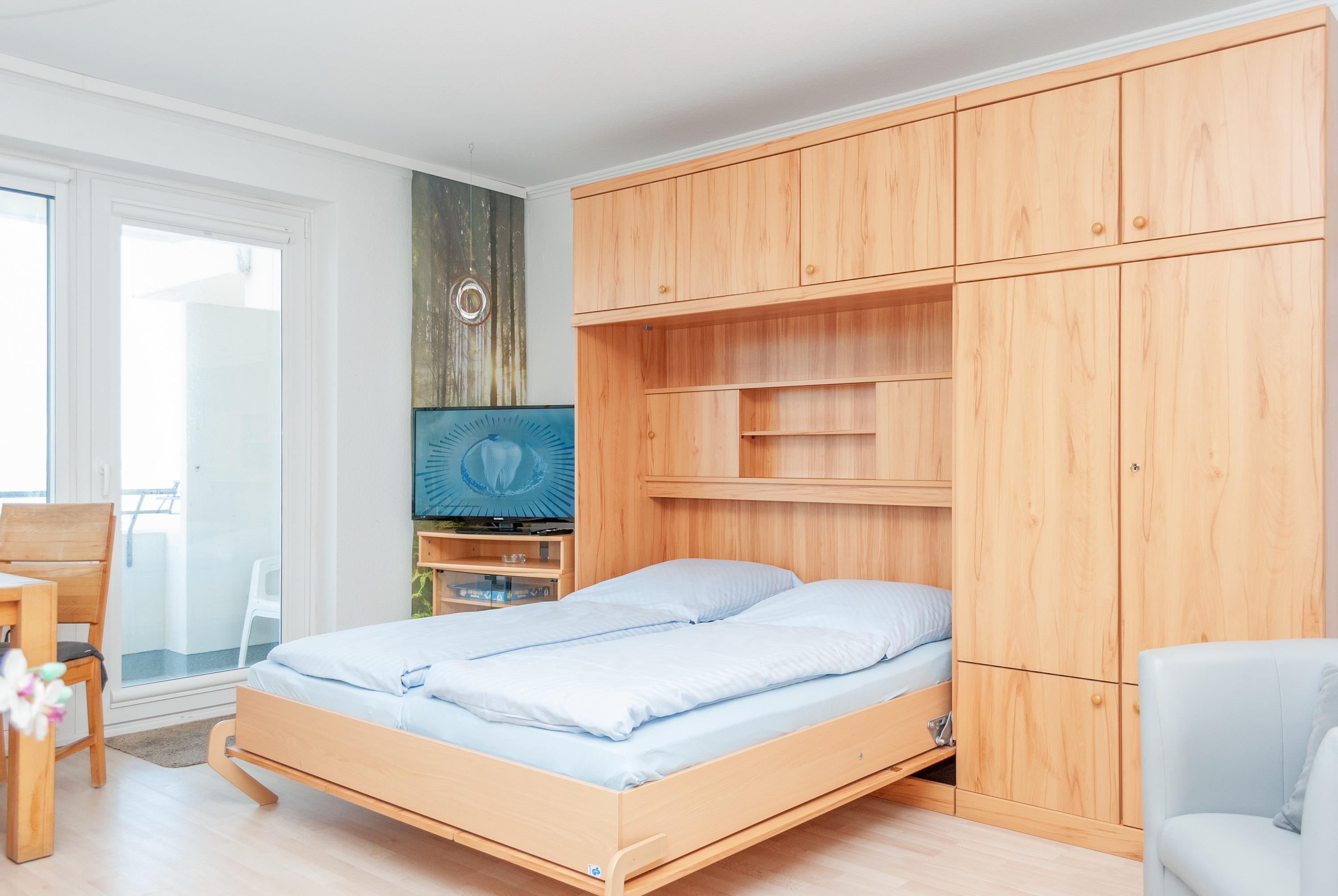 Das Apartment besteht aus einem Wohnbereich mit Schrankbett für 2 Personen, aus einem zusätzlichem Etagenbett in einer Nische im Flur und einem Badezimmer mit Dusche sowie WC. Die Ferienwohnung beinhaltet eine voll ausgestattete offene Küche.