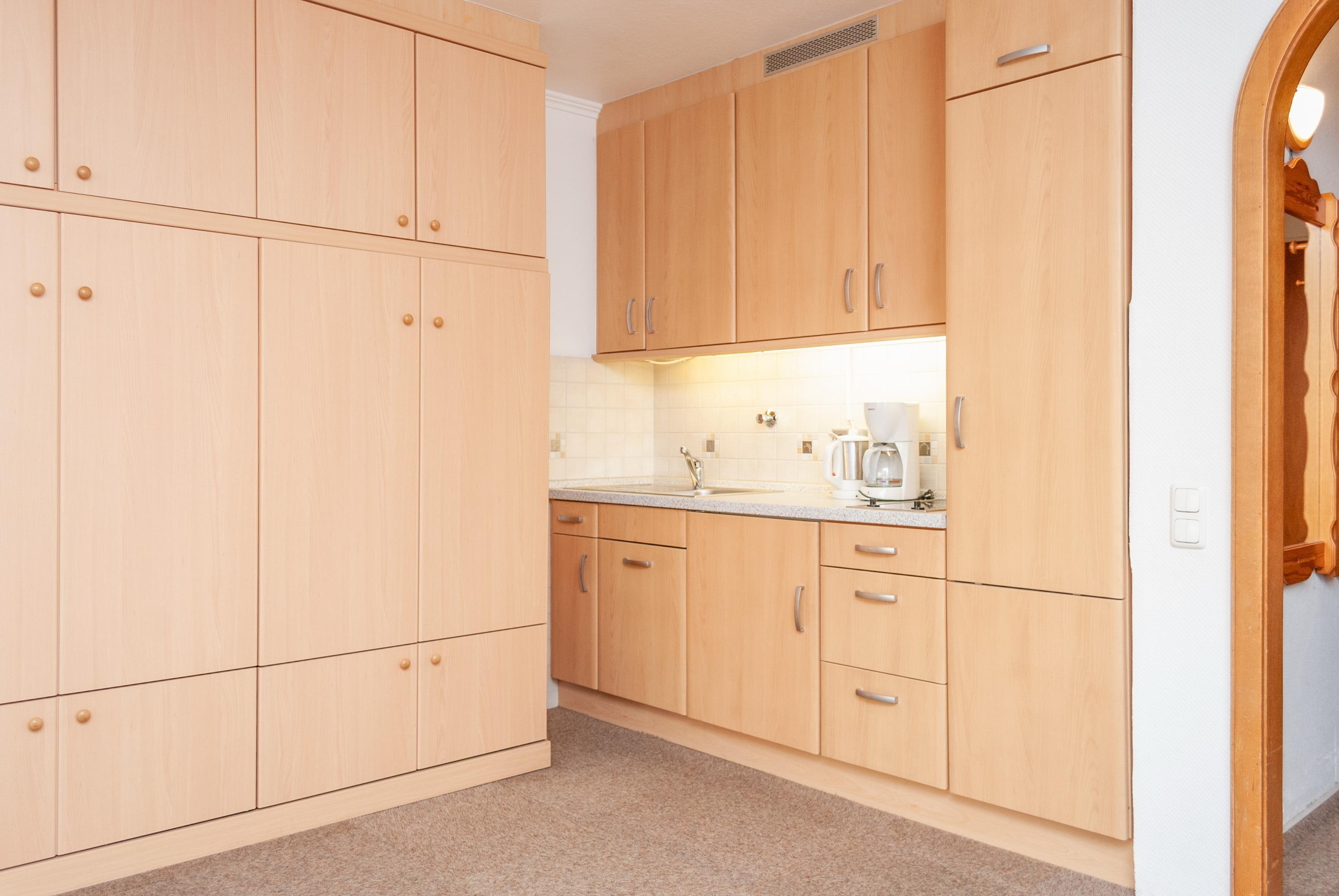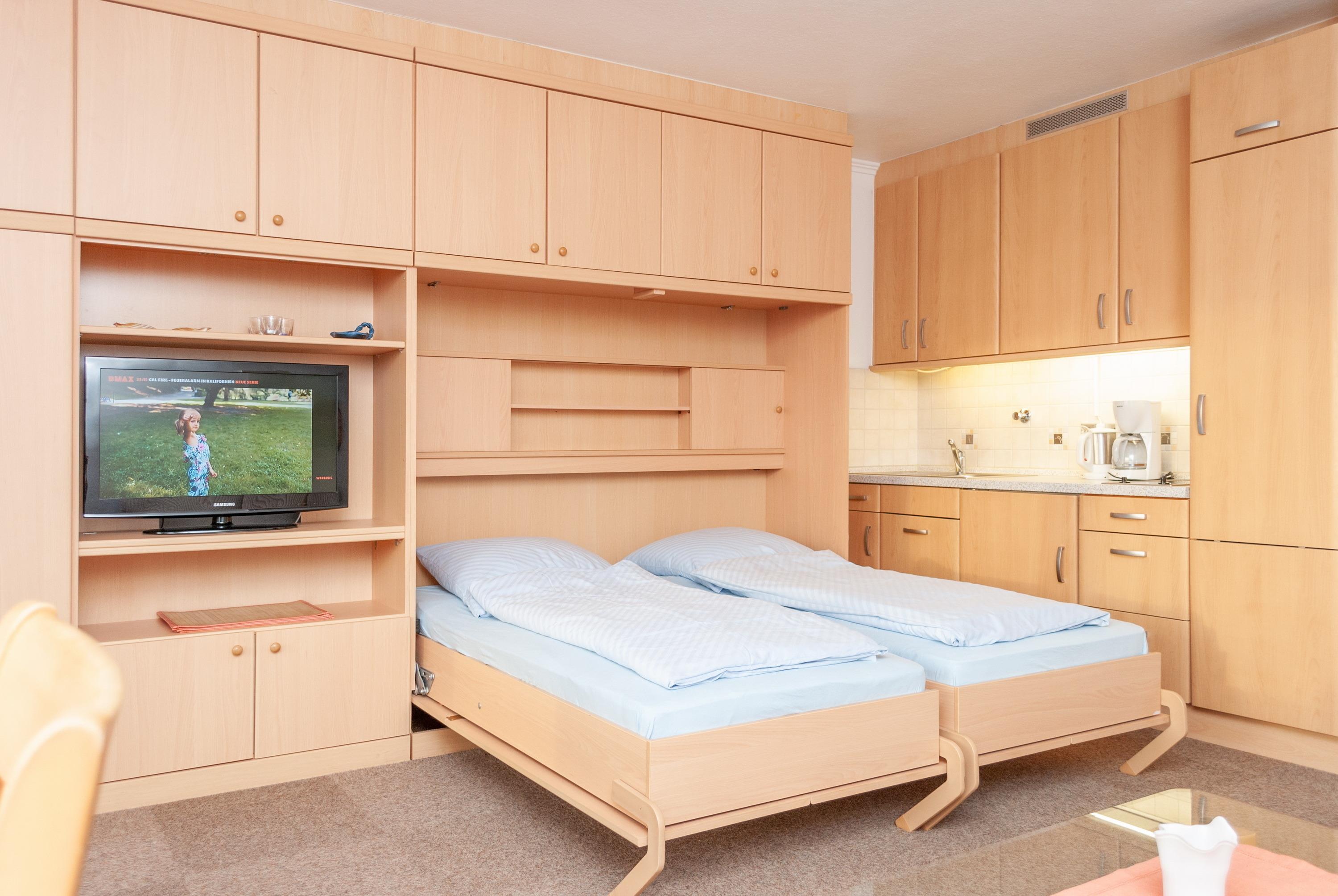 Das Apartment besteht aus einem Wohnbereich mit Schrankbett für 2 Personen, einem zusätzlichem Etagenbett in einer Nische im Flur und einem Badezimmer mit Dusche sowie WC. Die Ferienwohnung beinhaltet eine voll ausgestattete offene Küche.