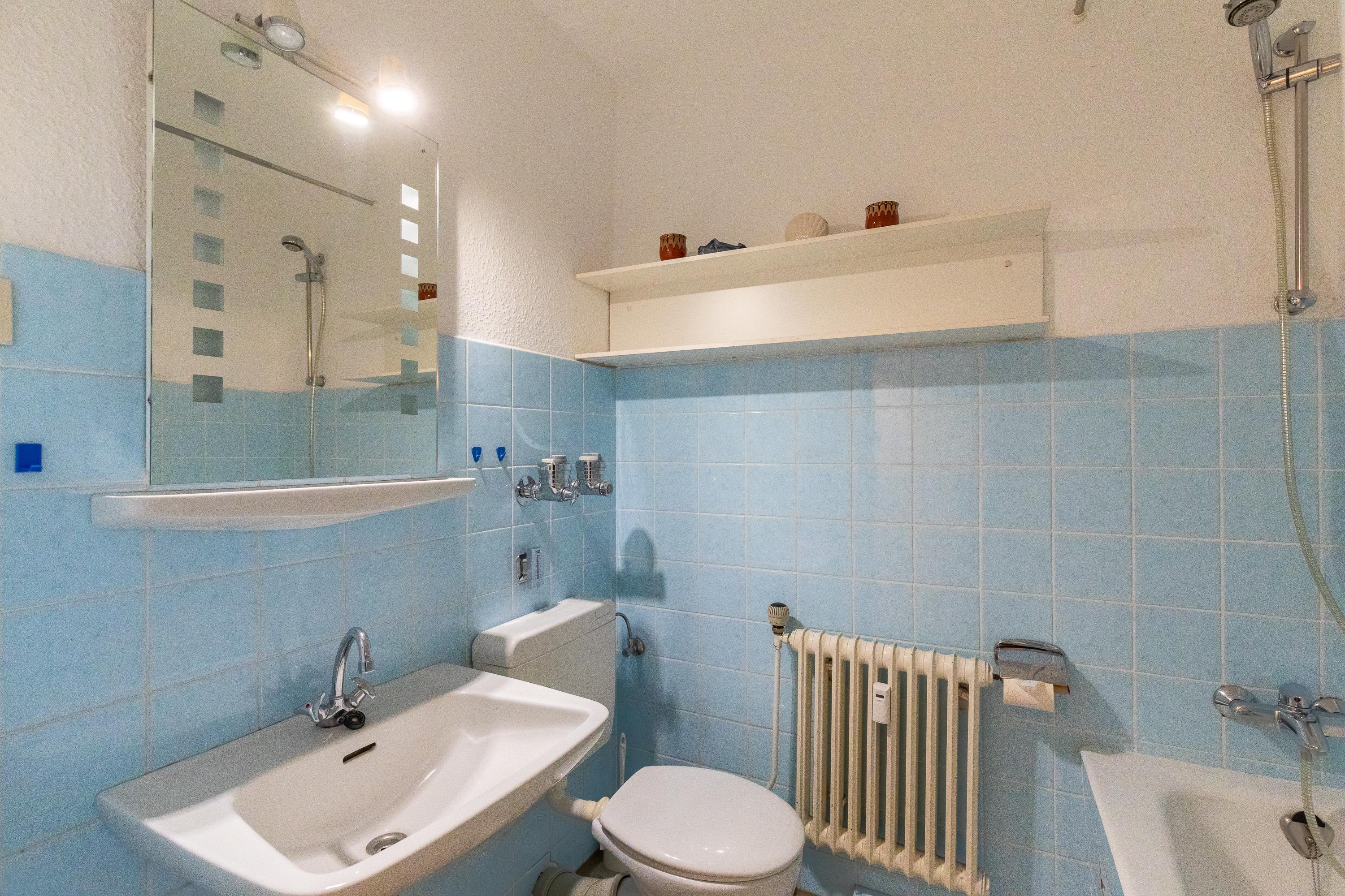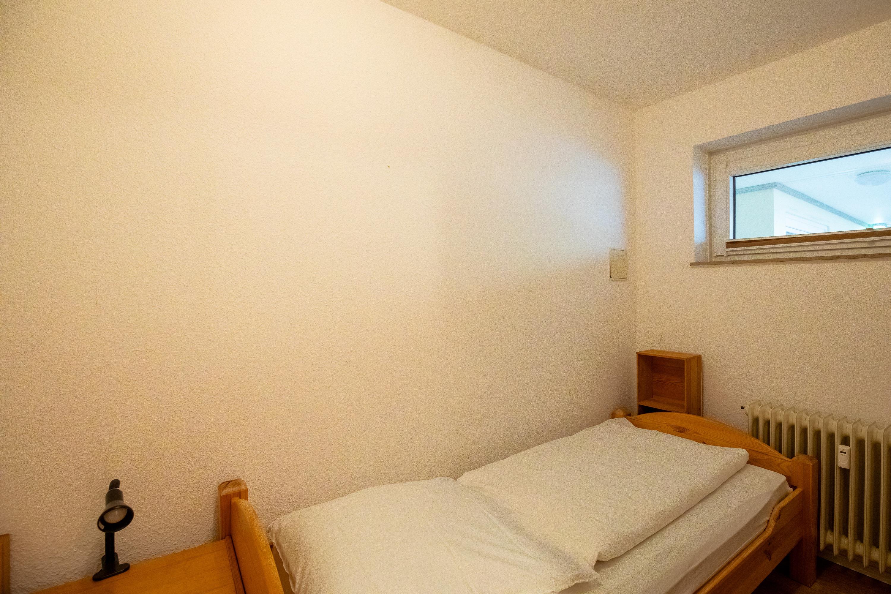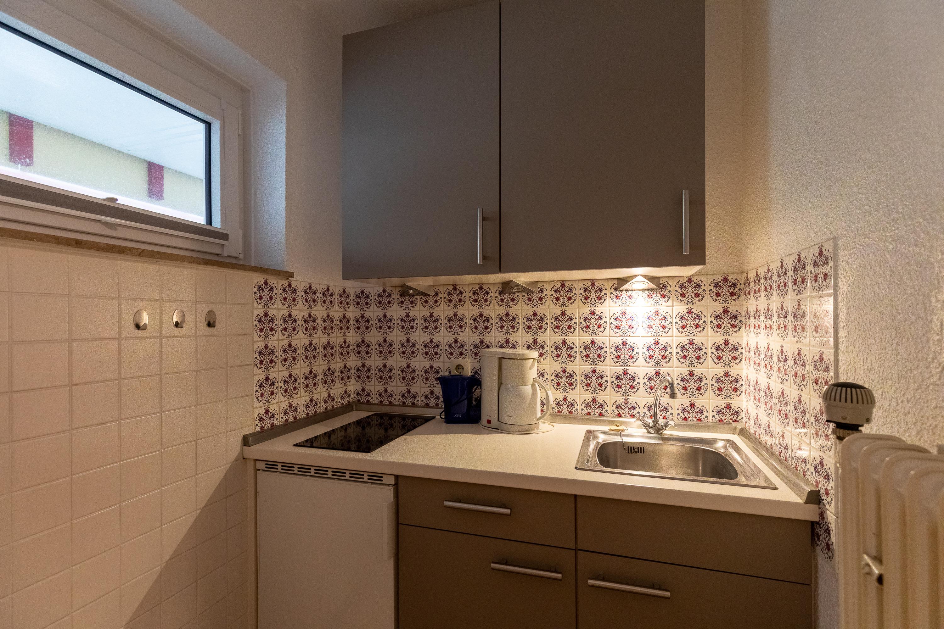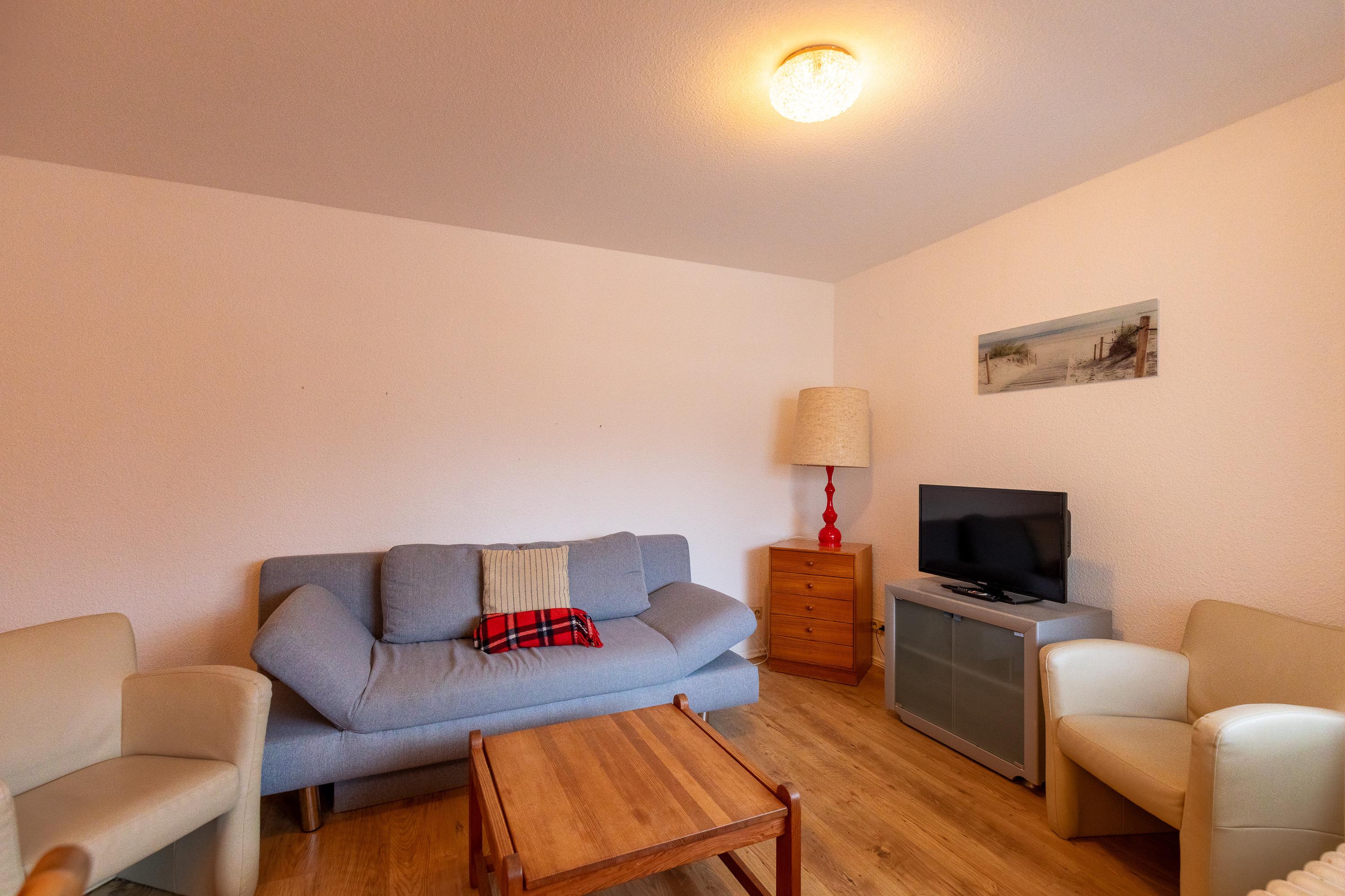 Die Wohnung verfügt über ein Schlafzimmer mit 2 Einzelbetten (90x2,00) sowie ein Badezimmer mit Badewanne (kann als Dusche genutzt werden) und WC. Die Küchenzeile verfügt über ein 2 Plattenkochfeld, Wasserkocher, Kühlschrank, Toaster, Kaffeemaschine. Das Wohnzimmer verfügt über ein Sofa (kann als Schlafsofa genutzt werden), TV und einen Essplatz, von hieraus gelangt man auf den Balkon (west).