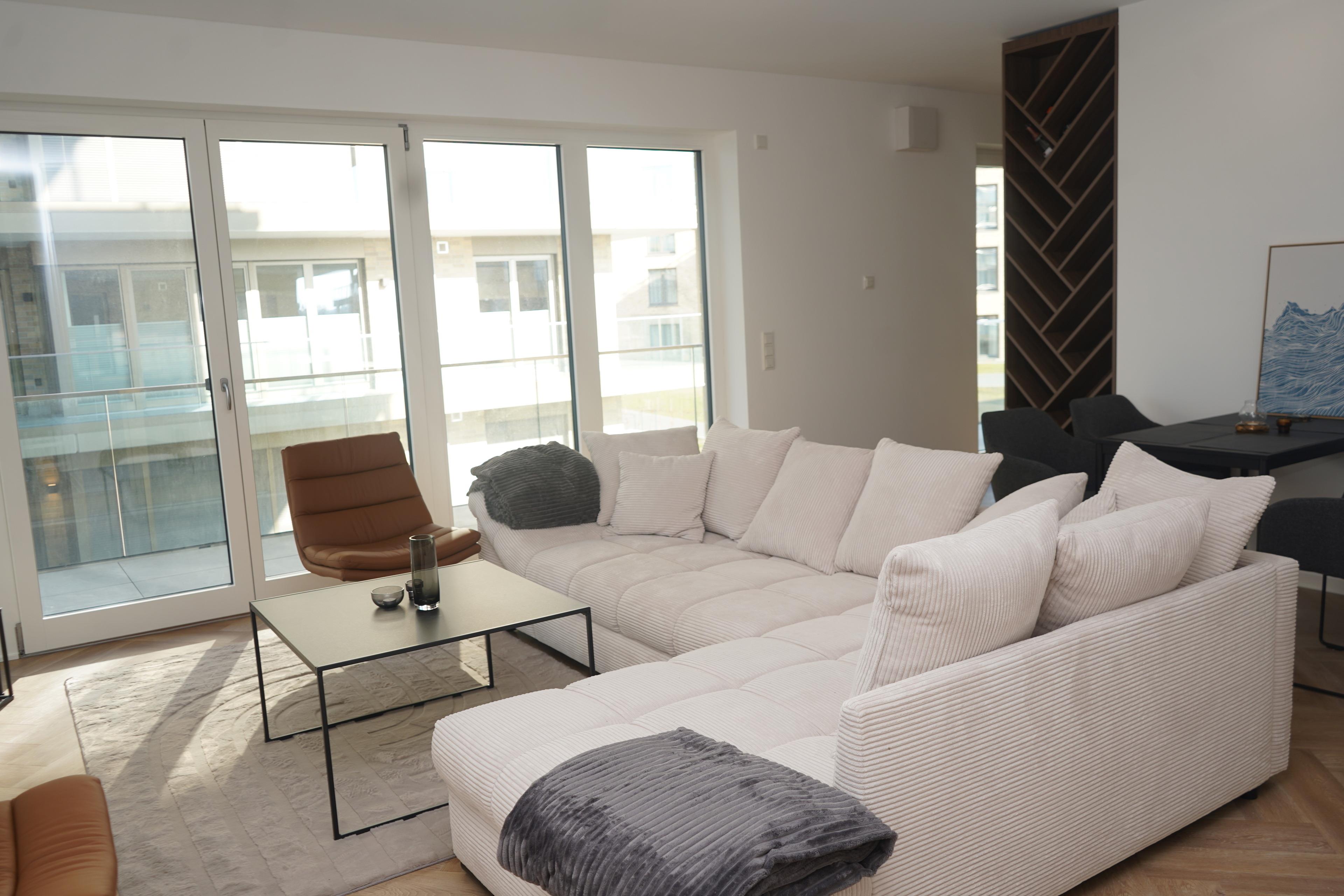 Die stilvolle Neubauwohnung überzeugt mit hochwertiger Ausstattung, liebevollen Details und einer angenehmen, einladenden Atmosphäre – inklusive schönem Meerblick.