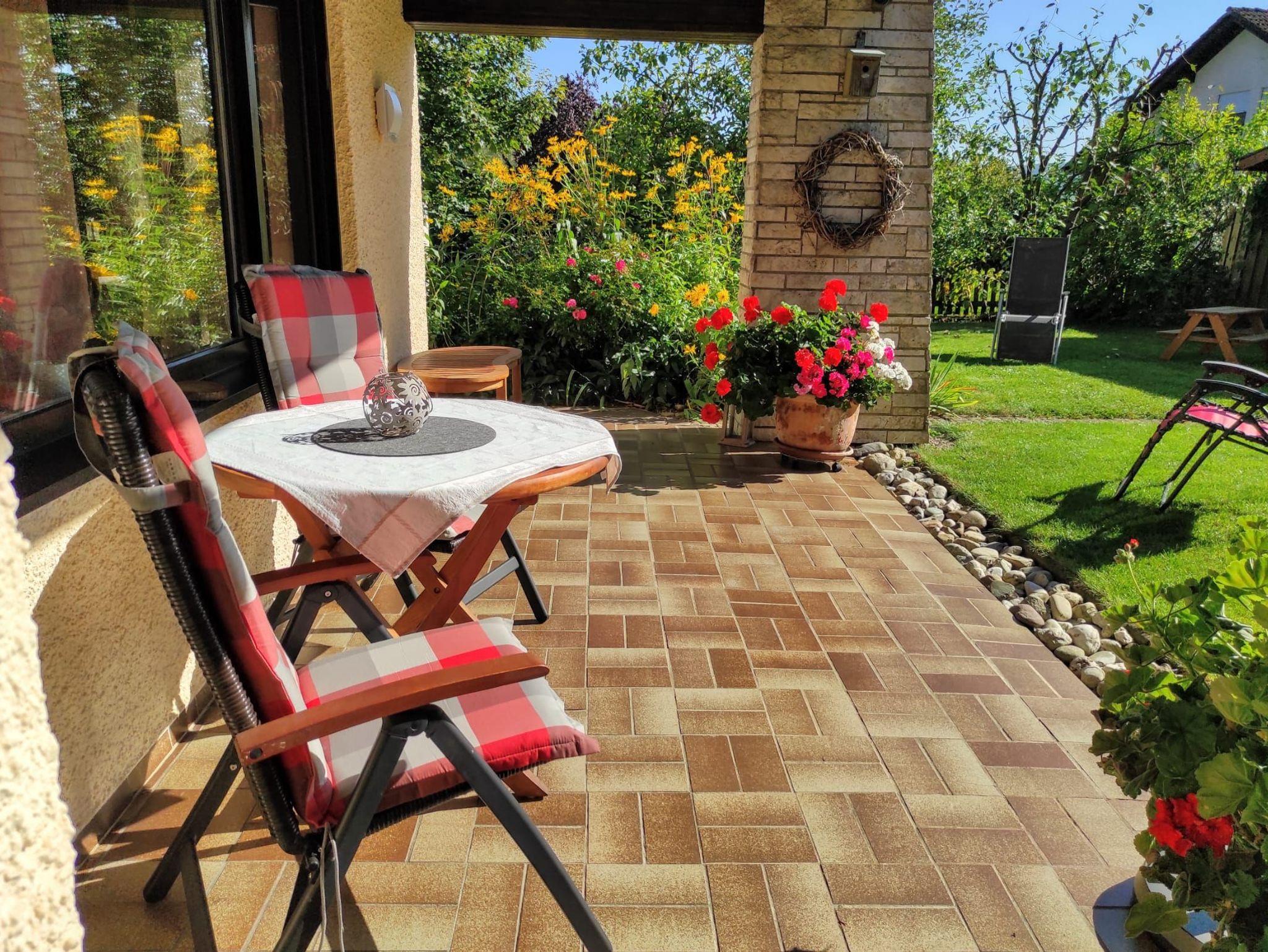 Genießen Sie auf unserer schönen, überdachten Gartenterrasse mit Liegewiese ein Frühstück zum Morgenstart oder auch ein abendliches Grillen. Gerne bieten wir Ihnen auch Sonnenliegen für die Entspannung nach sportlichen Tagen. Während Ihres Aufenthaltes steht Ihnen für Ihr mitgebrachtes Endgerät ein kostenfreier WLAN-Zugang zur Verfügung. Parkmöglichkeiten finden Sie unmittelbar vor der Wohnung.