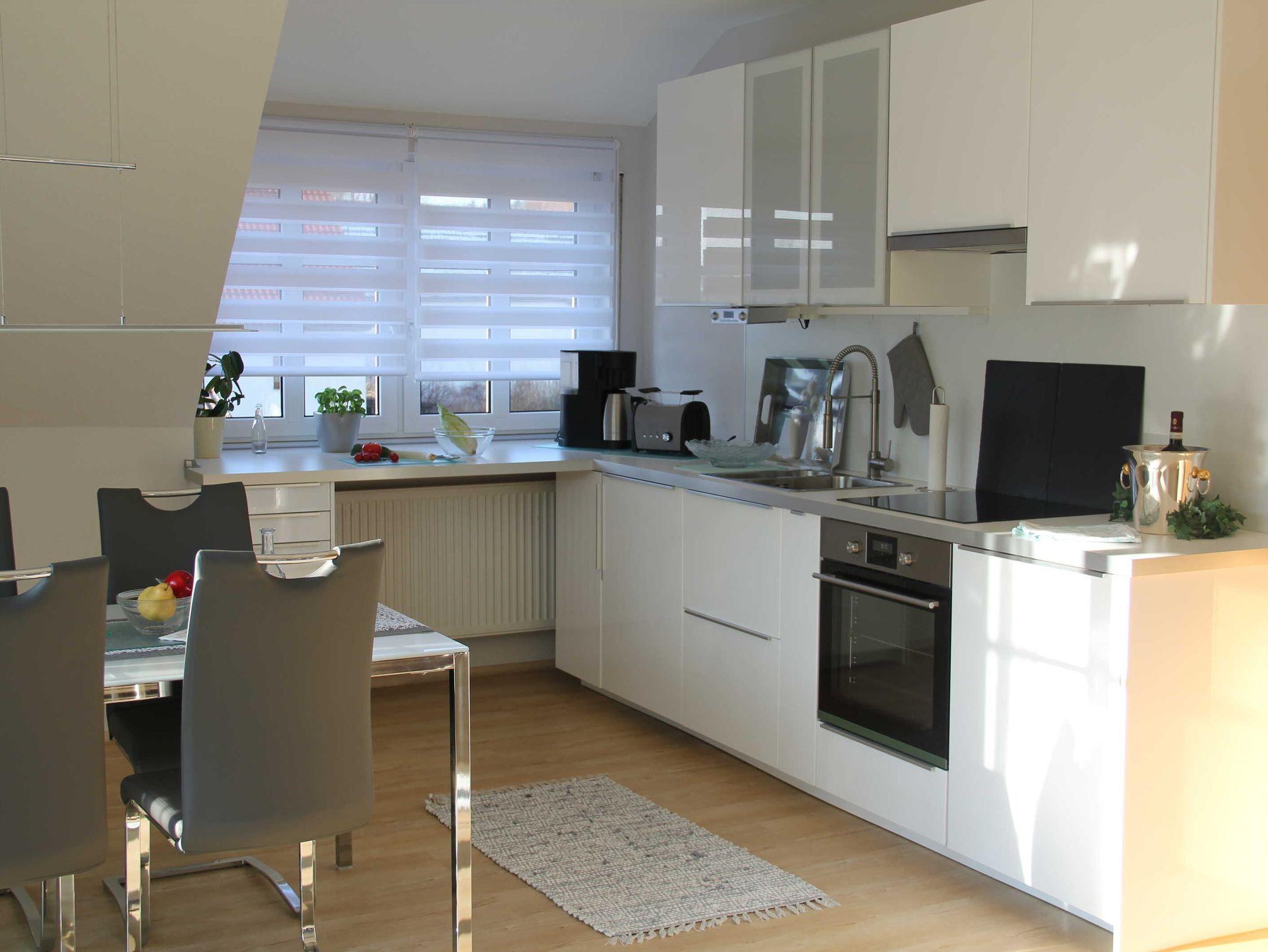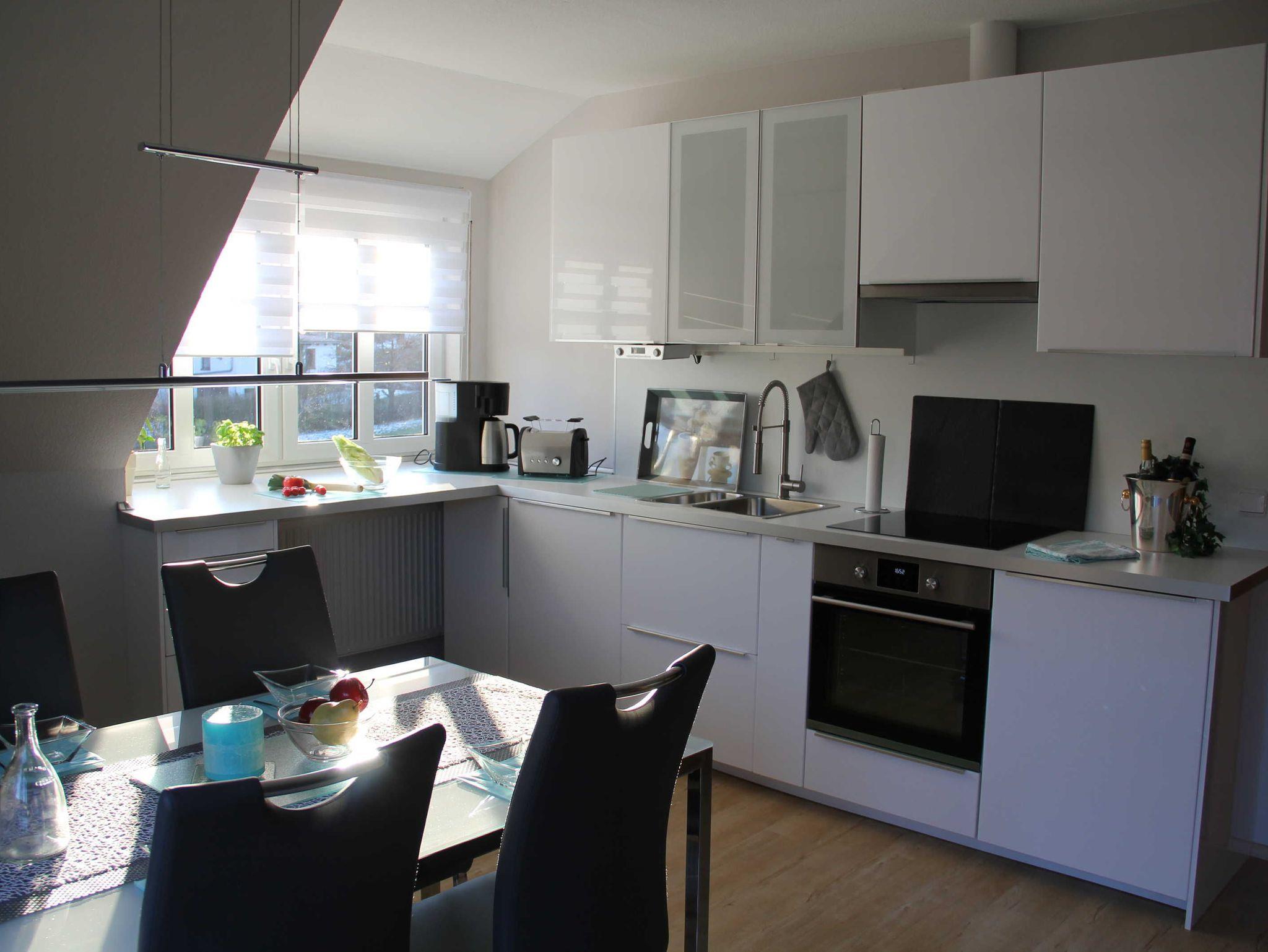 Die vollausgestattete Küche lässt nahezu keine Wünsche offen: Geschirrspüler, Kühlschrank mit Gefrierfach, Induktionskochfeld, Backofen, Mikrowelle, Kaffeemaschine, Wasserkocher und Toaster sorgen dafür, dass Sie sich mühelos selbst versorgen können. Koch- und Essgeschirr sowie eine Grundausstattung an Gewürzen sind selbstverständlich vorhanden.