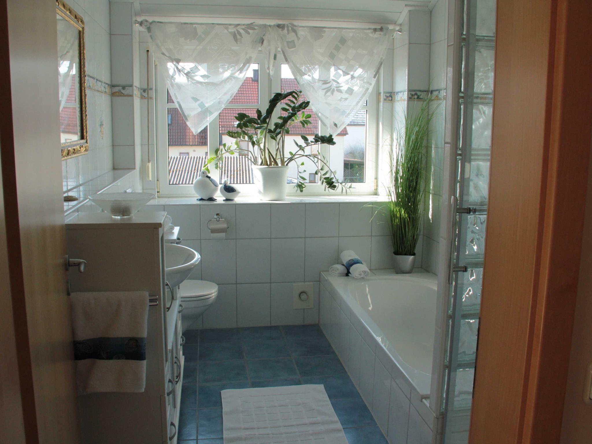 Das Tageslichtbad (7 m²) verwöhnt mit Badewanne, Dusche, modernen Badmöbeln, Kosmetikspiegel, Föhn, Handseife und WC.