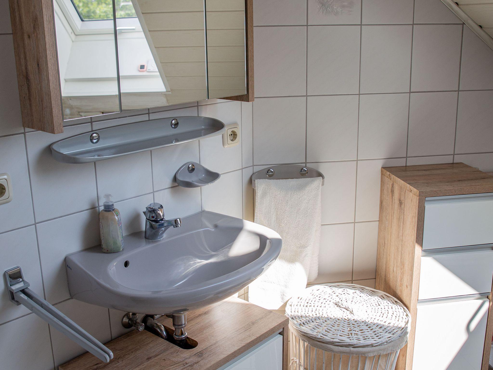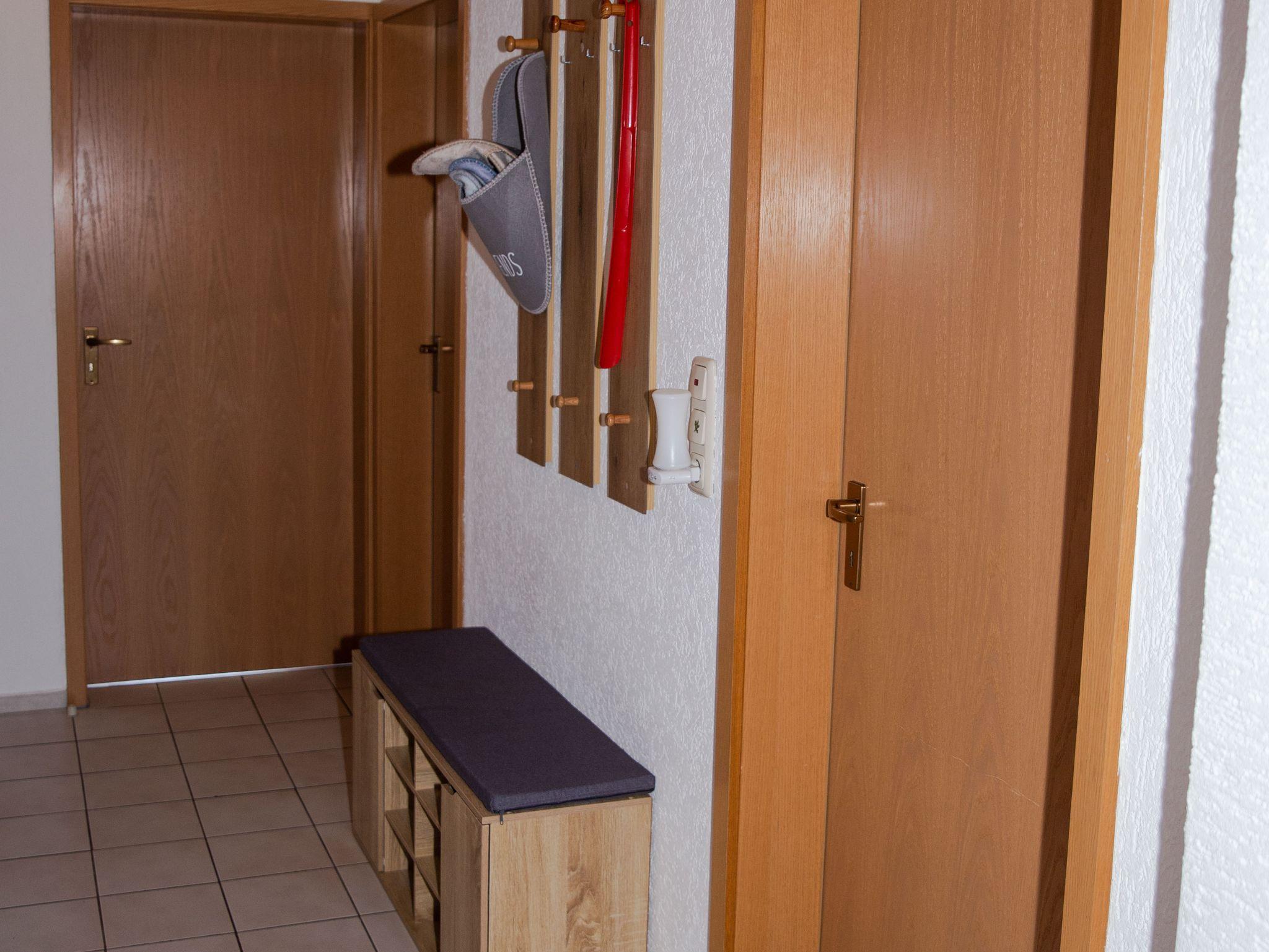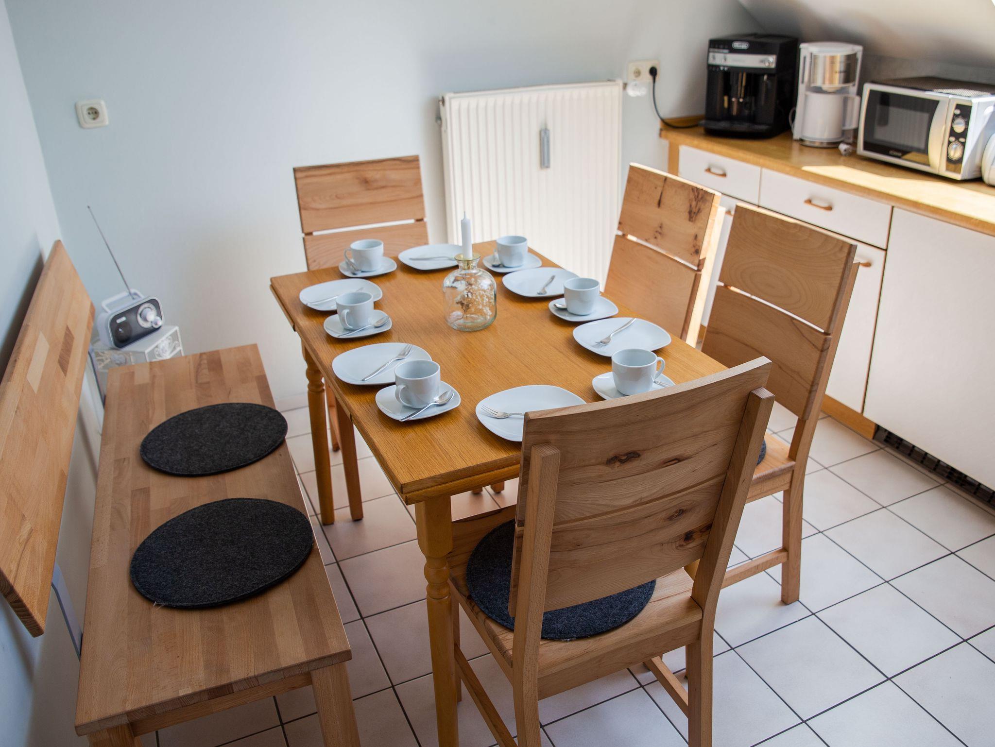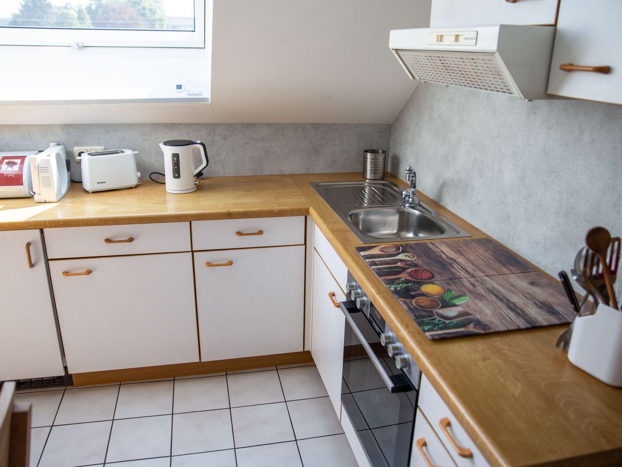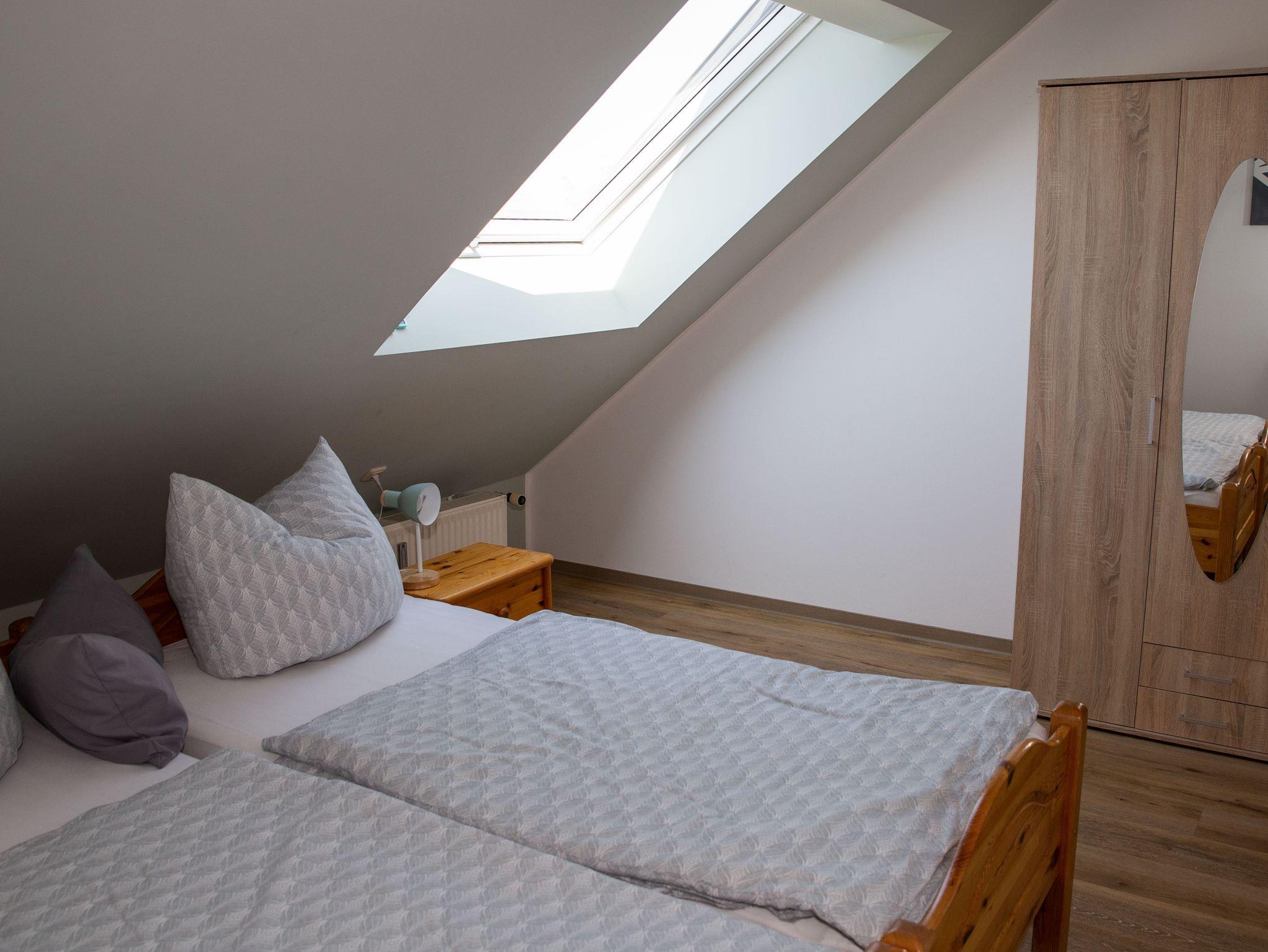 Unsere Dachgeschosswohnung hat 3 Schlafräume mit 6 Betten, ein geräumiges Wohnzimmer, eine voll eingerichtete Wohnküche sowie ein ein Bad mit Wanne, Dusche und 2 WC. Freies W-LAN sowie SAT-TV und Radio sind vorhanden.