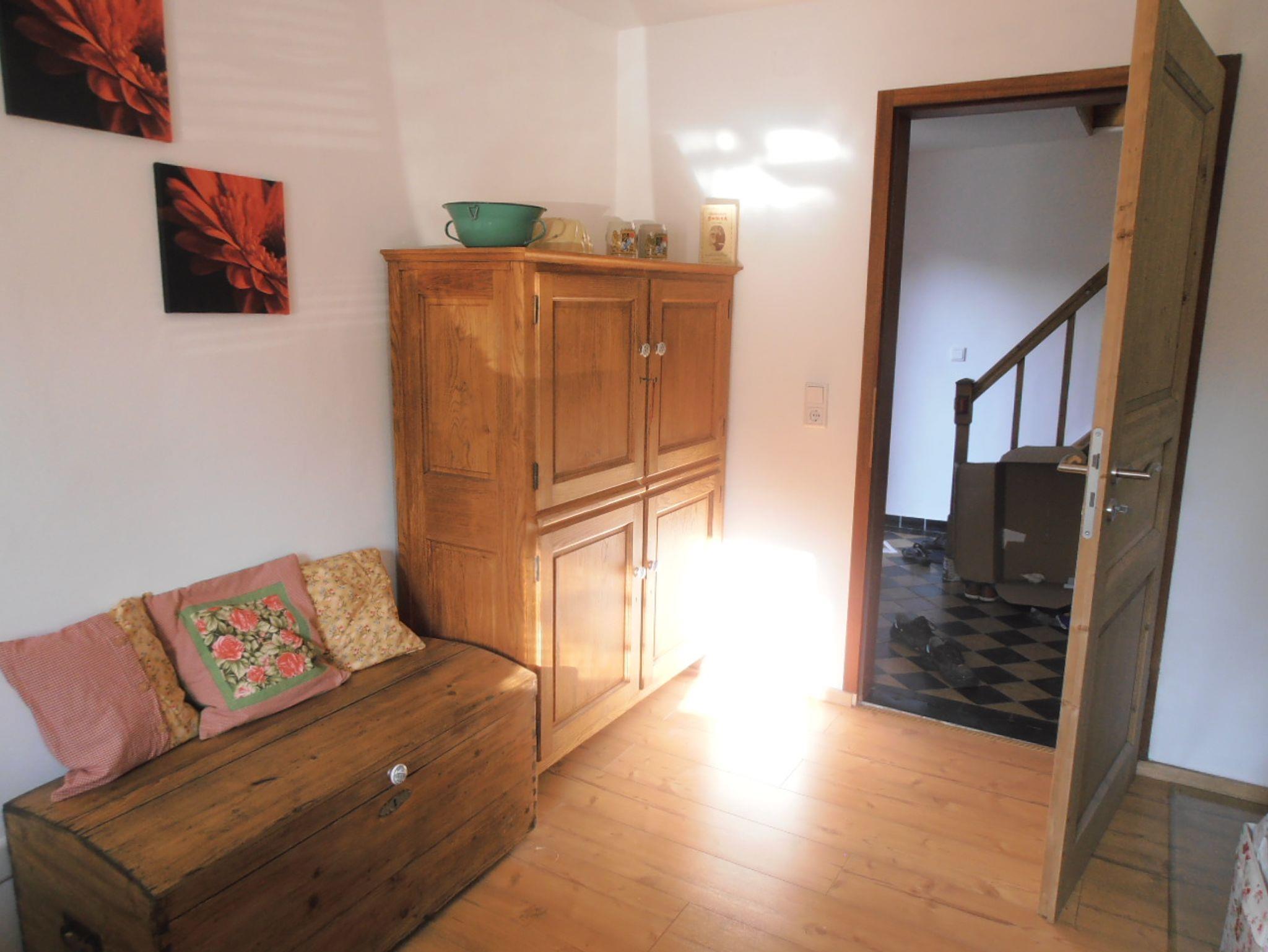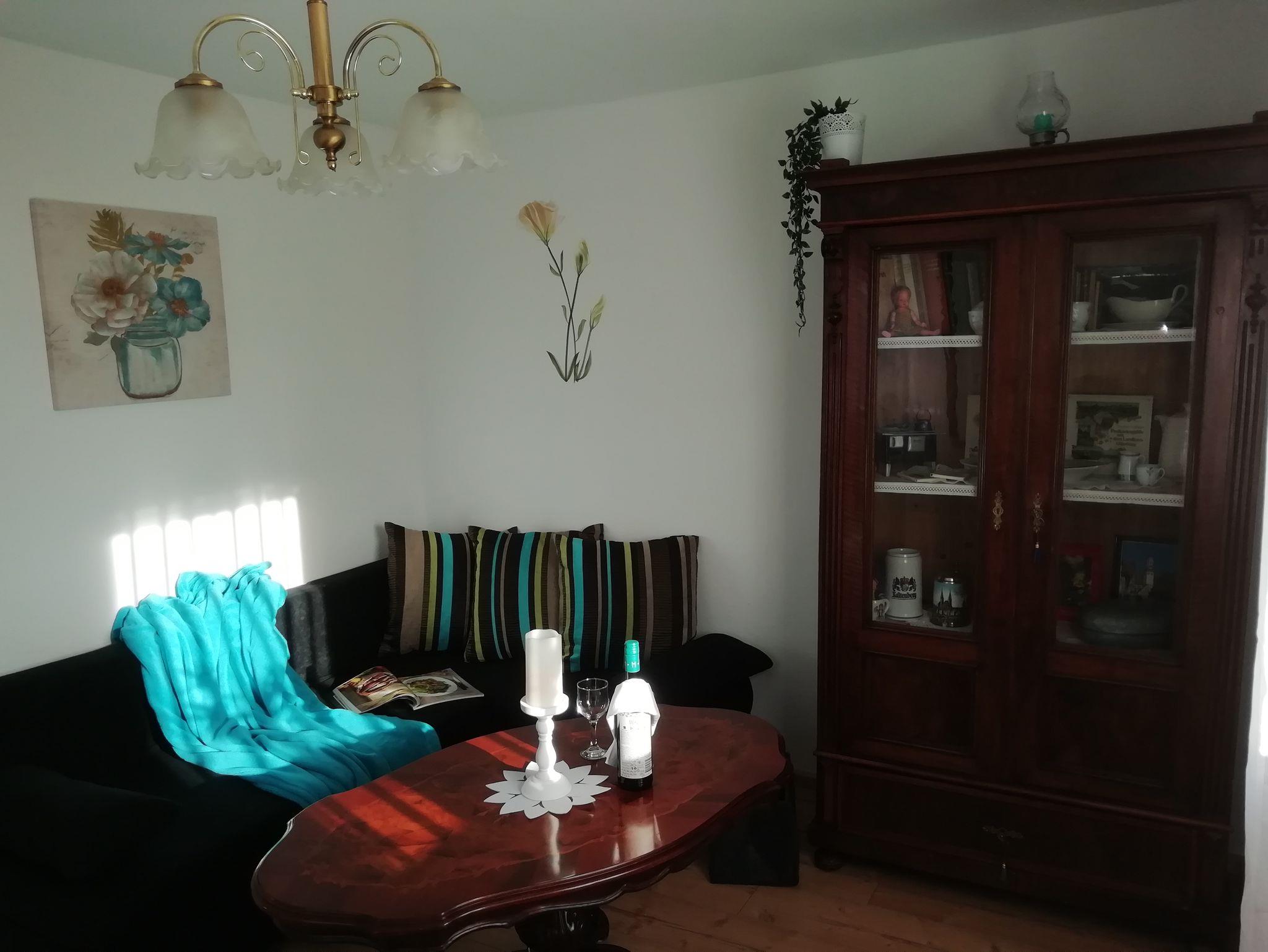 Die Wohnküche bietet Platz für 4 Personen und ist ausgestattet mit einem Backofen mit Ceranfeld, Filterkaffeemaschine, Wasserkocher und Toaster ,sowie Geschirr und Töpfen. Mit dem urigen und rustikalen Holzküchenofen ist es möglich zusätzlich zu heizen und eine romantische, wohlige Wärme zu genießen, oder wie die Großmutter damals darauf zu kochen. Natürlich steht Ihnen ein Kühlschrank mit Gefrierfach zur Verfügung.