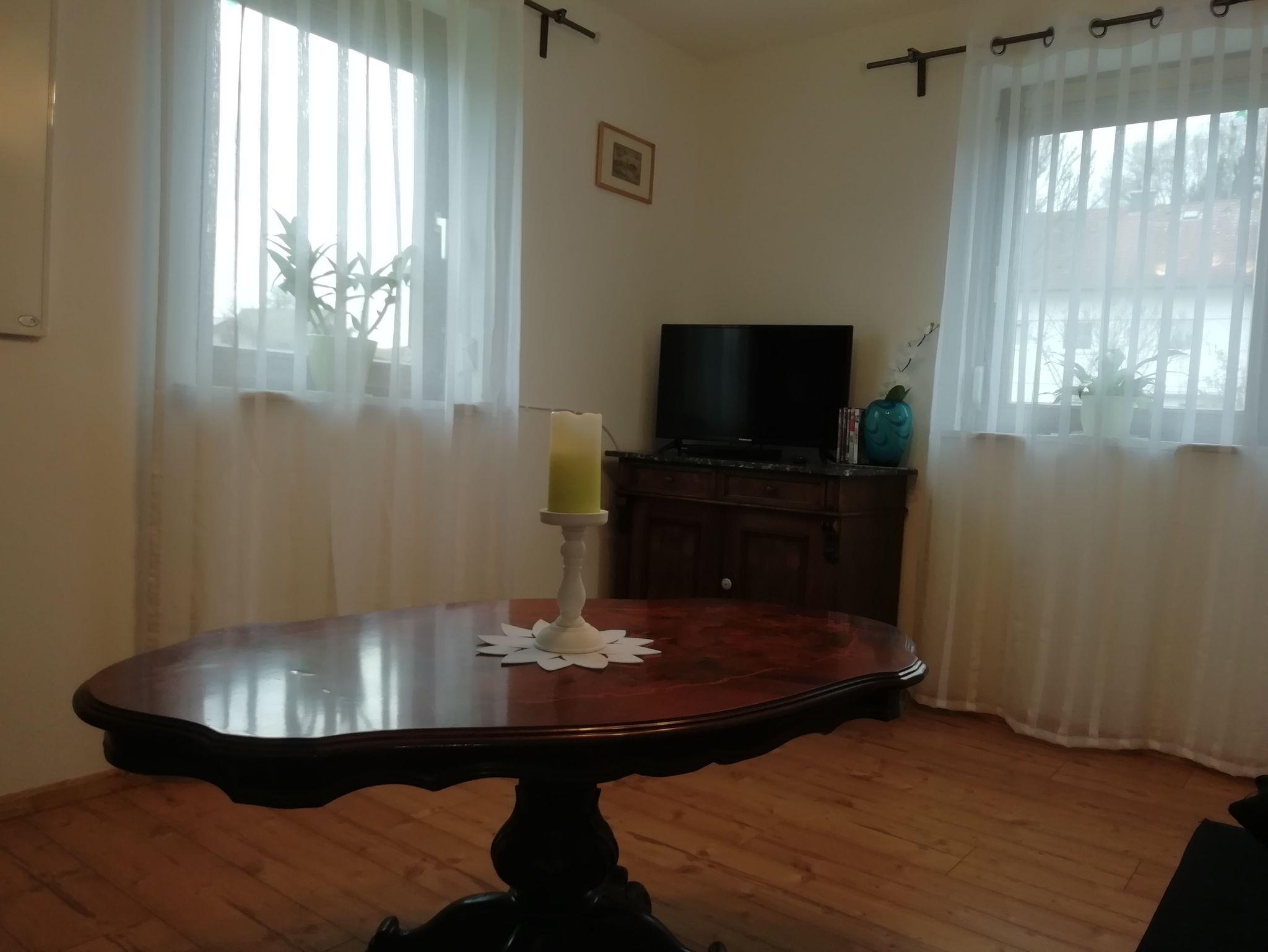 Das Wohnzimmer ist mit Originalmöbeln aus der Gründerzeit eingerichtet. Ein Sofa und der Flachbildfernseher mit Sat.-Anschluß, DVD Player und eine kleine Auswahl an DVD Filmen lassen Sie gemütliche Abende verbringen. Gerne dürfen Sie in unserem antiquarischen Fundus stöbern.