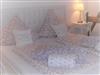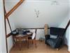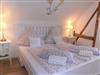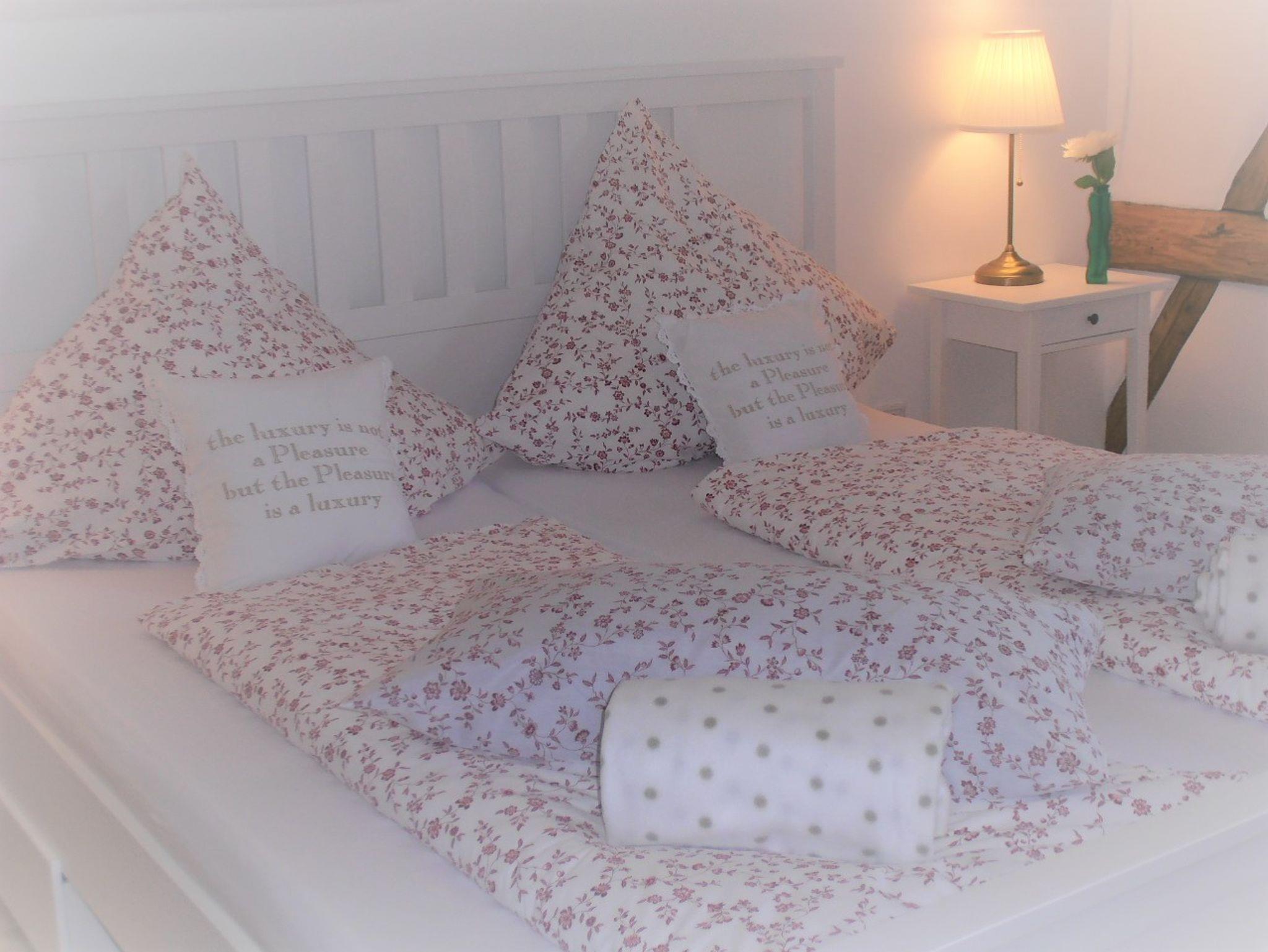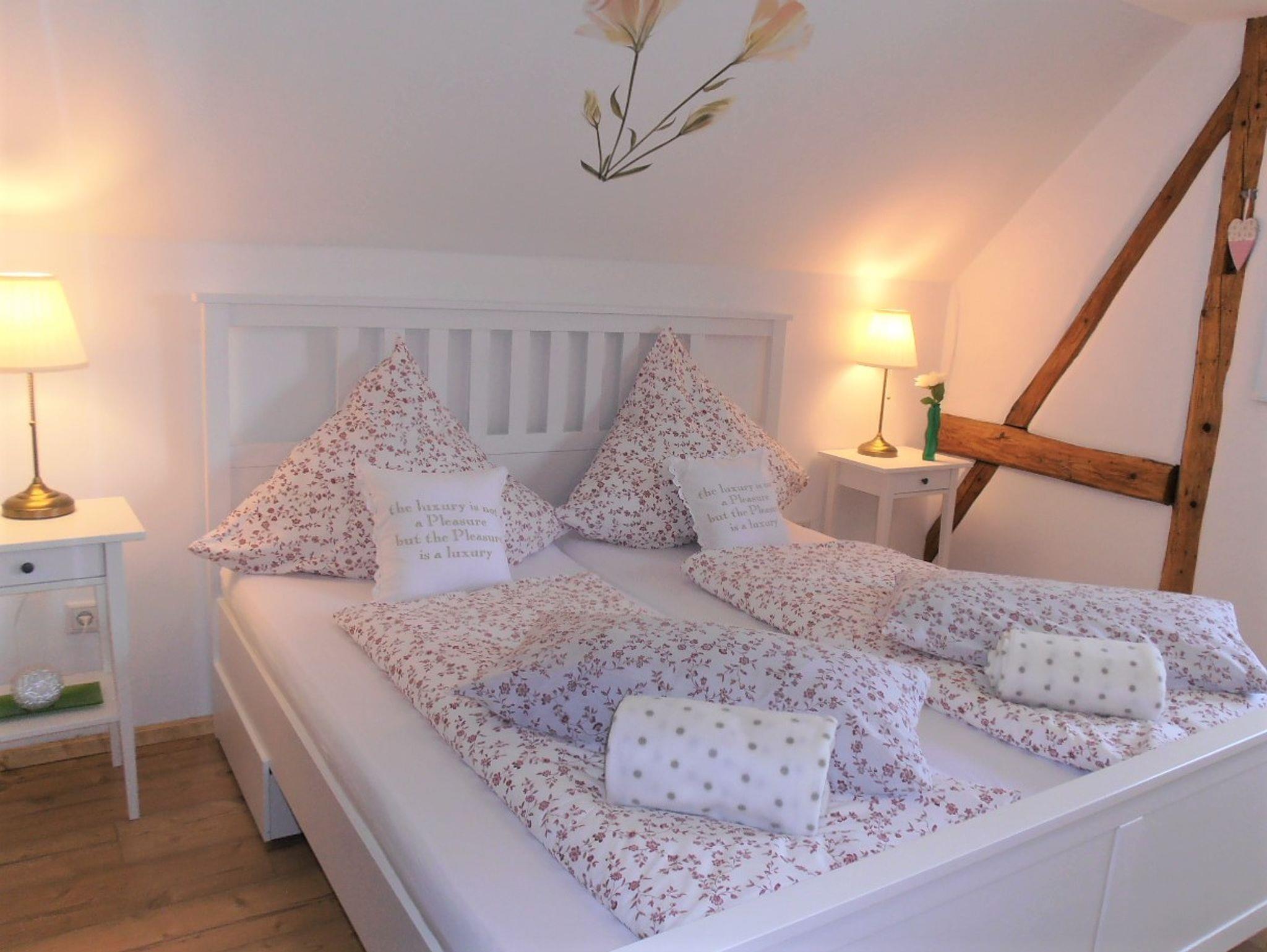 Das großzügige Schlafzimmer mit freigelegten Fachwerk ist mit einem Landhaus-Doppelbett ausgestattet. Ebenso steht hier eine gemütliche Couch,auf der zusätzlich bis zu 2 Personen schlafen können.